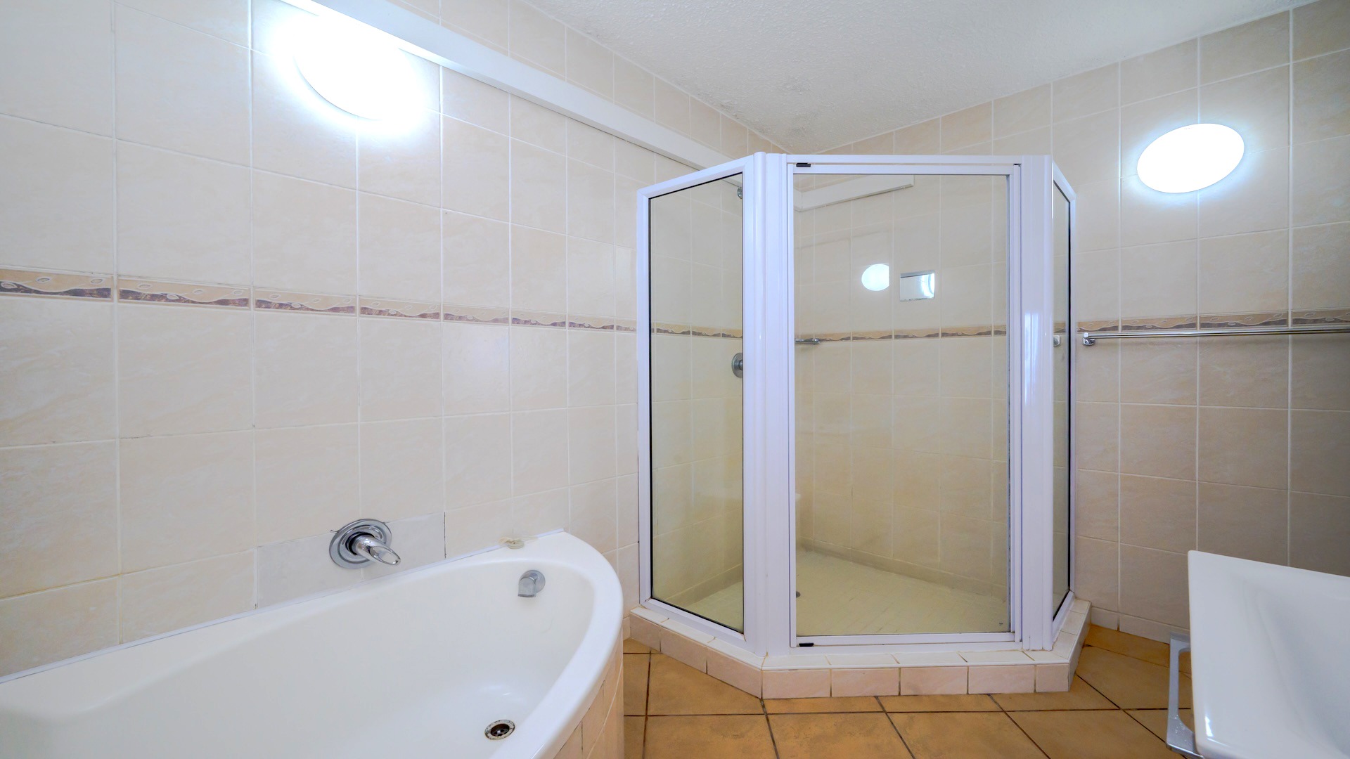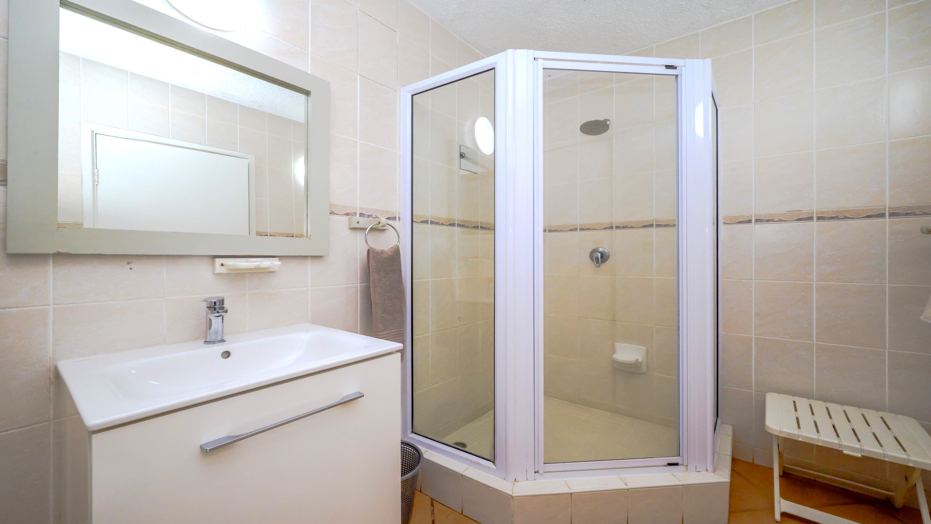 There are three well-proportioned bedrooms, each with built-in cupboards and ceiling fans. The main bedroom includes a private en-suite bathroom and opens directly onto the patio, offering uninterrupted sea views the moment you wake. Bedrooms two and three share a neat family bathroom.