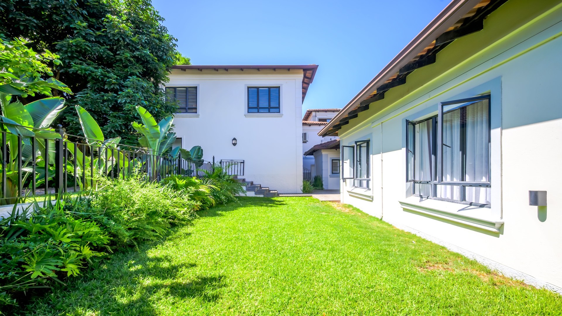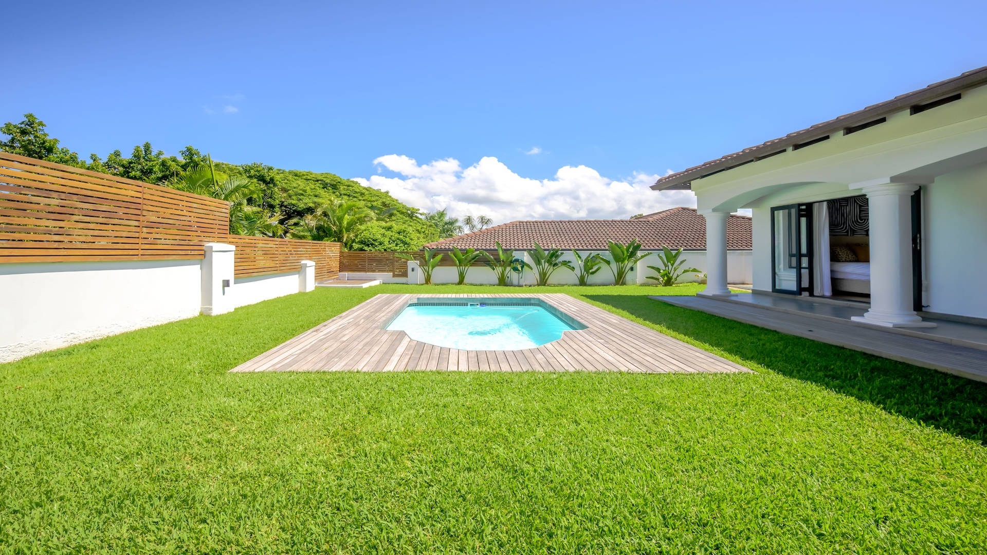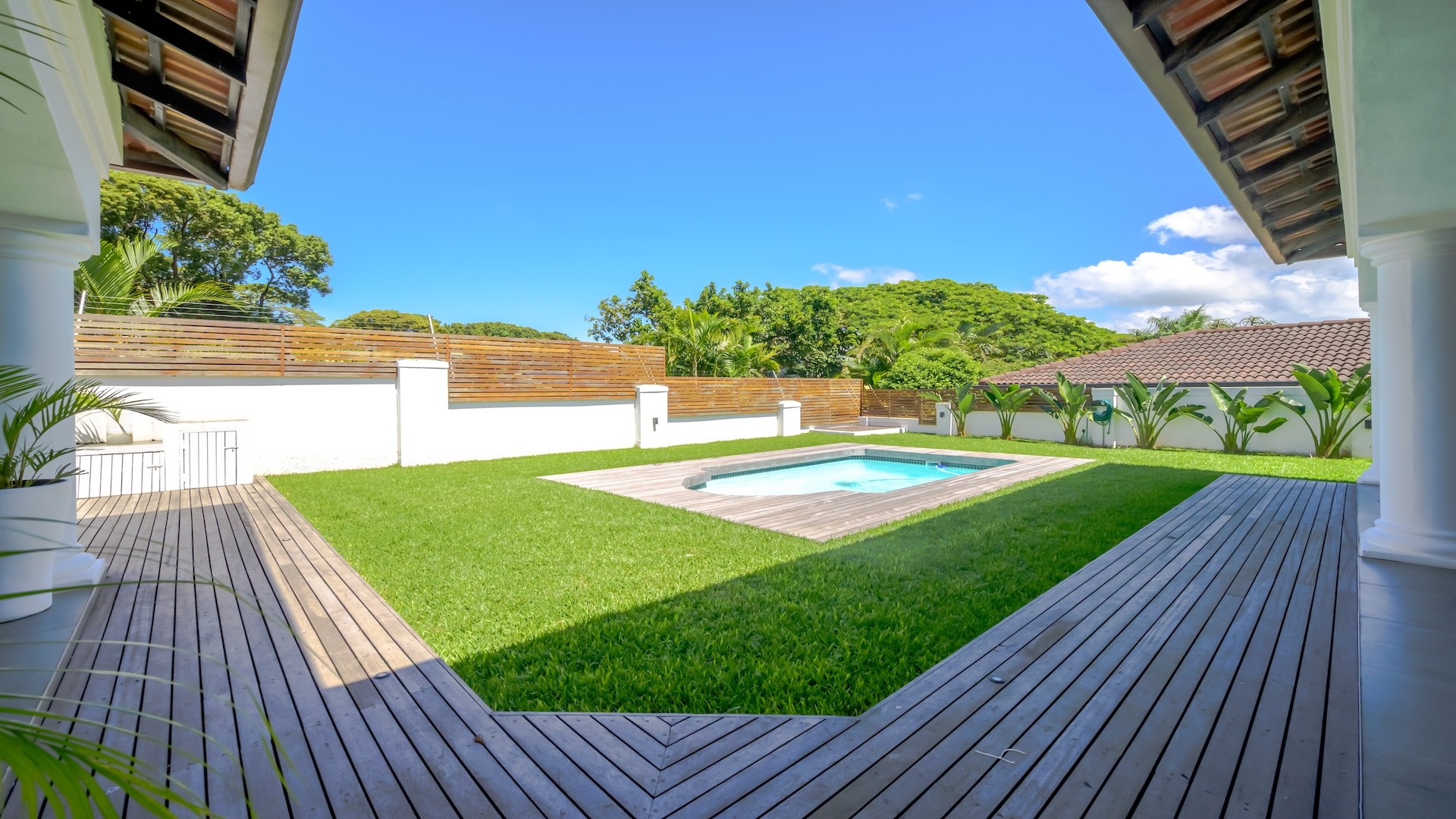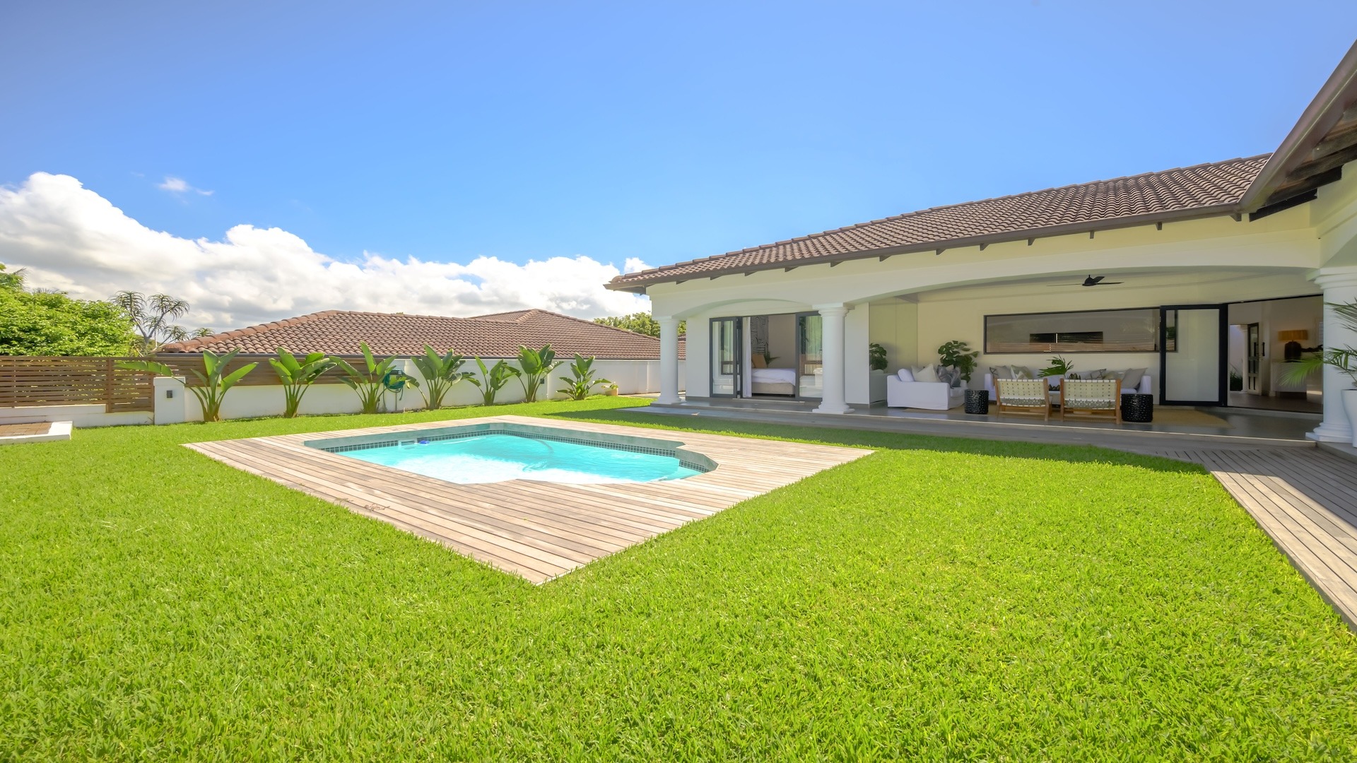 sparkling swimming pool and a lush landscaped garden—perfect for hosting family and friends in a relaxed estate setting.