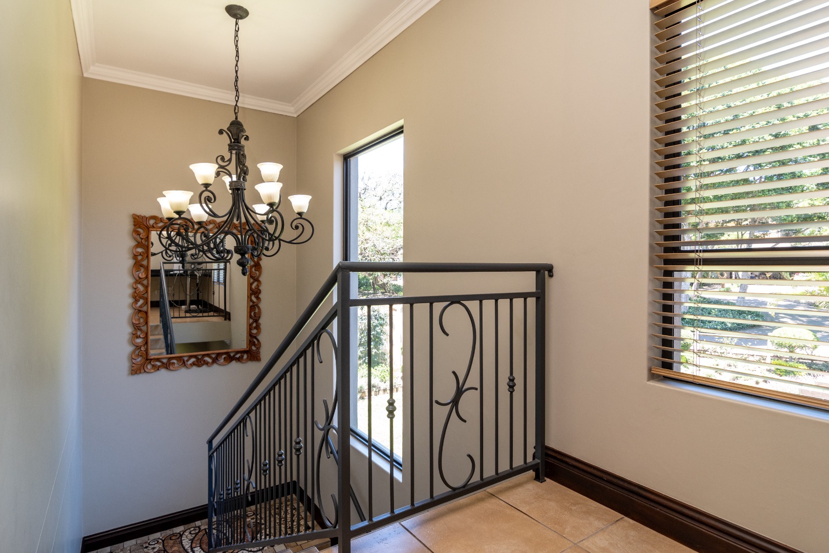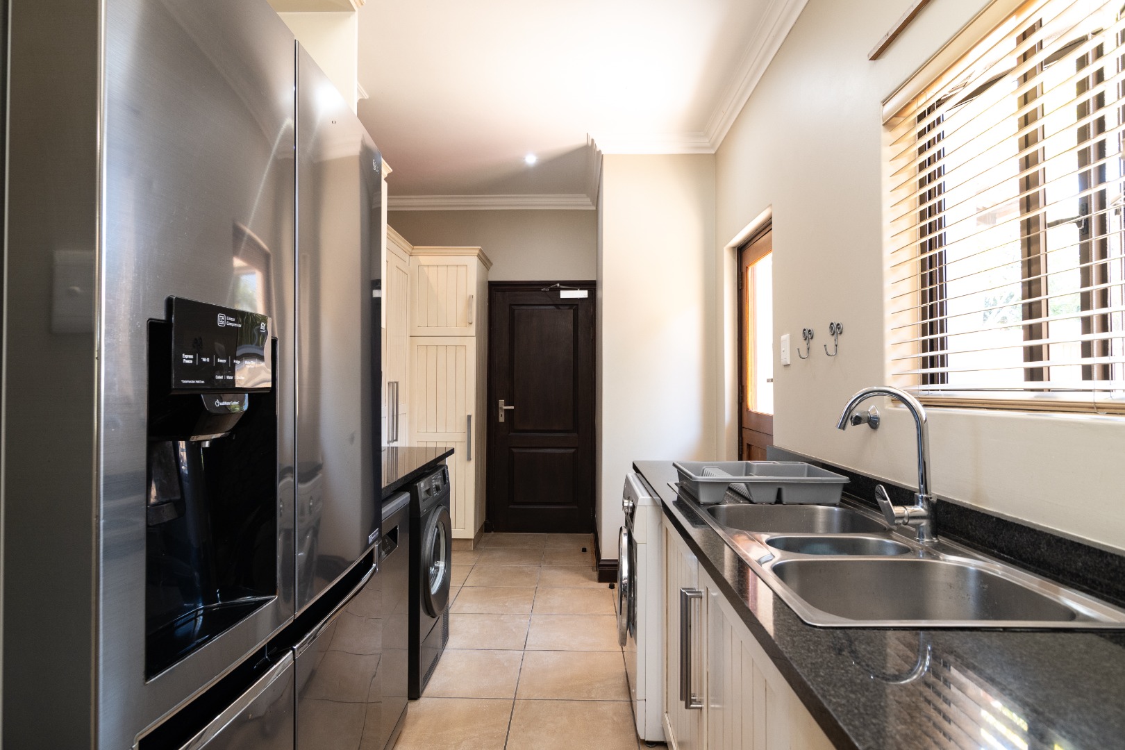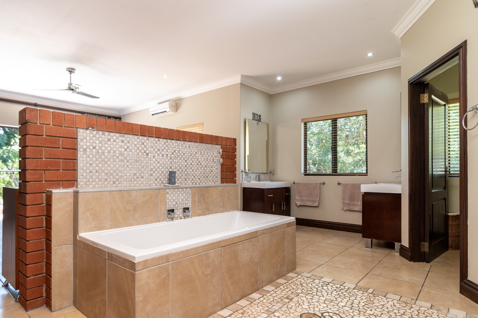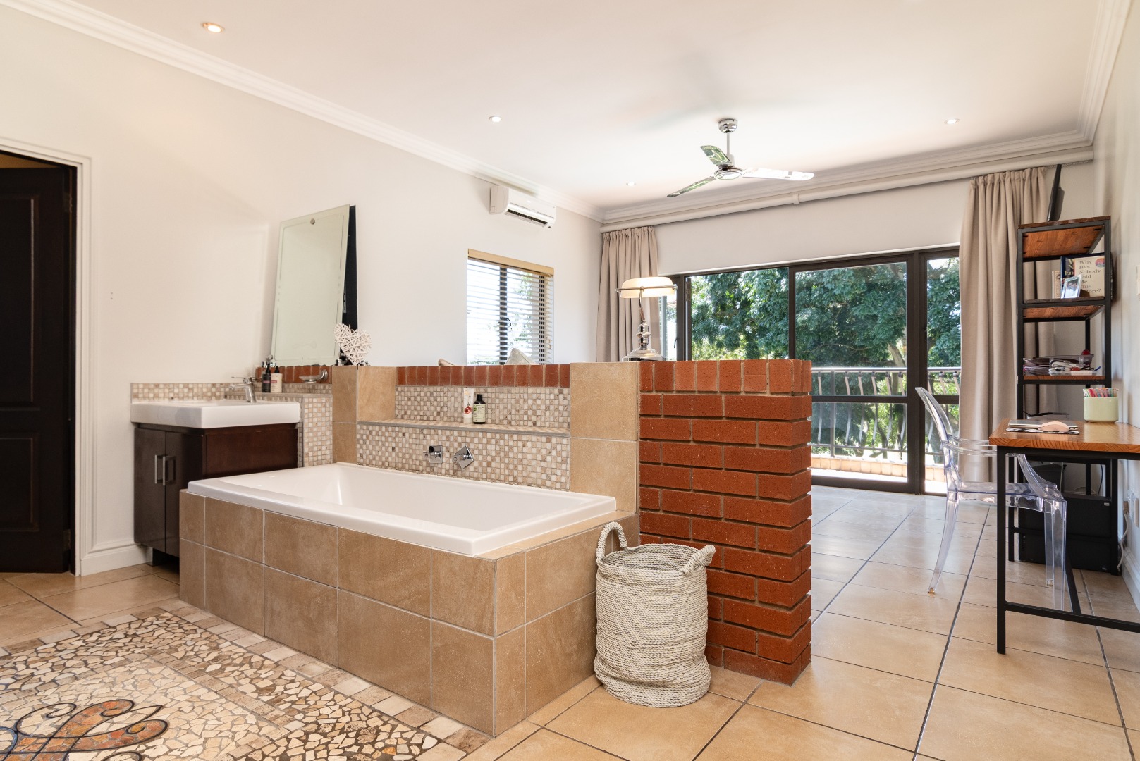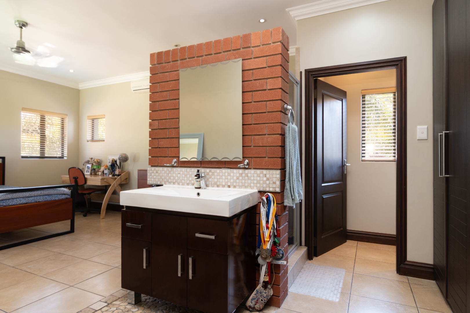 Upstairs, three generously sized en-suite bedrooms deliver ultimate comfort, with the expansive master suite featuring a spacious open plan bathroom, his and hers vanities, a bath, double shower heads, and a separate toilet. Ample built-in cupboards line the master bedroom, and a Juliet balcony provides picturesque views of the garden and golf course. The second bedroom also offers an open plan bathroom with a bath and seperate toilet and a Juliet balcony with delightful vistas. The third bedroom has a shower and separate toilet also within an open plan layout.