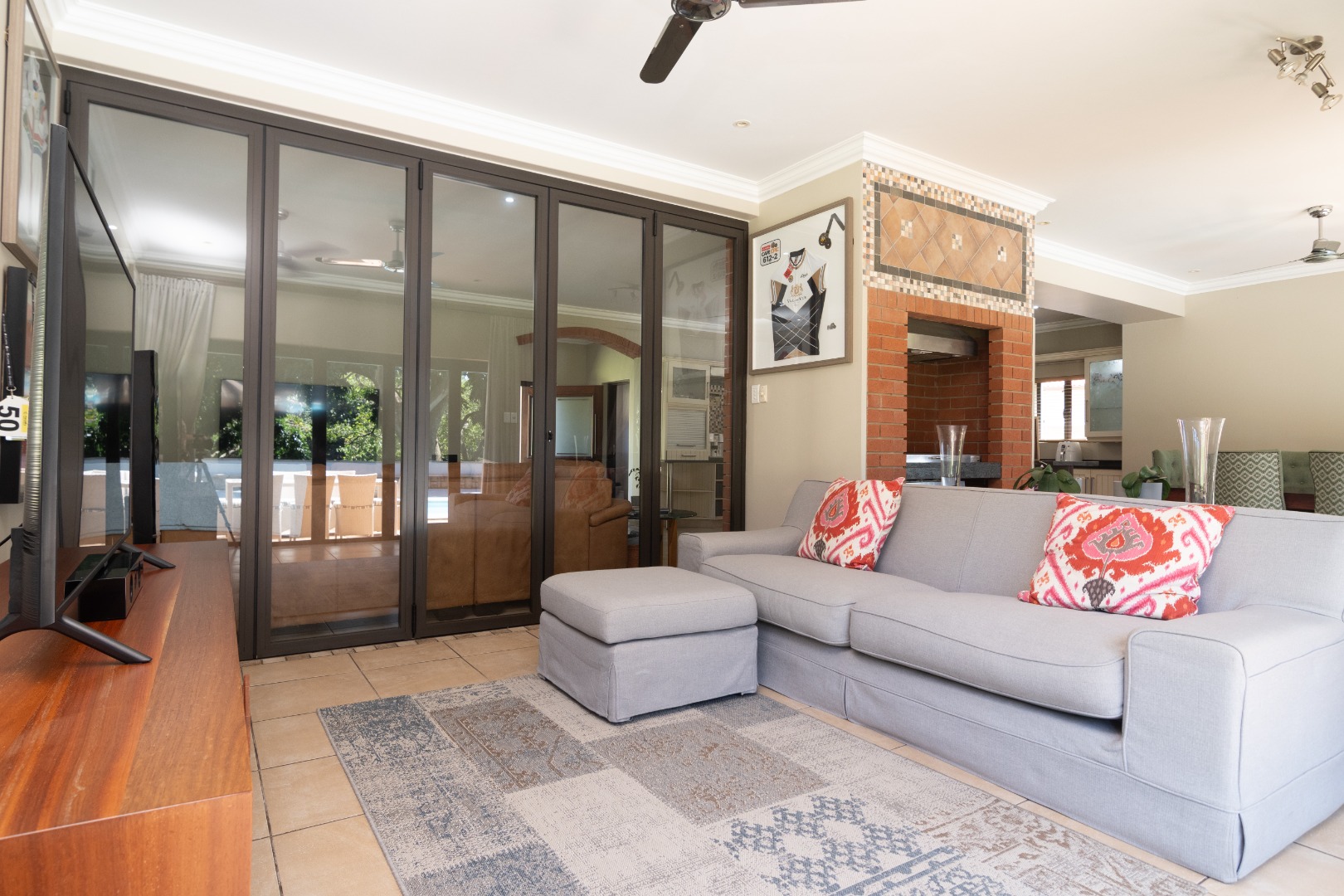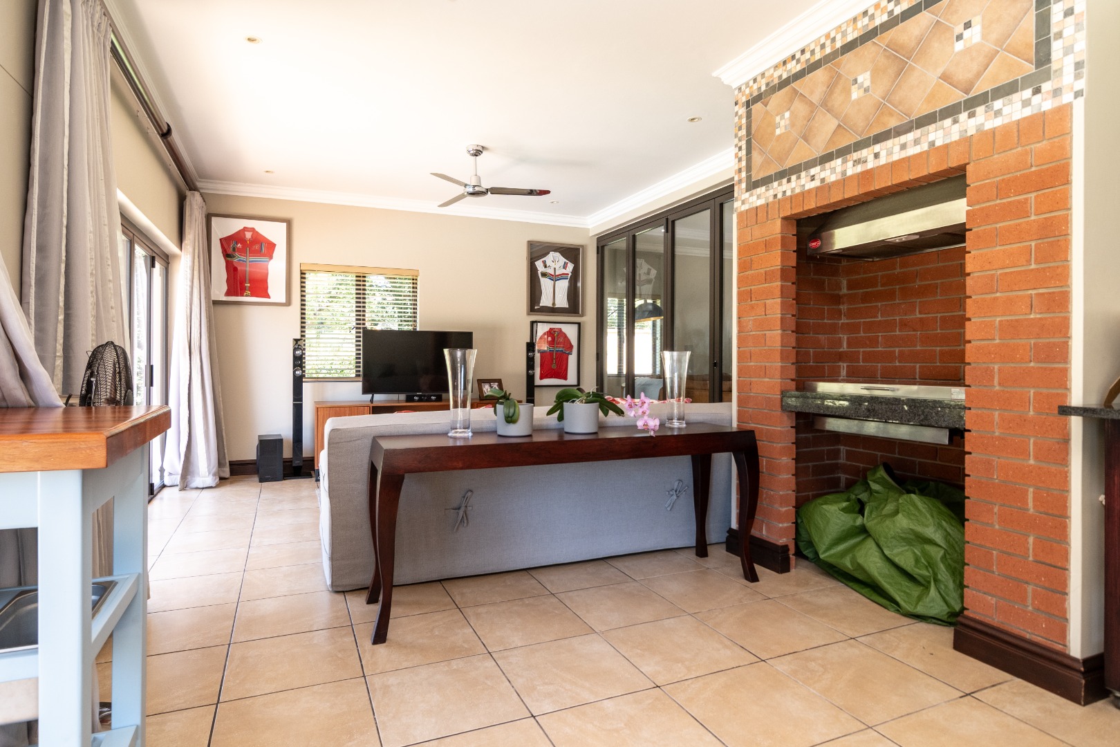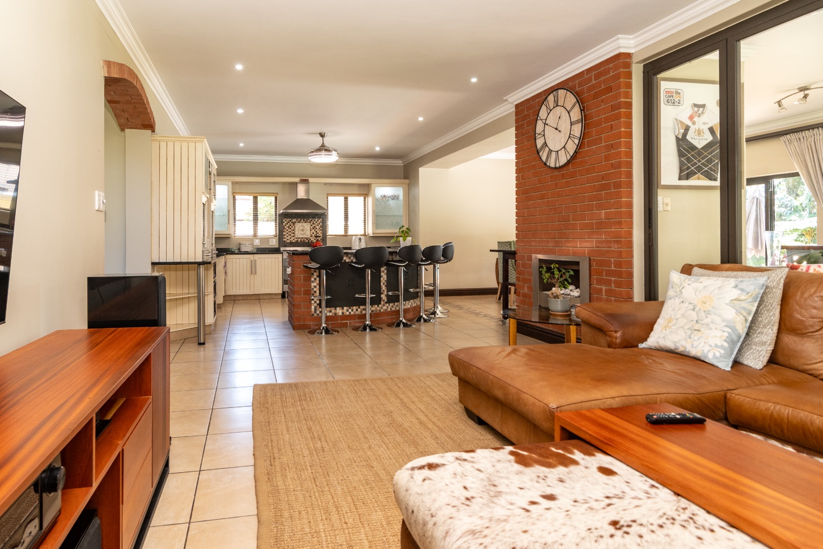 Entertain in style with an indoor gas braai, gas fireplace for cozy evenings, and glass stack doors opening to a smaller TV or entertainment room. The living spaces flow effortlessly outdoors to a sparkling pool, firepit, built-in seating, and a manicured garden—ideal for hosting family and friends.