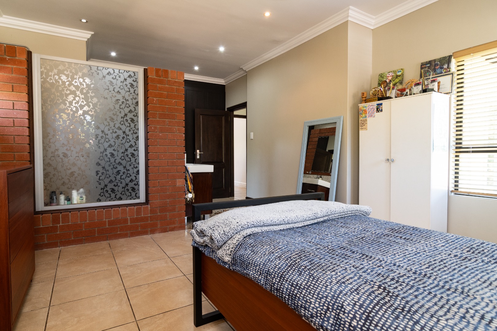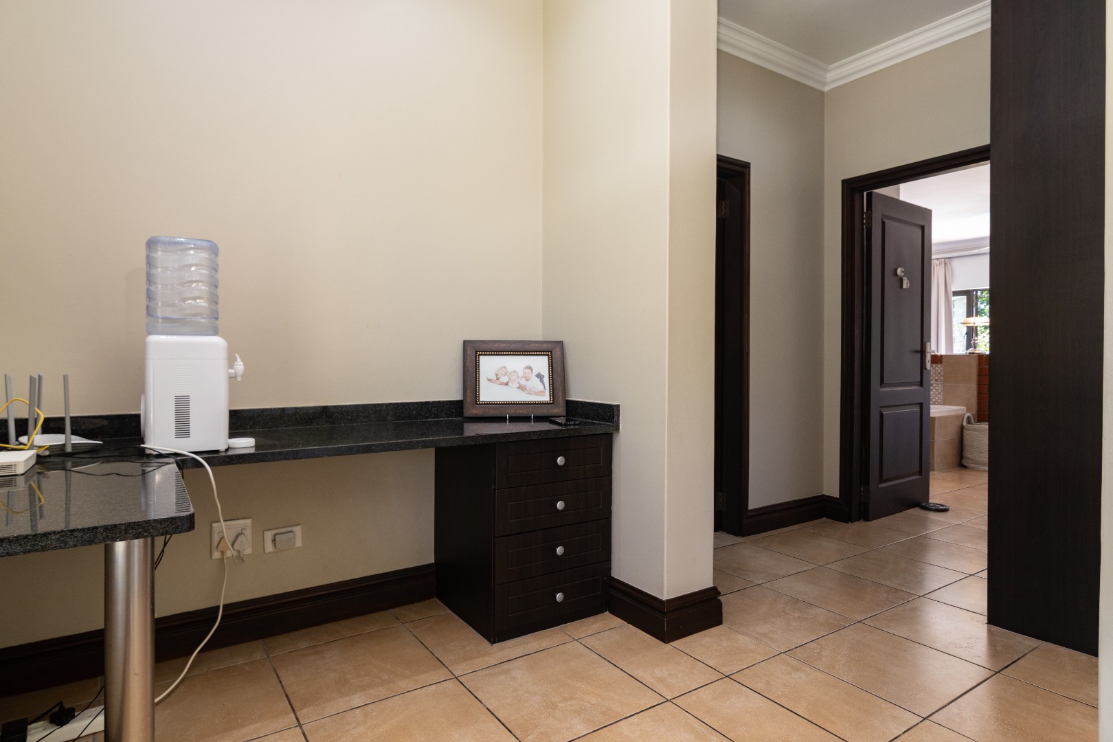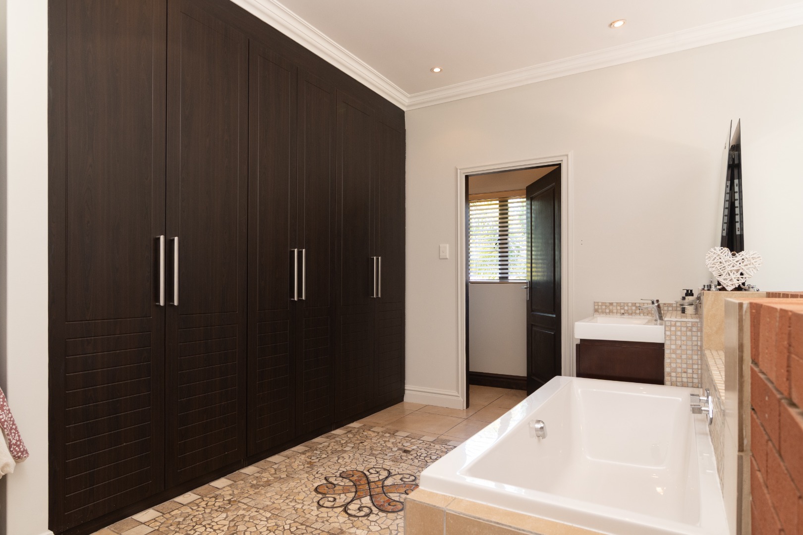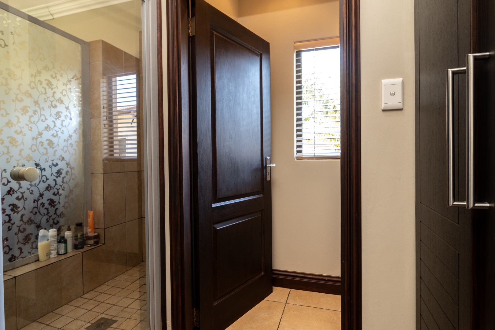 Upstairs, three generously sized en-suite bedrooms deliver ultimate comfort, with the expansive master suite featuring a spacious open plan bathroom, his and hers vanities, a bath, double shower heads, and a separate toilet. Ample built-in cupboards line the master bedroom, and a Juliet balcony provides picturesque views of the garden and golf course. The second bedroom also offers an open plan bathroom with a bath and seperate toilet and a Juliet balcony with delightful vistas. The third bedroom has a shower and separate toilet also within an open plan layout.