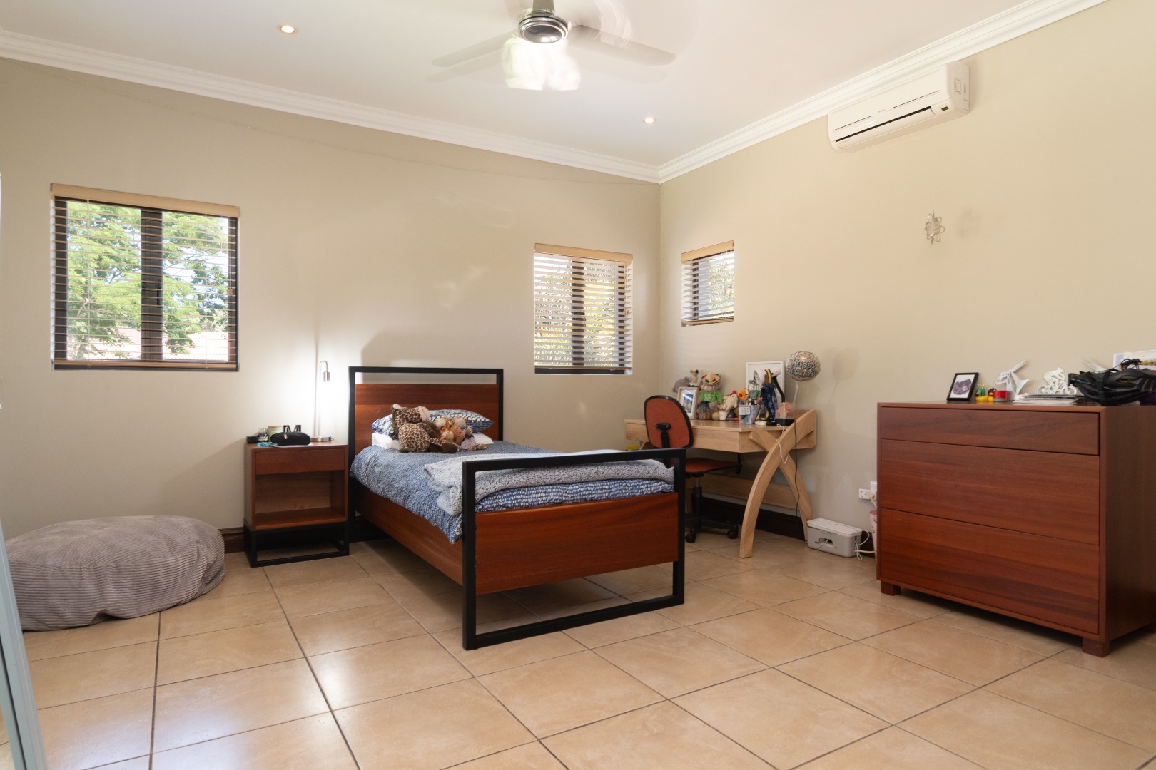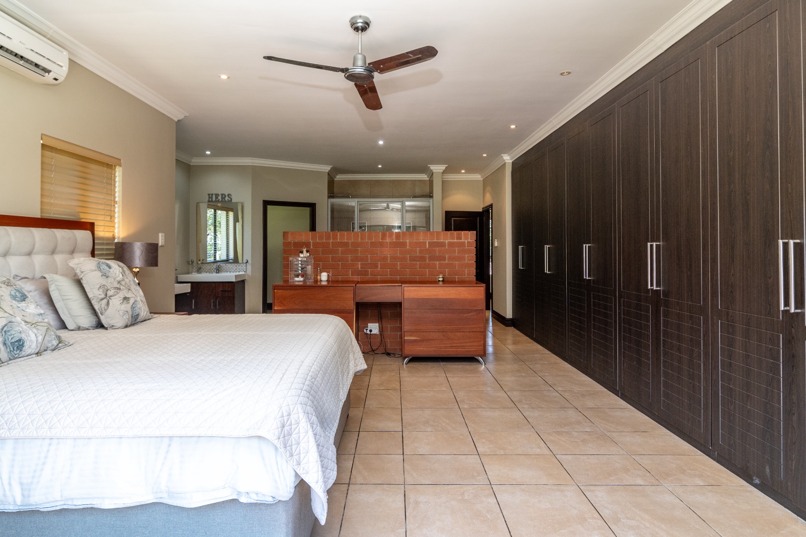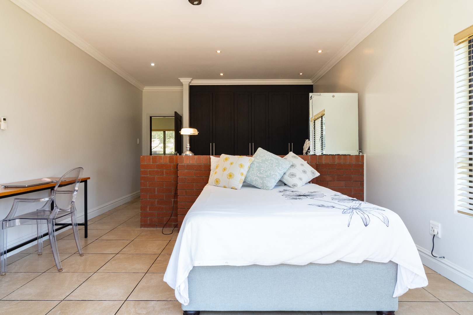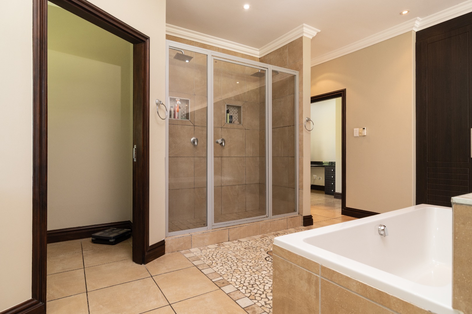 Upstairs, three generously sized en-suite bedrooms deliver ultimate comfort, with the expansive master suite featuring a spacious open plan bathroom, his and hers vanities, a bath, double shower heads, and a separate toilet. Ample built-in cupboards line the master bedroom, and a Juliet balcony provides picturesque views of the garden and golf course. The second bedroom also offers an open plan bathroom with a bath and seperate toilet and a Juliet balcony with delightful vistas. The third bedroom has a shower and separate toilet also within an open plan layout.