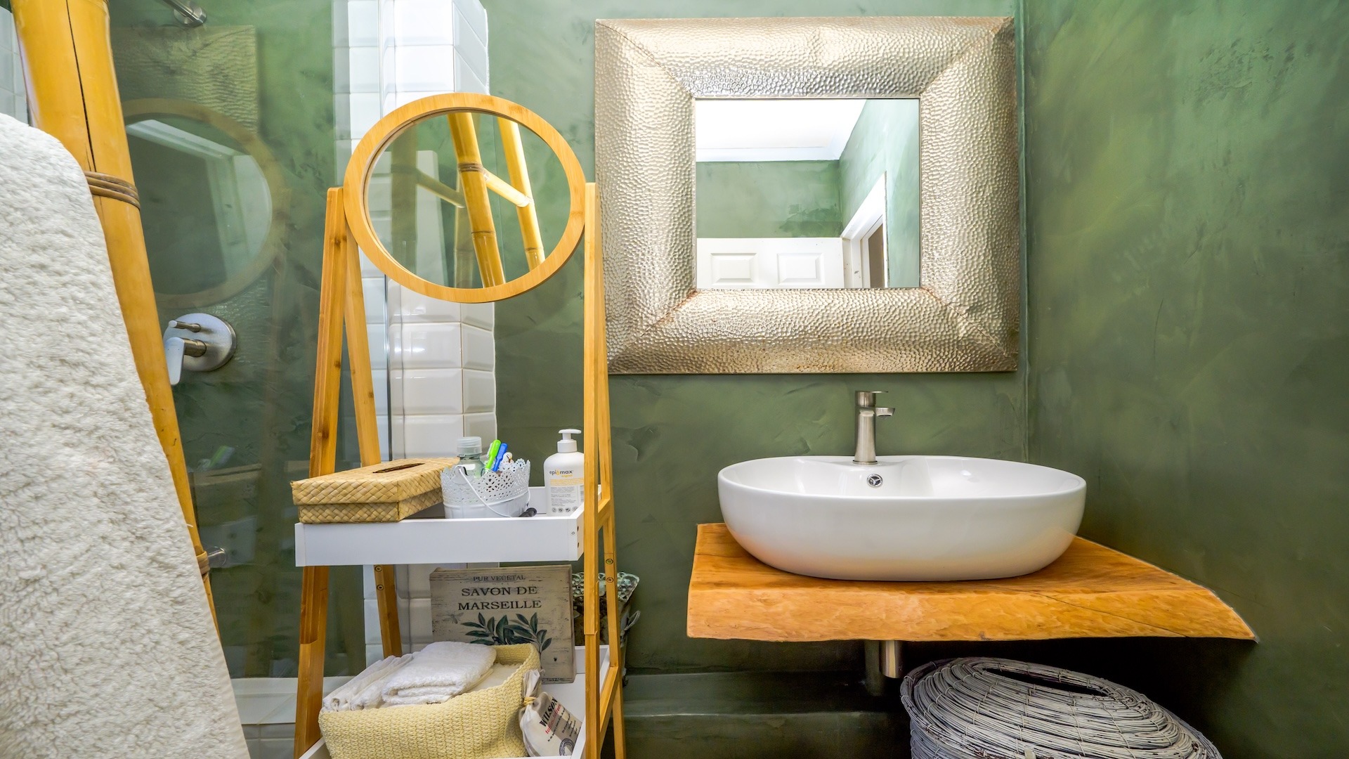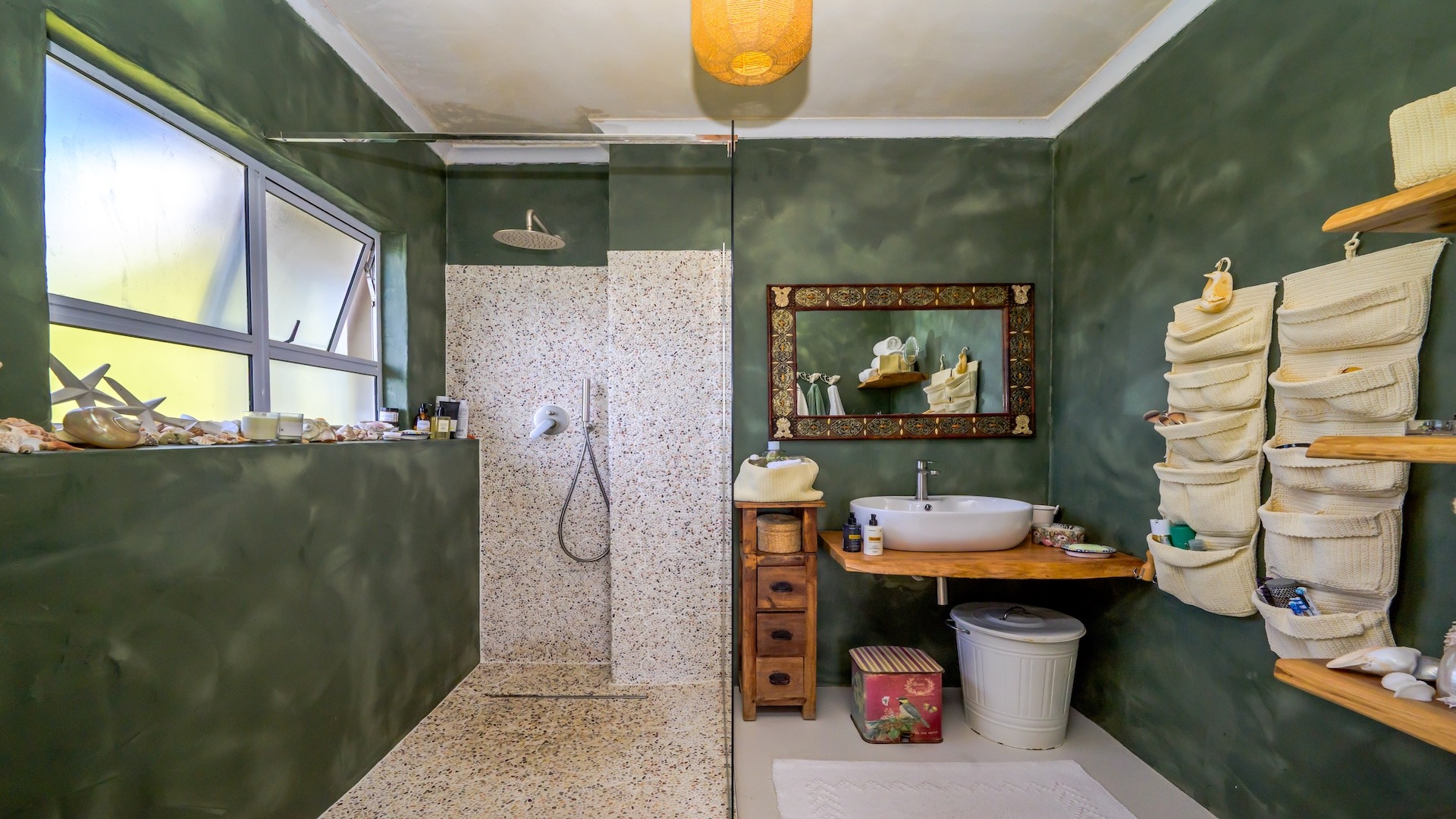 The main bedroom boasts sweeping sea views across Santorini with full breaker vistas. It includes a contemporary dressing area and a spacious ensuite bathroom with a walk-in shower. Two additional bedrooms are located off the passage, with a modern guest bathroom also featuring a walk-in shower.