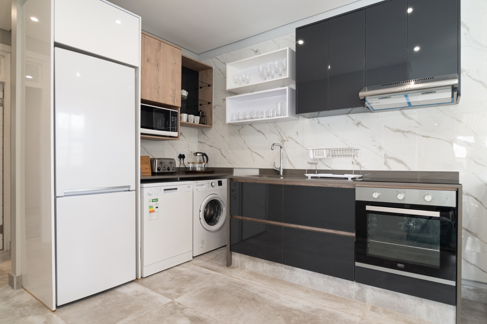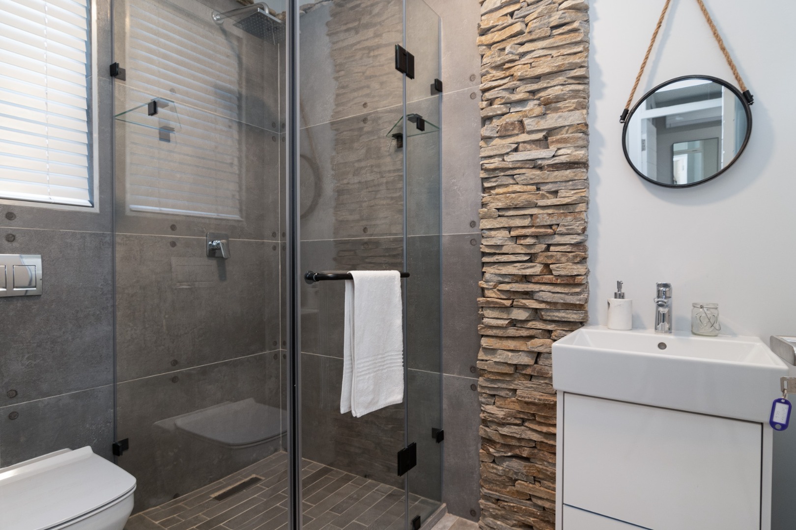 The compact, well-equipped kitchen boasts sleek cabinetry and essential appliances like an oven, microwave, and dishwasher, making meal prep a breeze. Both bedrooms are comfy, and the modern bathroom stands out with a stylish walk-in shower and a unique stacked stone accent wall.