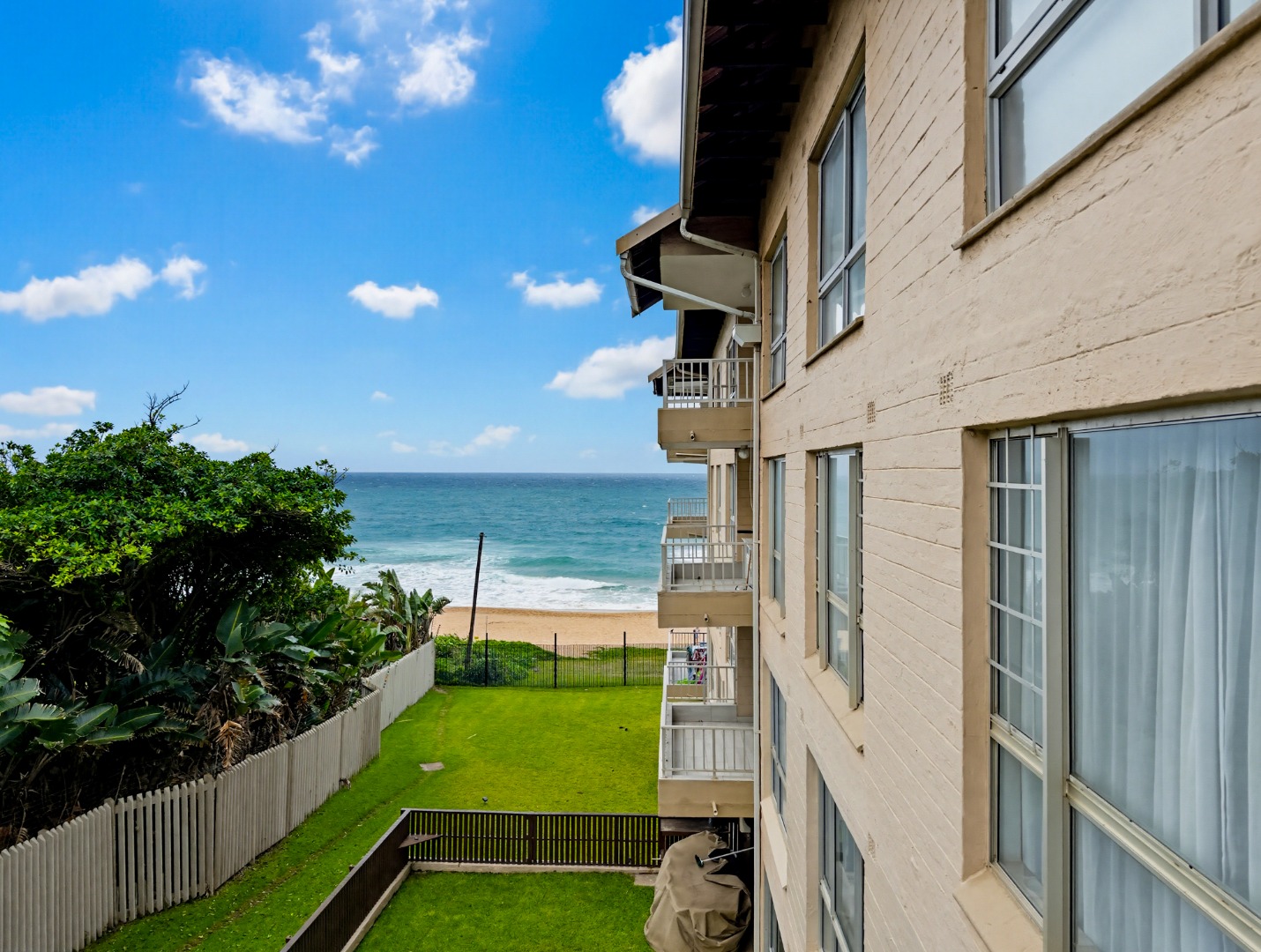 Step outside to a private balcony offering sea and scenic views, ideal for relaxation. The complex has a swimming pool and a well maintained garden, complemented by a communal braai area for entertaining. This pet friendly (with permission) residence includes a dedicated parking spot. The Complex is totally walled, featuring an access gate, electric fencing, and a security gate. Positioned as an Oceanfront gem, it is perfectly suited as an ideal holiday home, just moments from the beach.