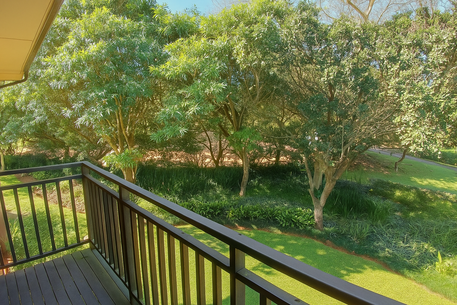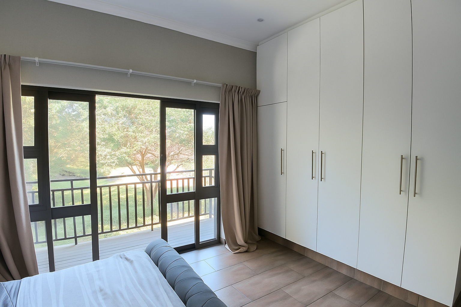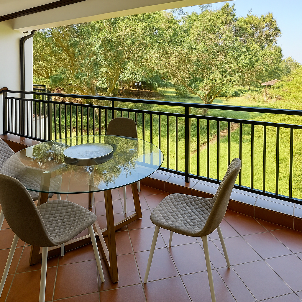 The main bedroom provides direct balcony access and ample built-in wardrobes. Enjoy serene gardens and lush outlook from your private balcony, perfect for relaxation. The estate ensures peace of mind with 24-hour security, electric fencing, and fibre connectivity.