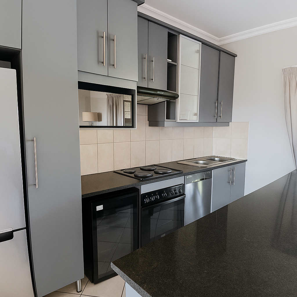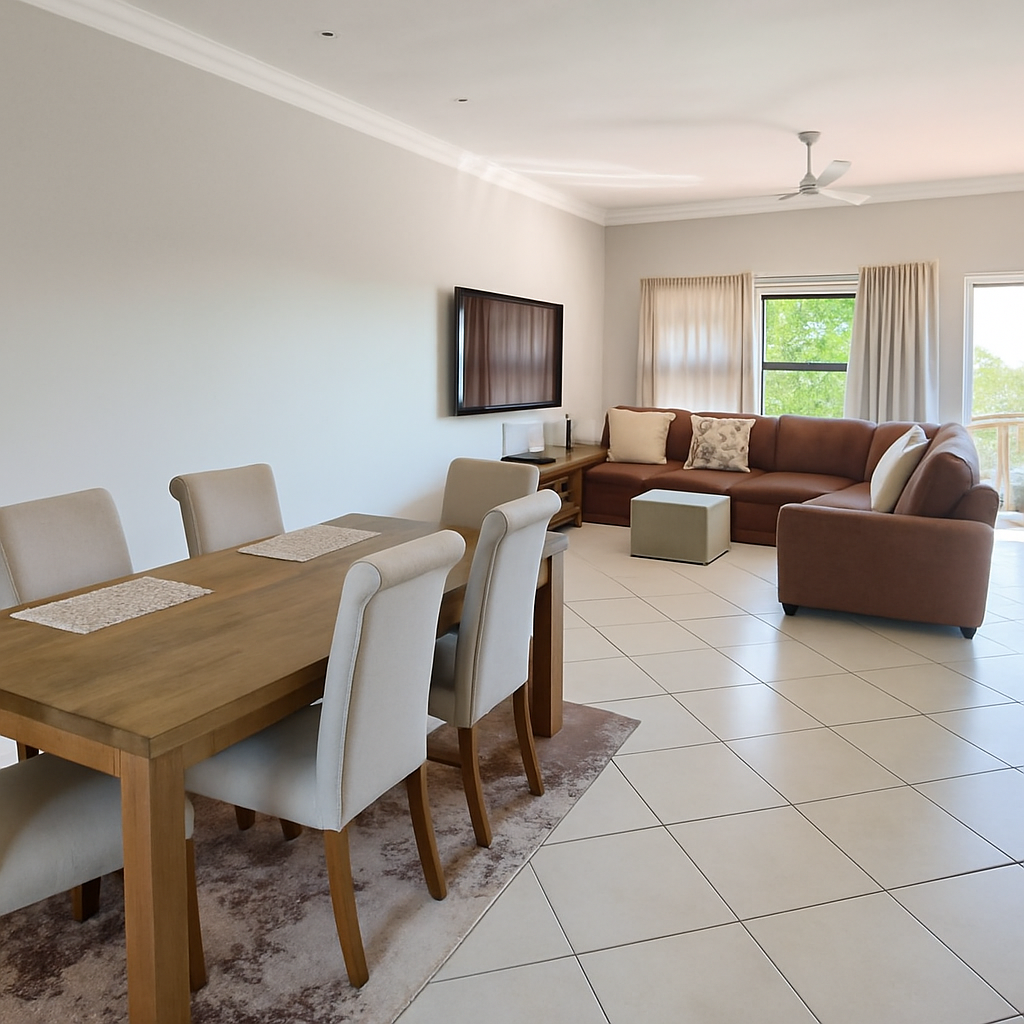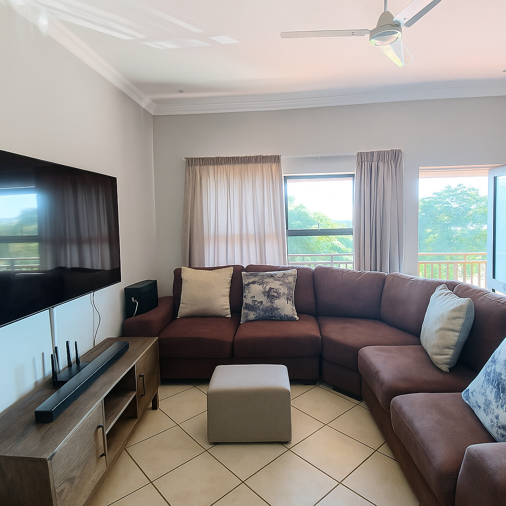 Discover modern living within the secure Hilltop Private Estate in Ballito. This inviting 125 sqm residence features an open-plan lounge and dining area, enhanced by natural light. The contemporary, open kitchen boasts sleek grey cabinetry and ample counter space. The apartment offers three comfortable bedrooms, including an en-suite, and two well-appointed bathrooms with modern vanities and a bathtub.