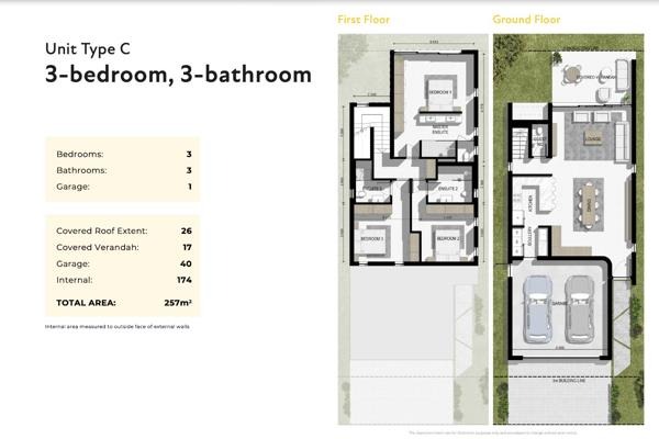 Type C includes 3 bedrooms and 3 bathrooms (all ensuite) upstairs. On ground level the open plan living areas, with guest toilet, undercover outdoor area and garden with a double garage.
