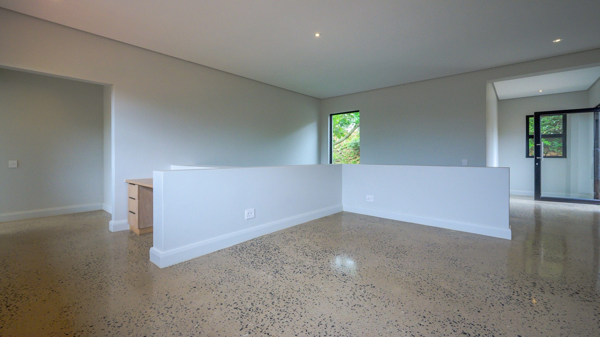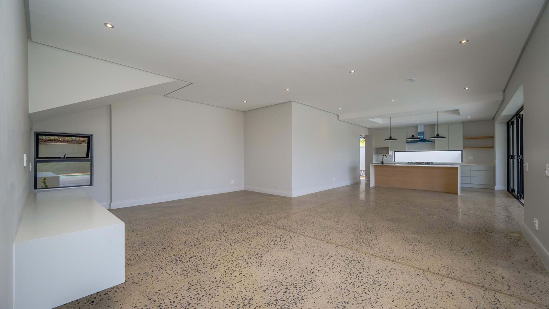 The entrance hall is light-filled with high ceilings and polished concrete floors, leading into a relaxed TV lounge with built-in cabinetry and a convenient coffee station. A study nook just off the lounge provides a functional work-from-home space.