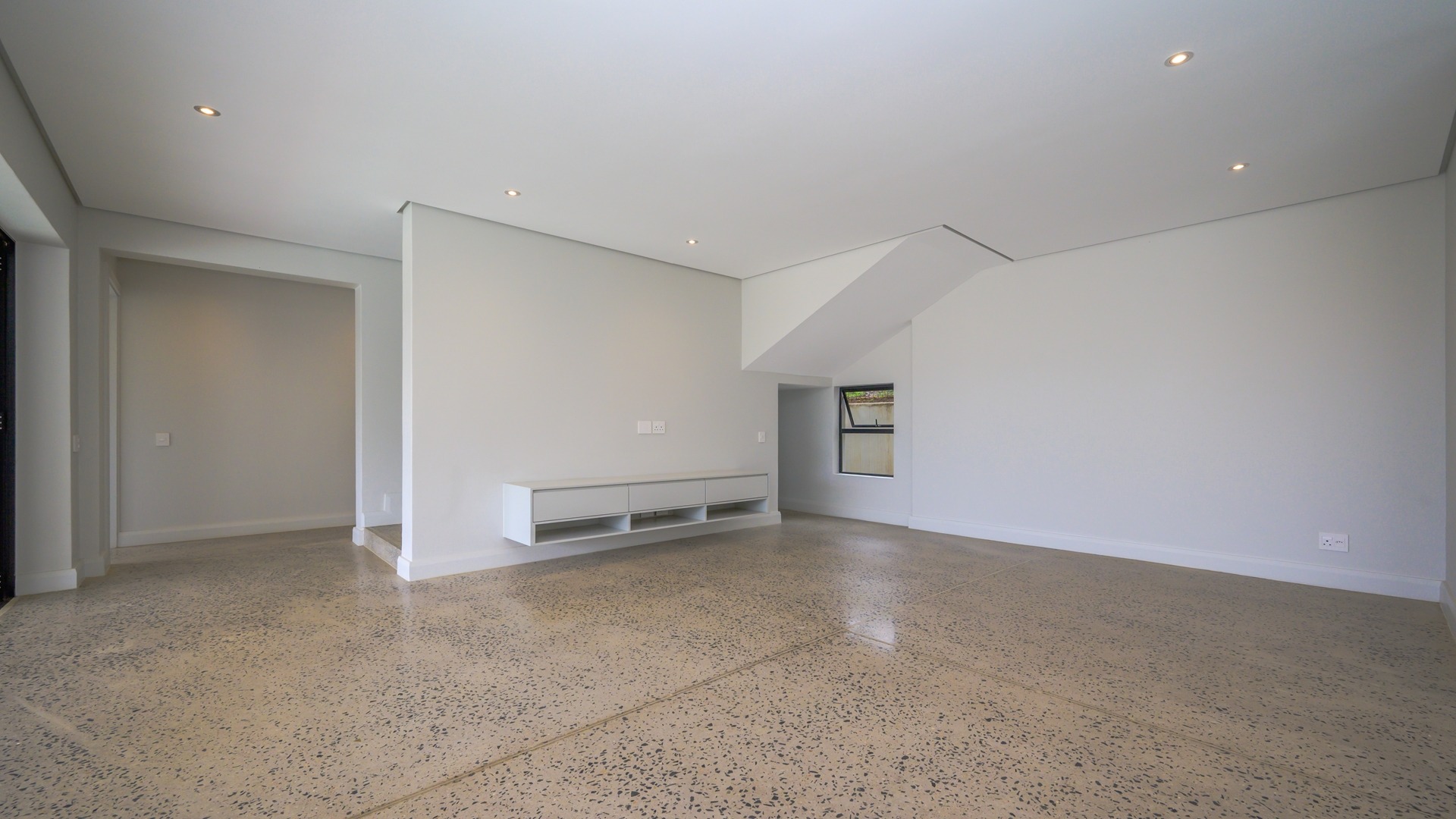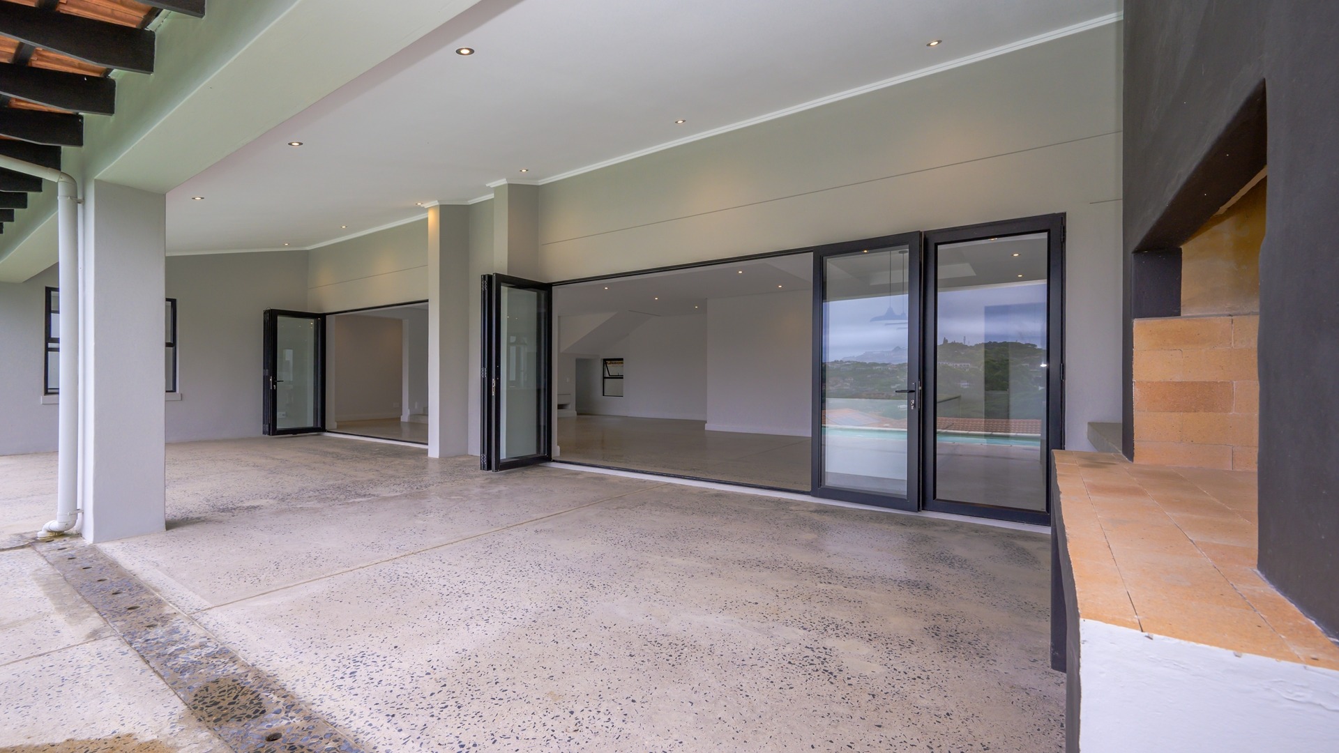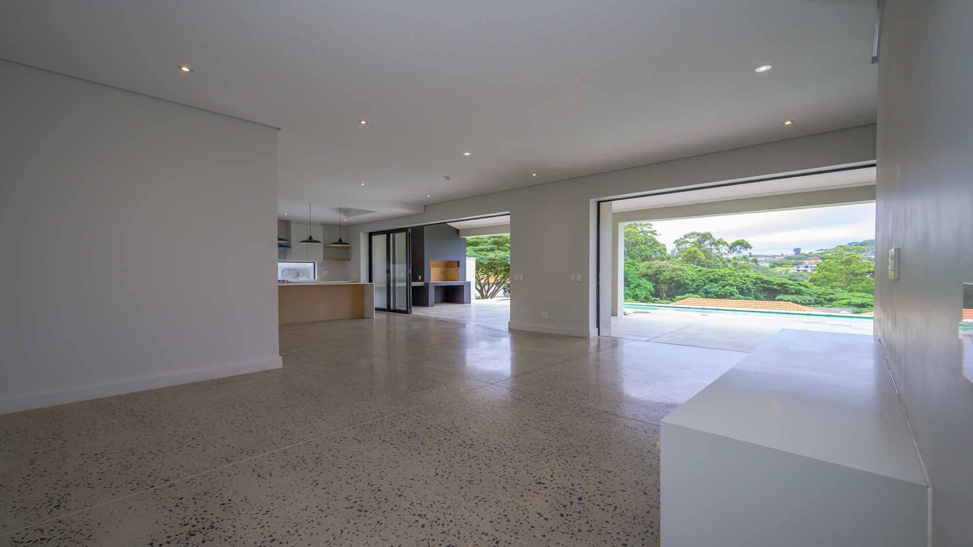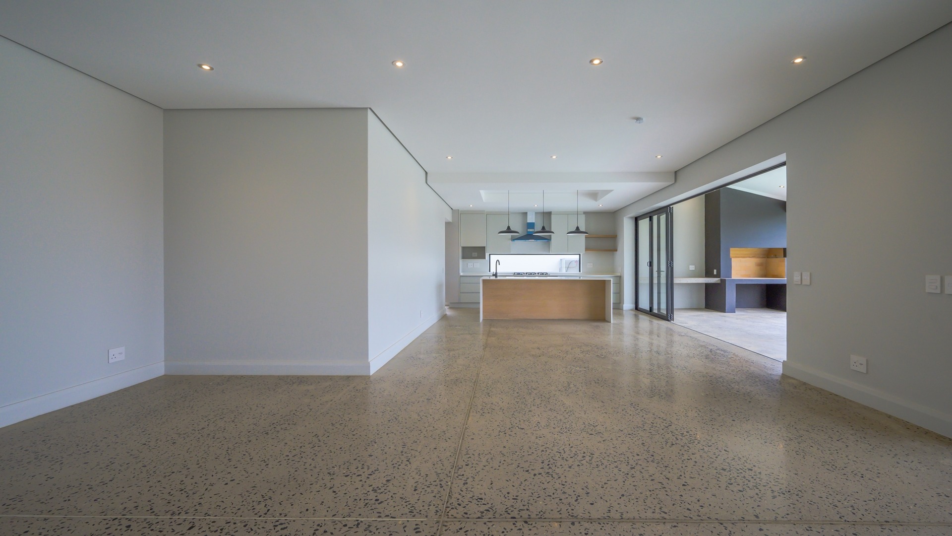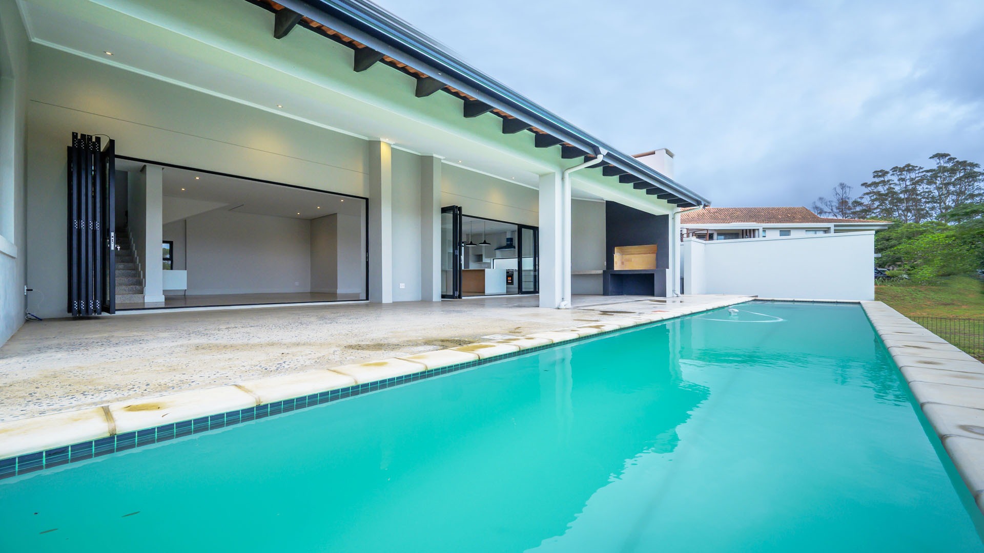 Open-plan living areas on the ground floor allow the kitchen, dining, and lounge to flow seamlessly together. Stacking doors open onto a covered patio with built-in braai, lap pool, fire pit, and a landscaped garden, creating an easy indoor-outdoor living environment.