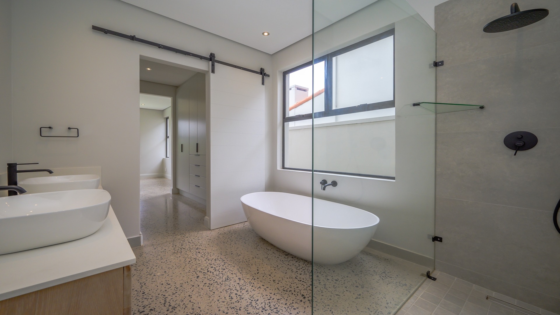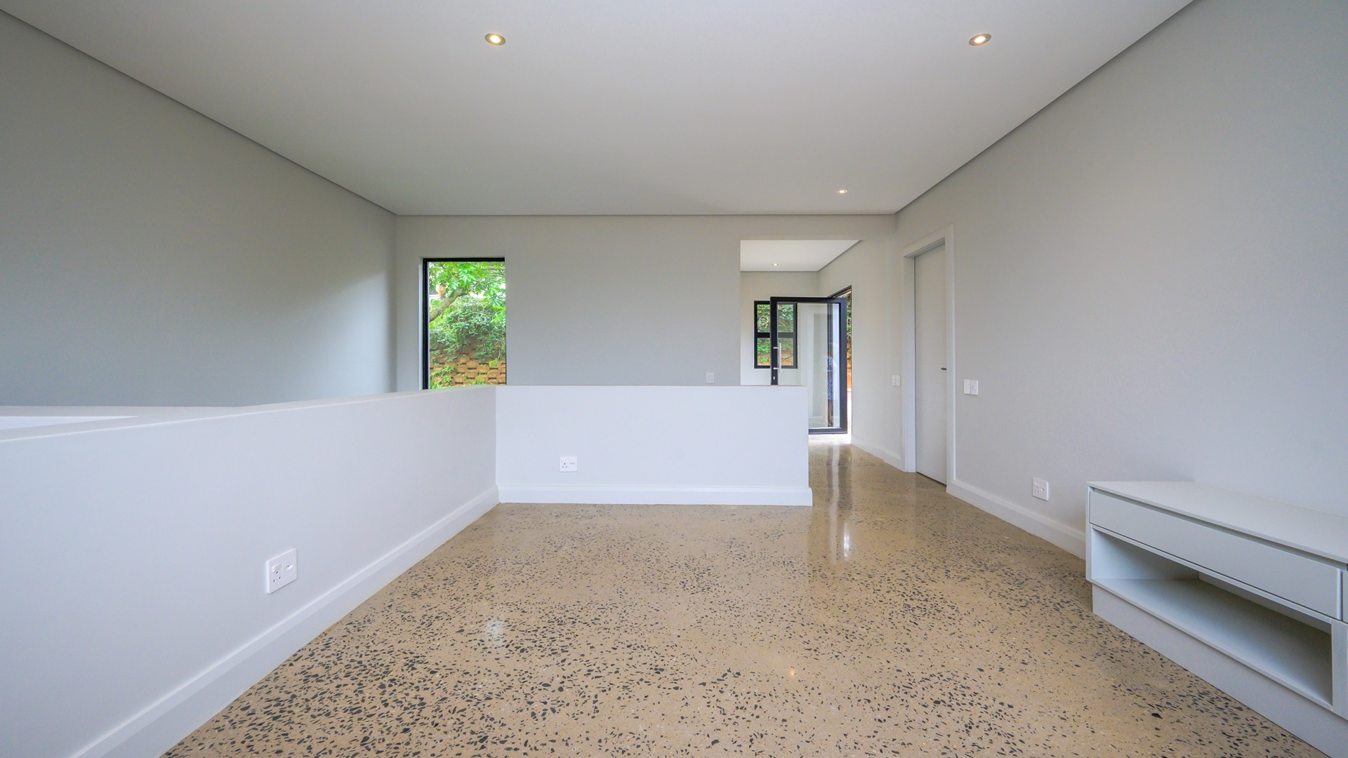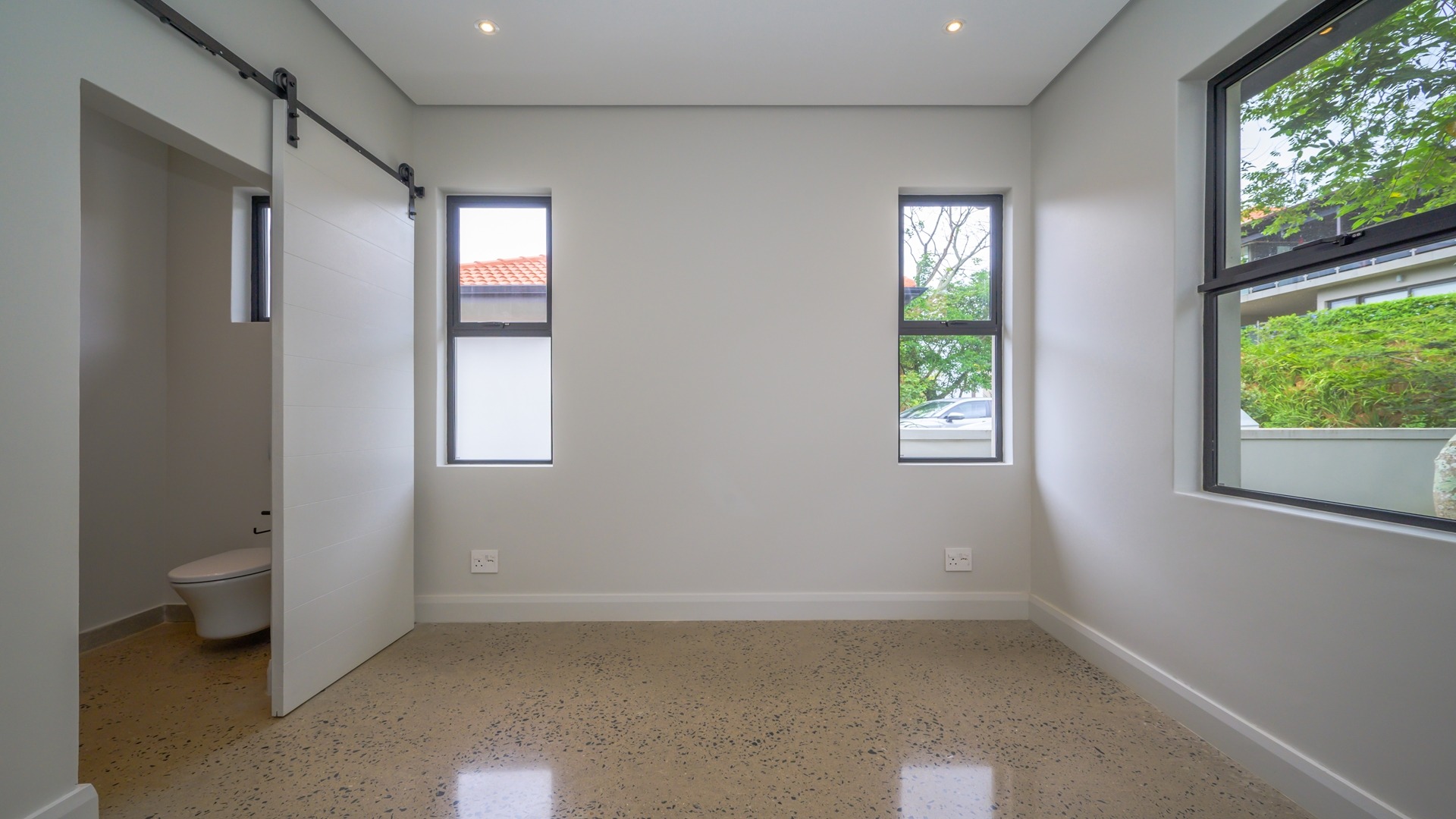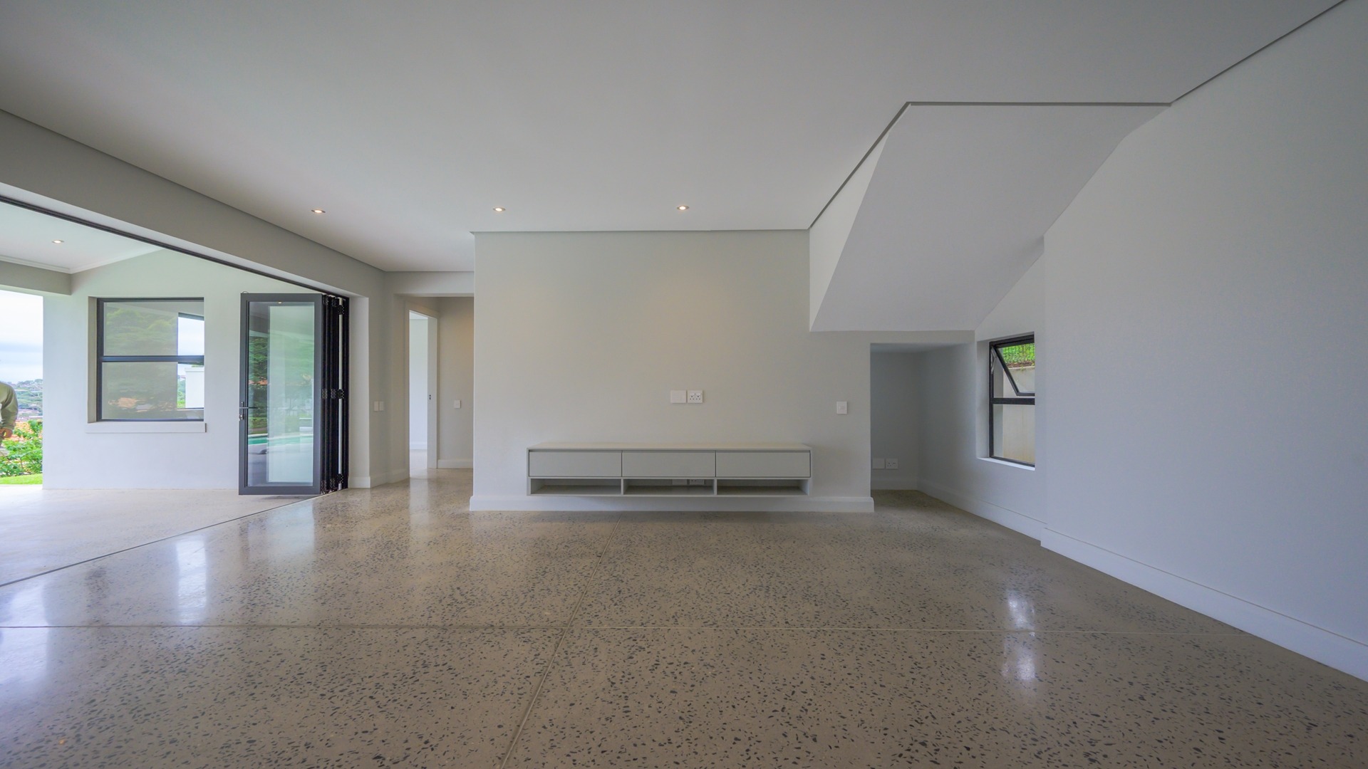 Open-plan living areas on the ground floor allow the kitchen, dining, and lounge to flow seamlessly together. Stacking doors open onto a covered patio with built-in braai, lap pool, fire pit, and a landscaped garden, creating an easy indoor-outdoor living environment.