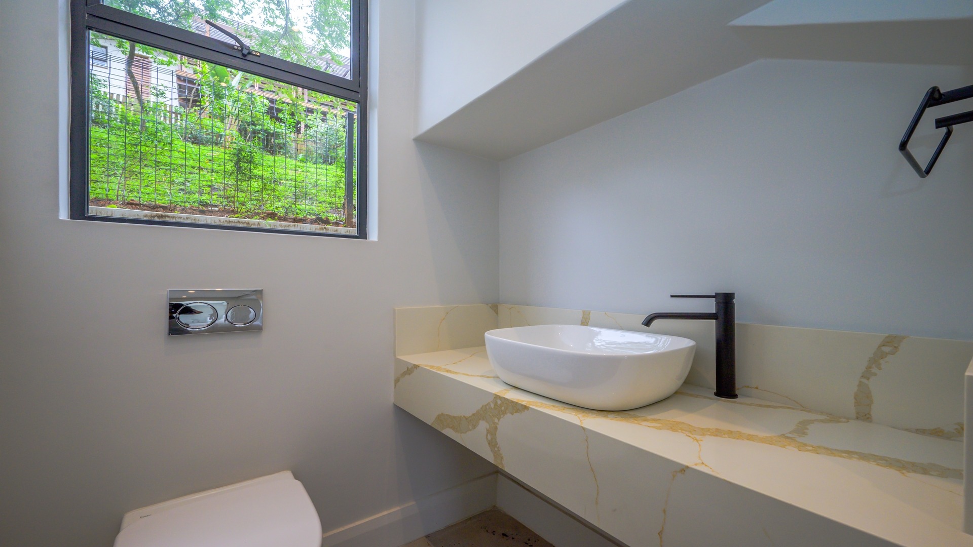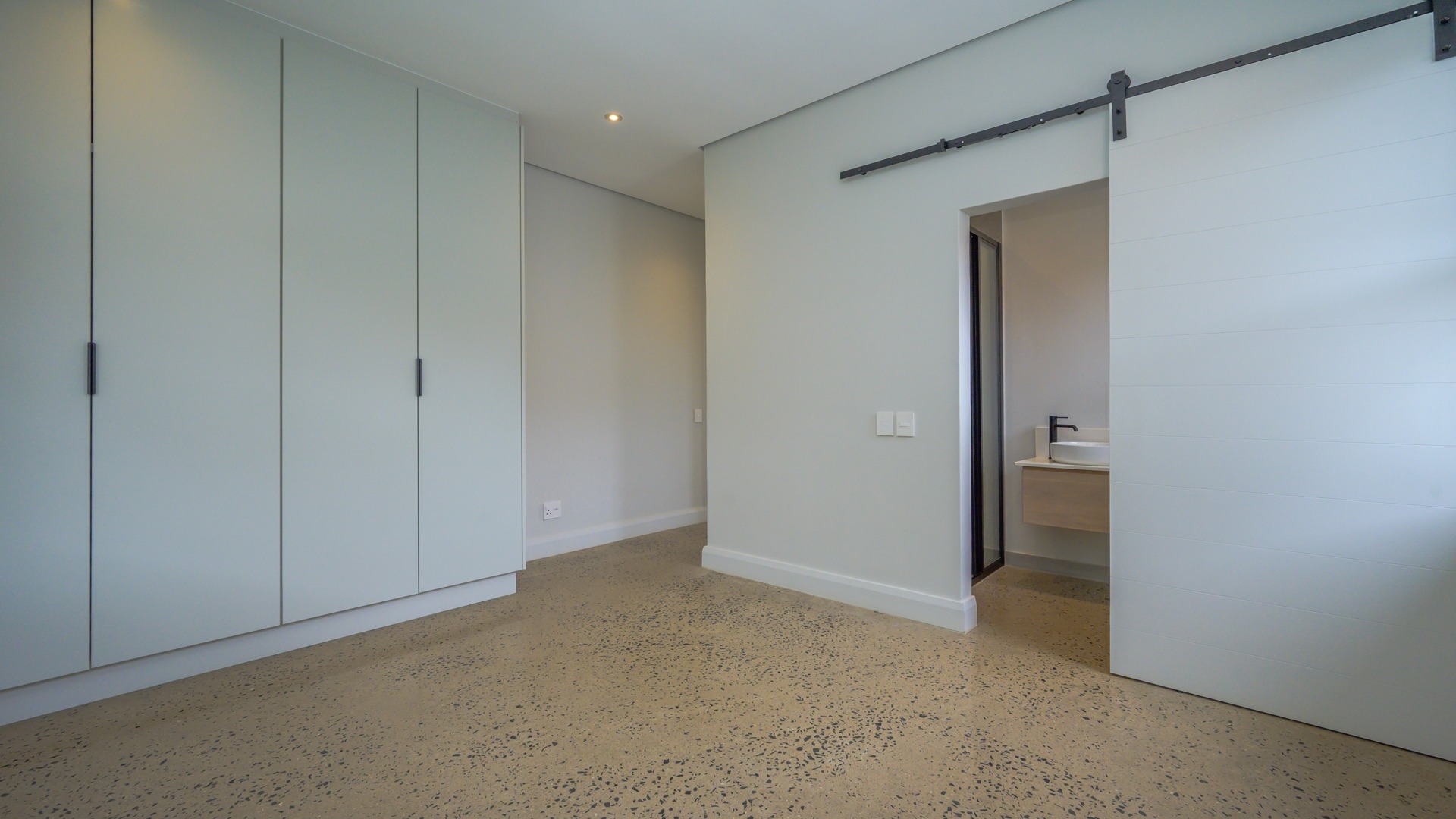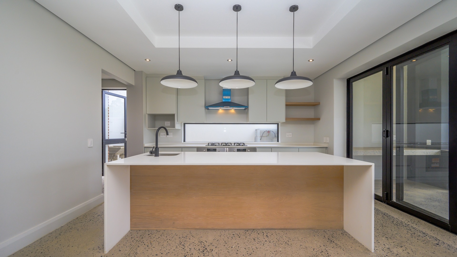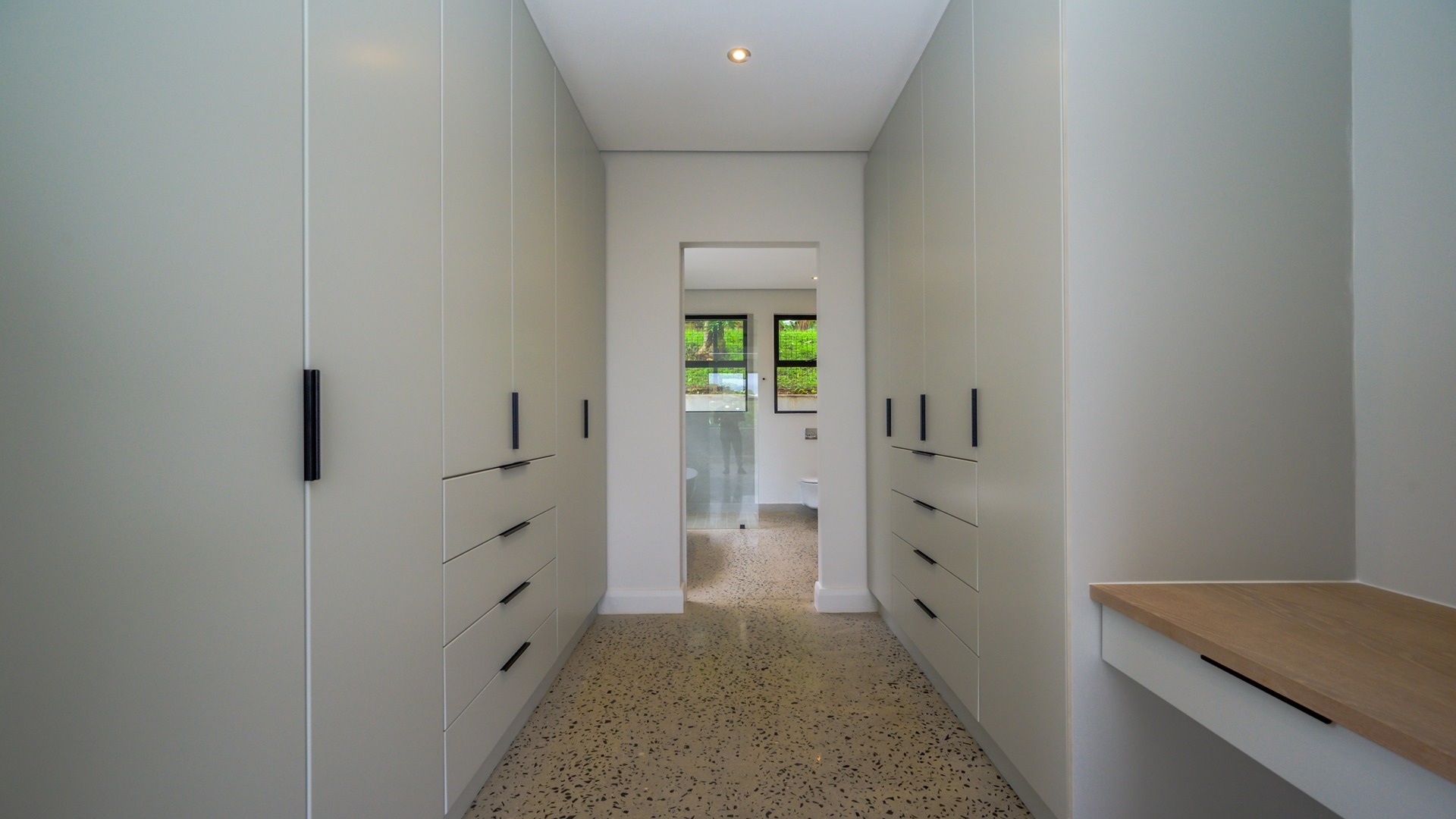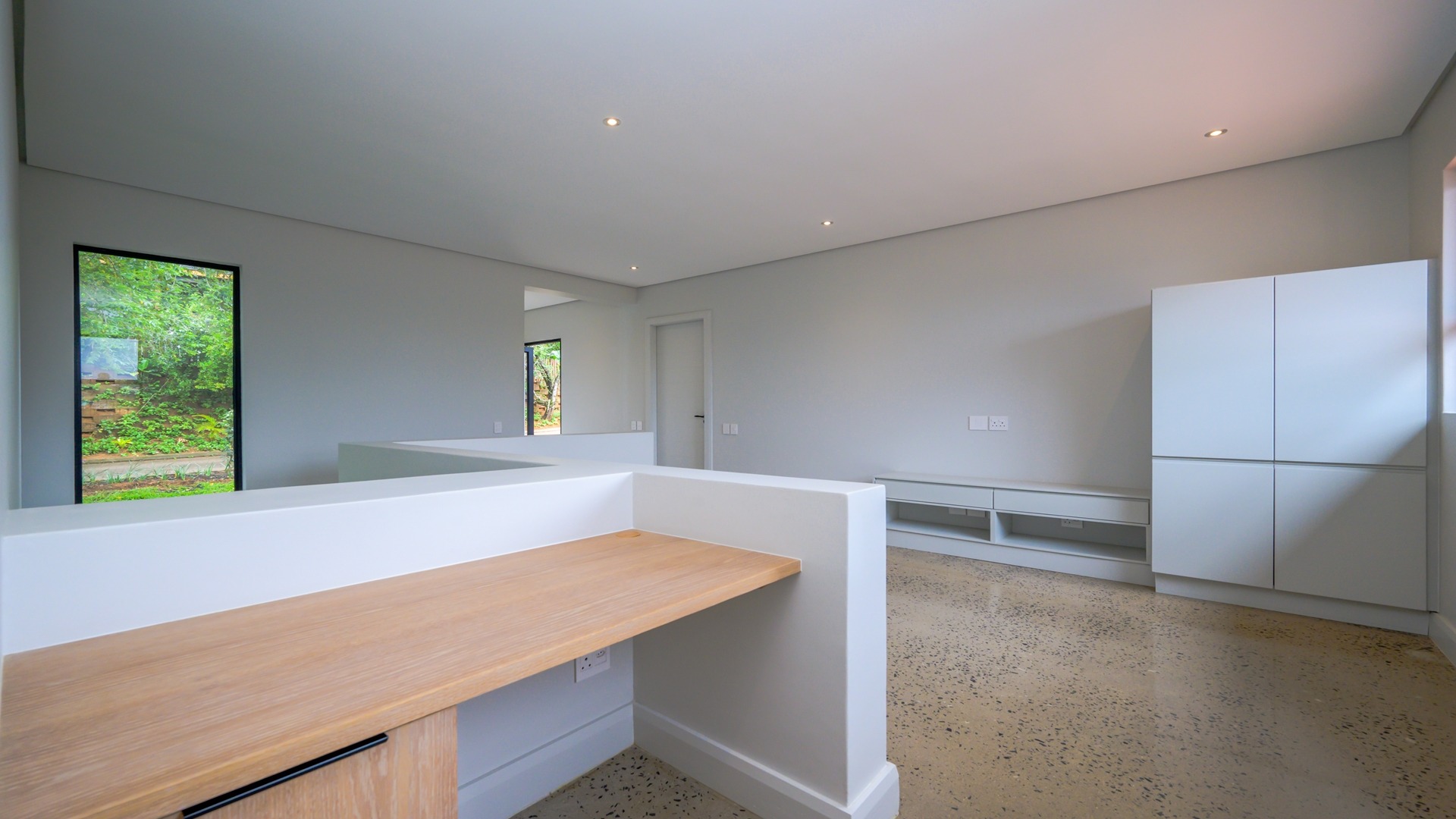 Open-plan living areas on the ground floor allow the kitchen, dining, and lounge to flow seamlessly together. Stacking doors open onto a covered patio with built-in braai, lap pool, fire pit, and a landscaped garden, creating an easy indoor-outdoor living environment.