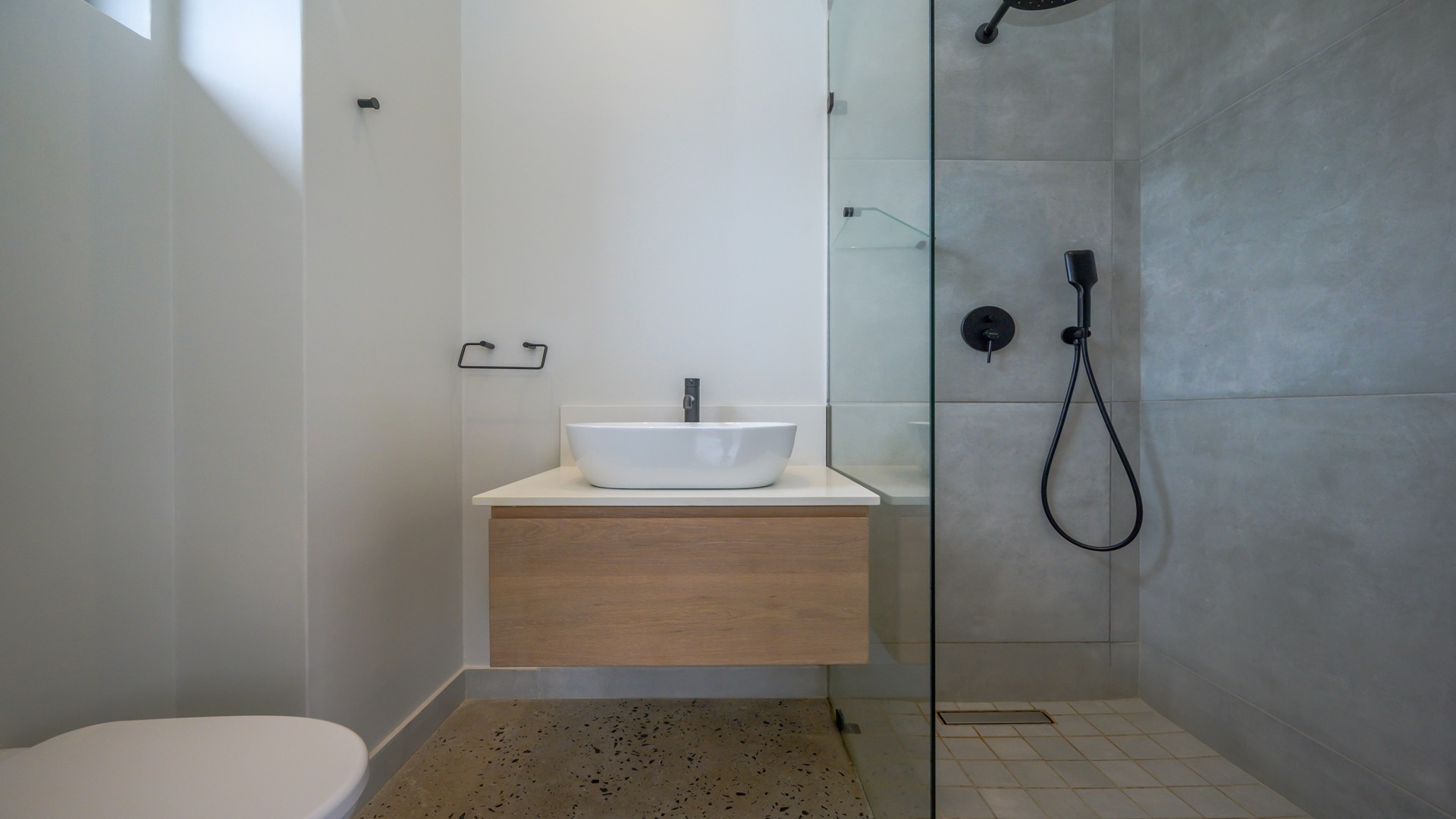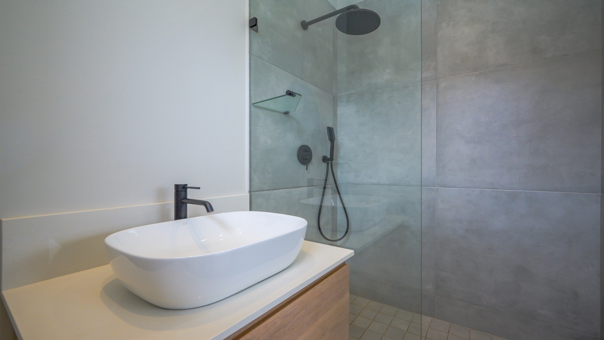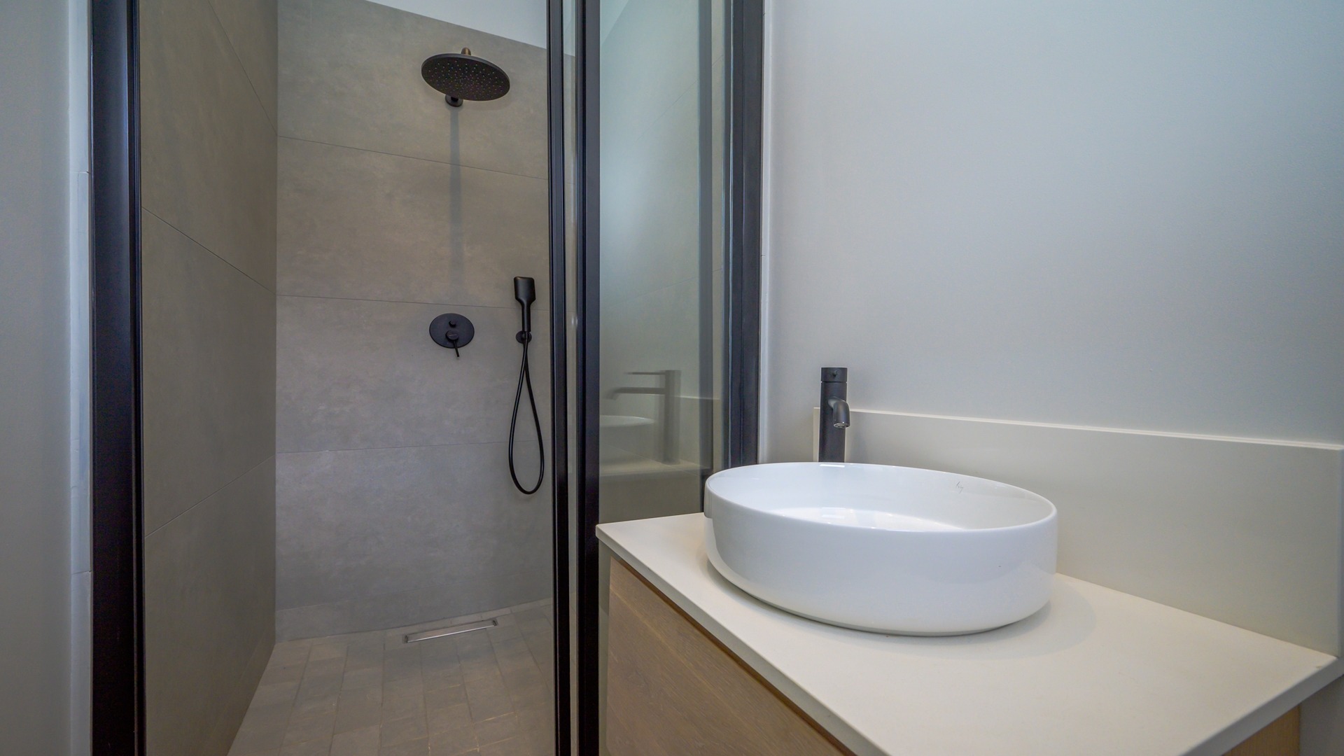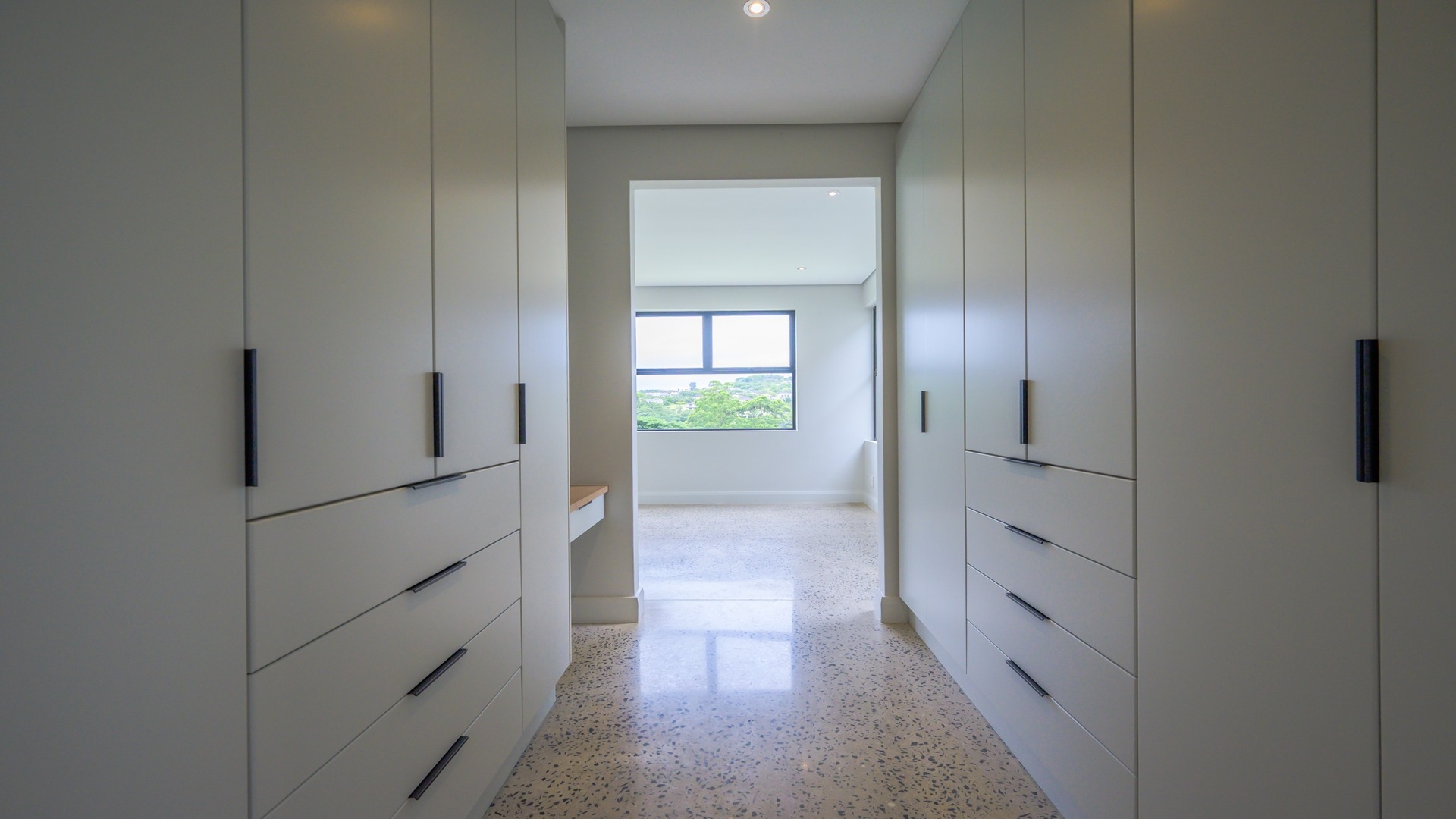 The home offers three well-sized bedrooms, each with its own en-suite bathroom. The main bedroom includes a walk-in dressing area with ample storage and a full en-suite bathroom.