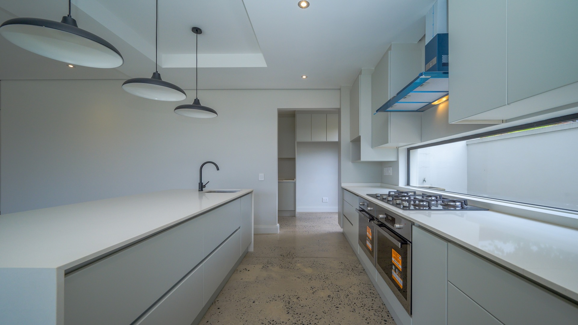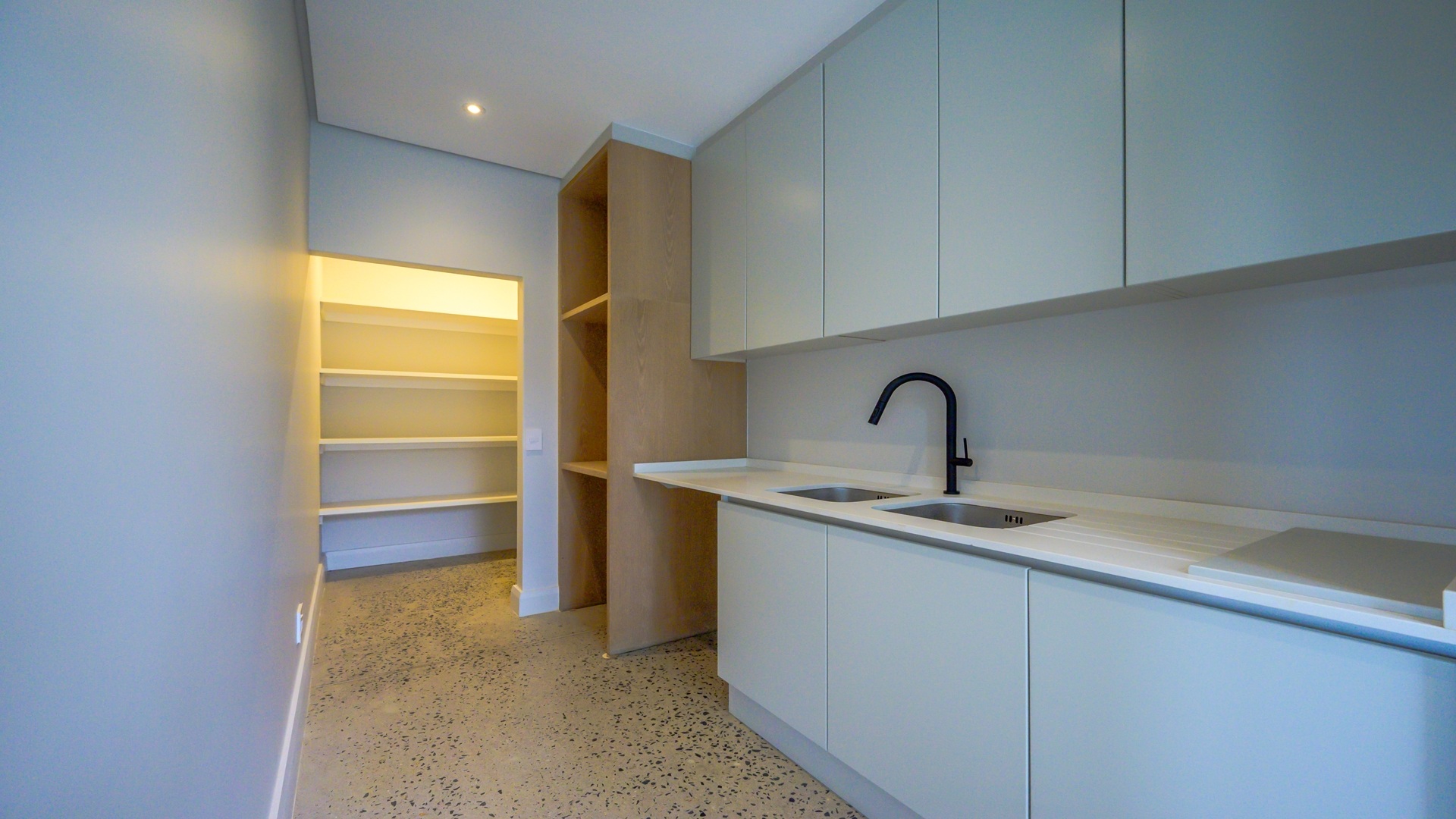 The kitchen is fitted with soft-close cabinetry, a gas stove, breakfast nook, and generous storage. A separate scullery with pantry space and laundry cabinetry provides direct access to a private courtyard.