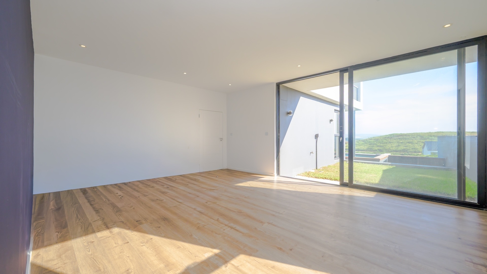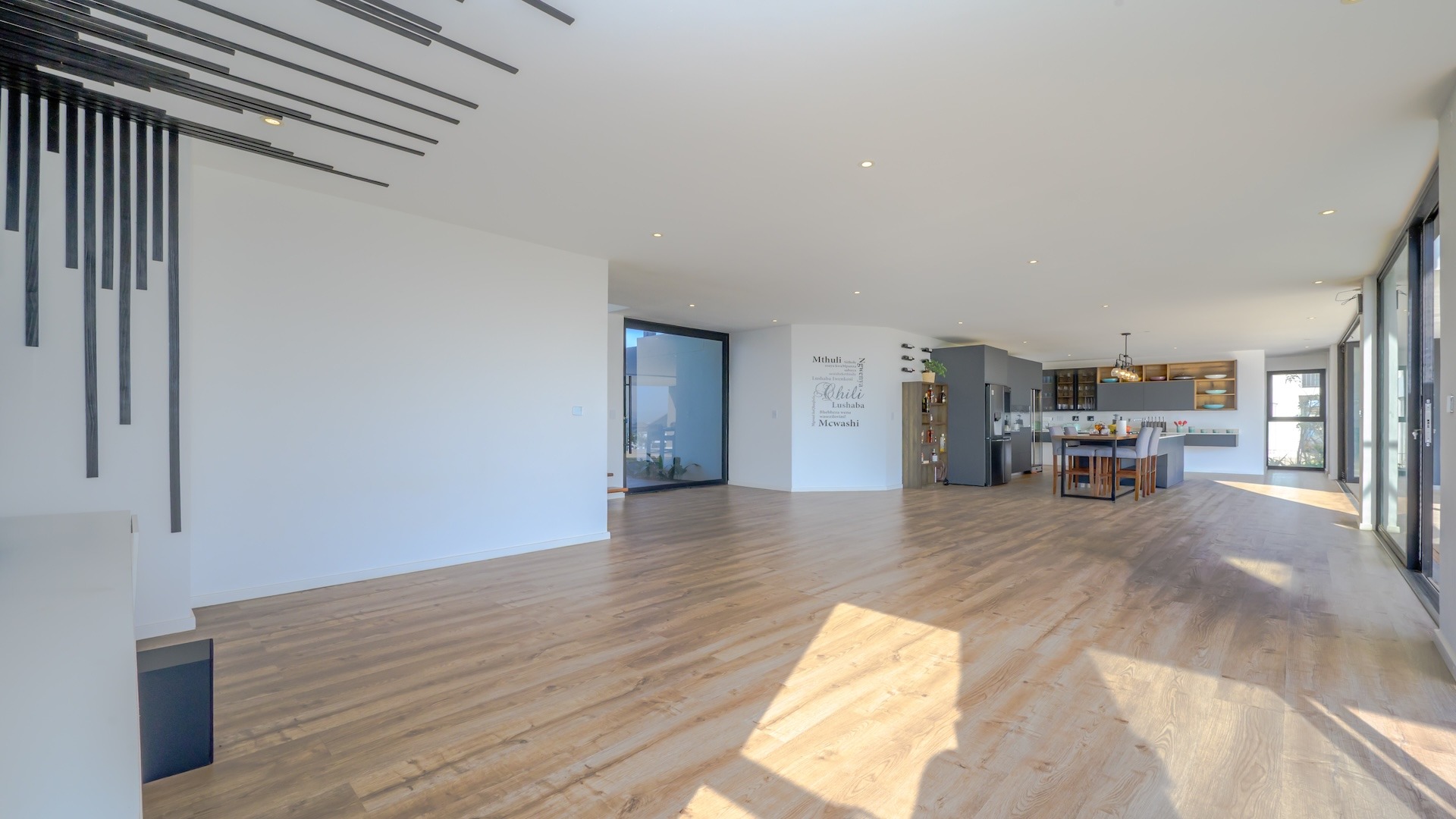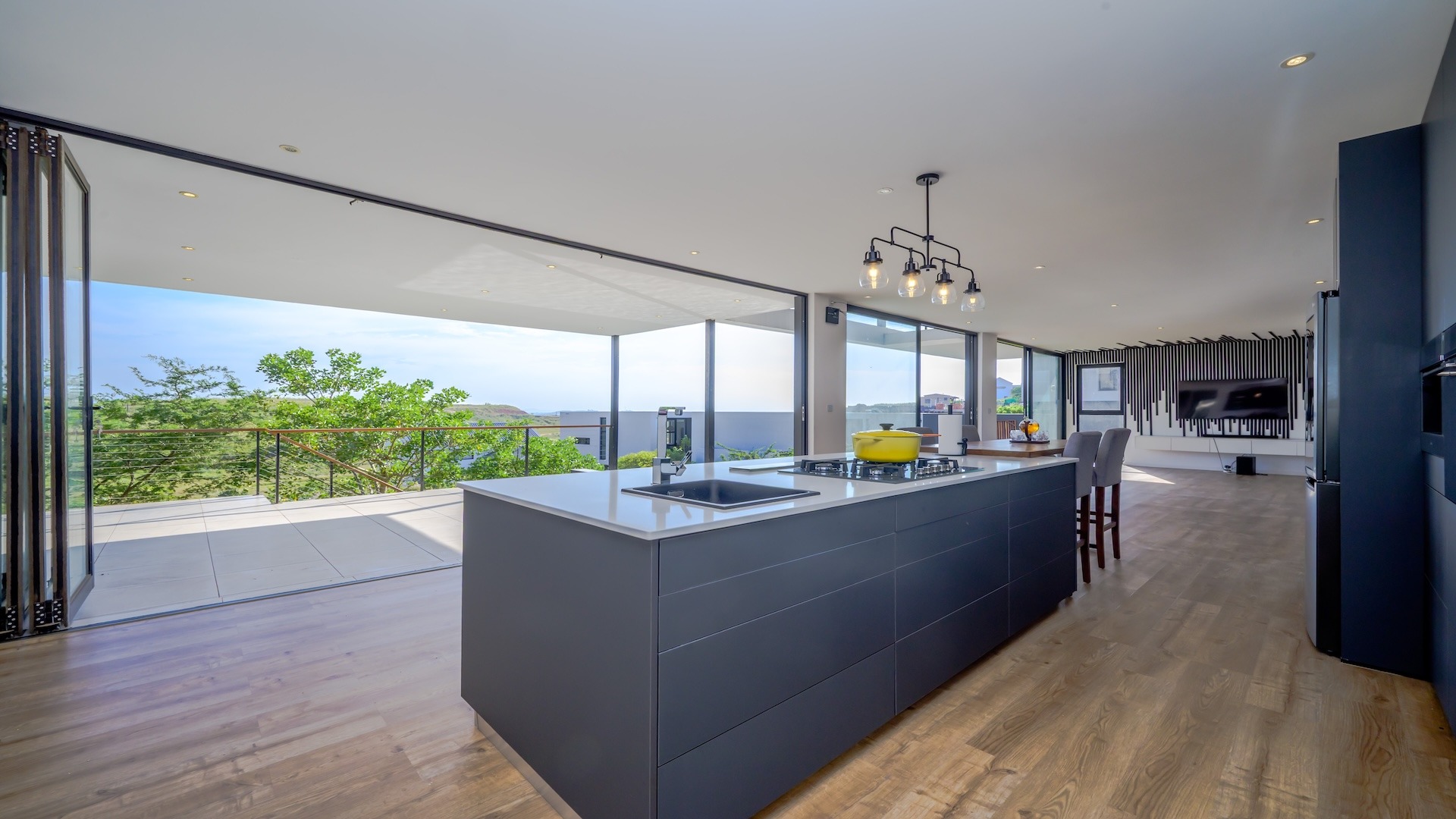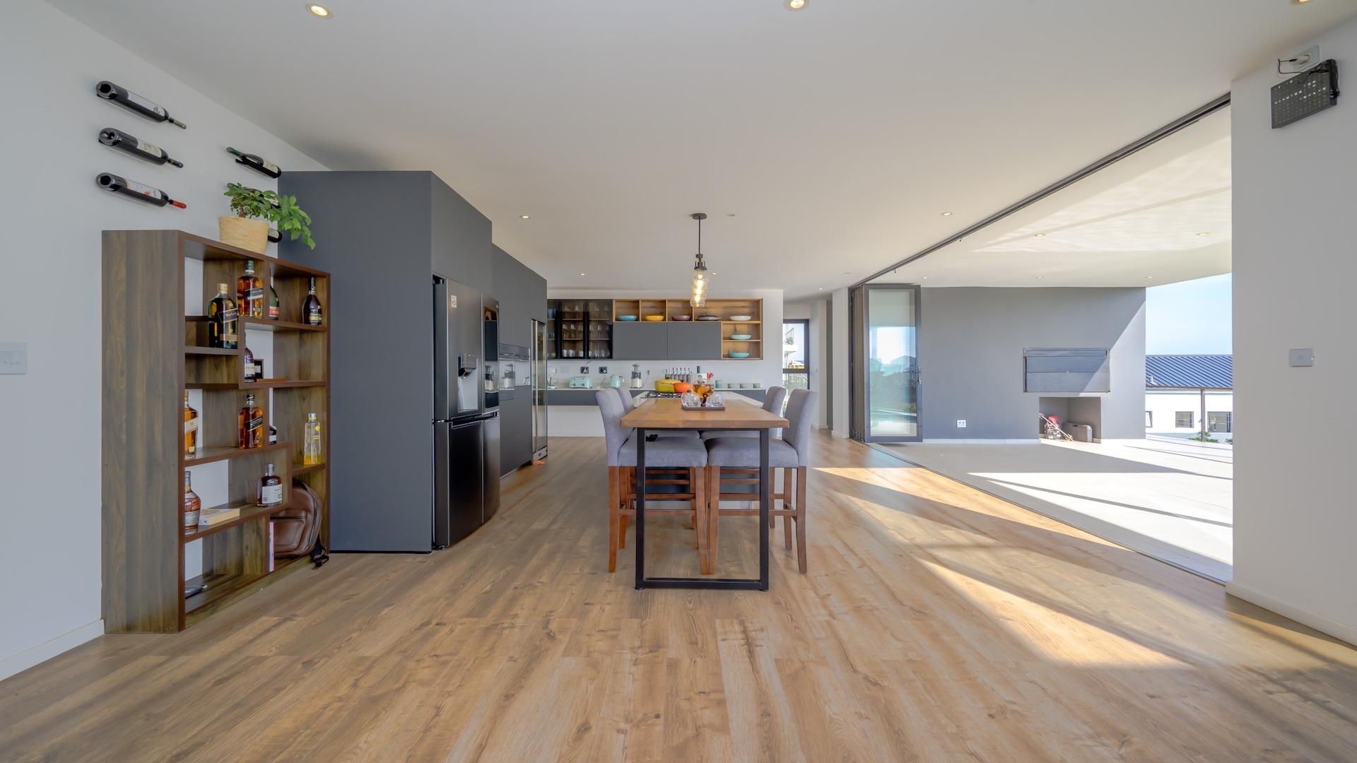 The home’s designer kitchen forms the centrepiece of the living space and is fitted with high quality appliances. It flows effortlessly into the open plan lounge and dining areas, creating a bright and welcoming environment for everyday living. A separate scullery adds practicality and keeps the kitchen neat and organised. Large sliding doors lead out to a covered patio with a built in braai, overlooking the swimming pool, the perfect setting for entertaining while enjoying beautiful sunset views.