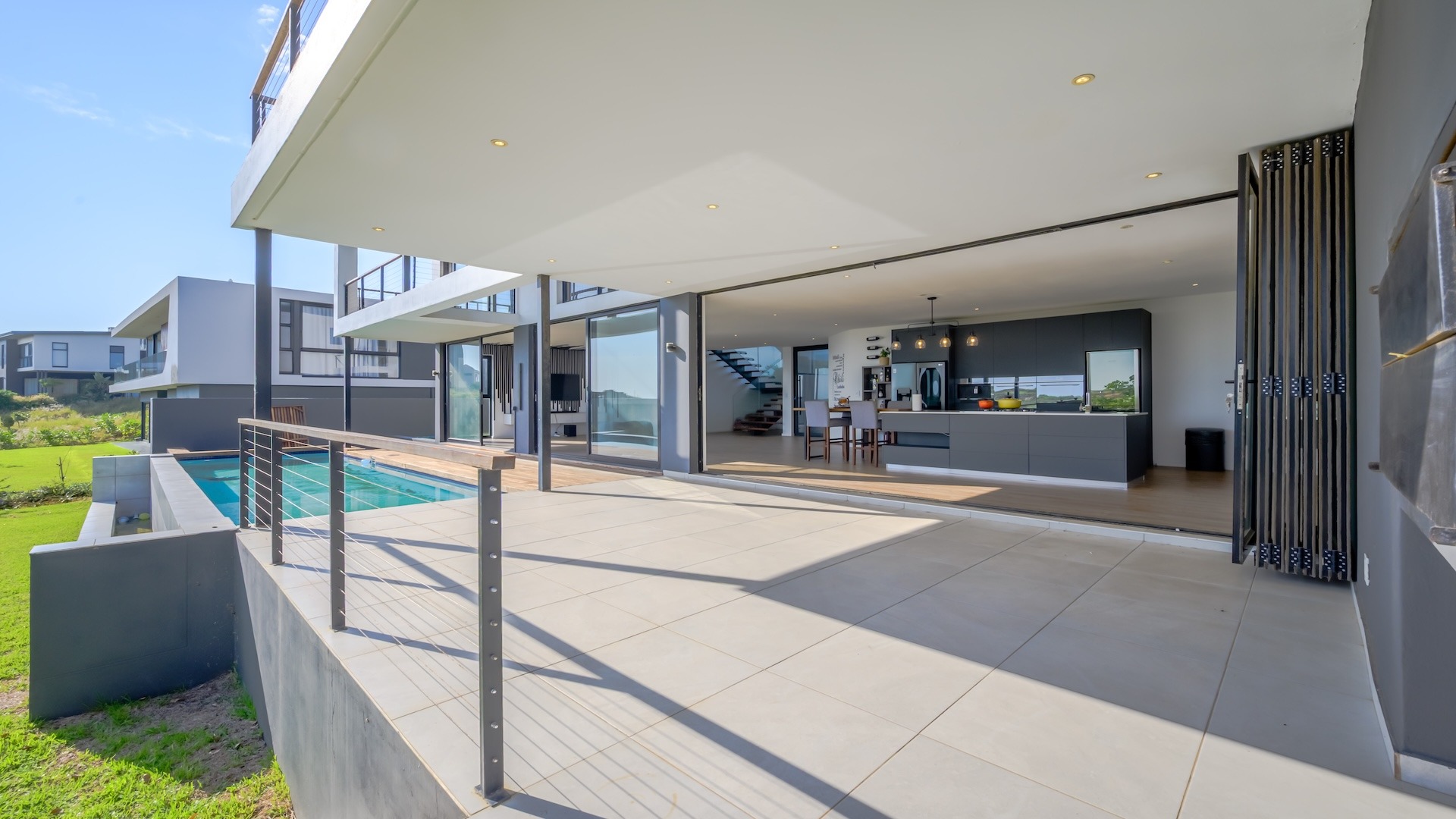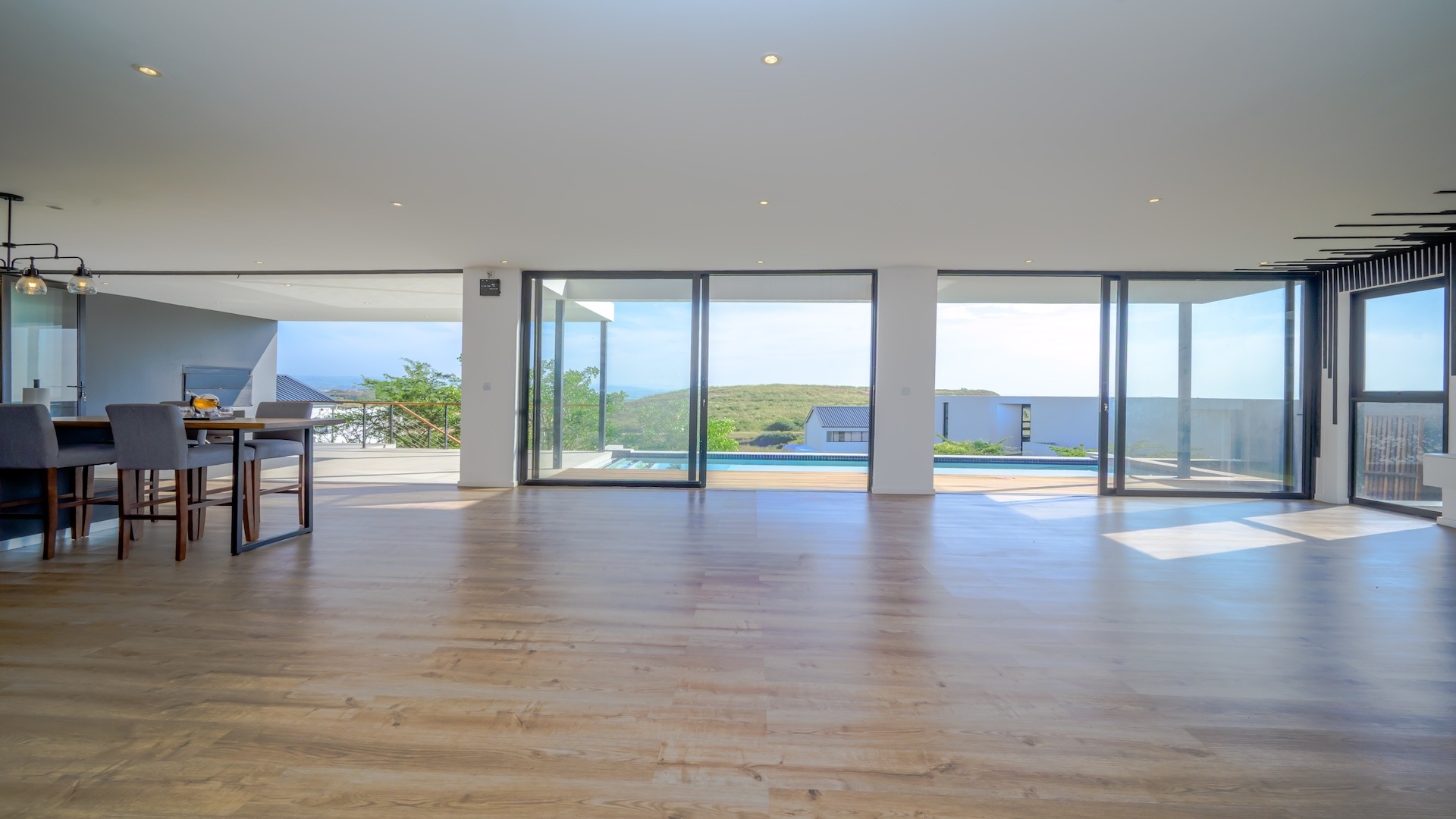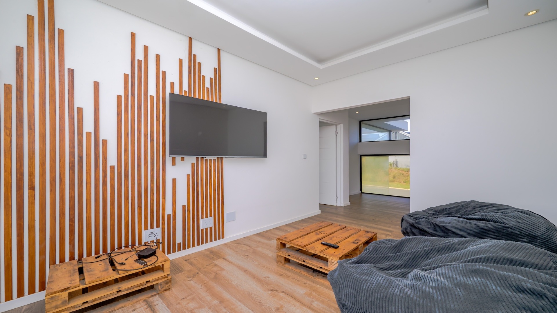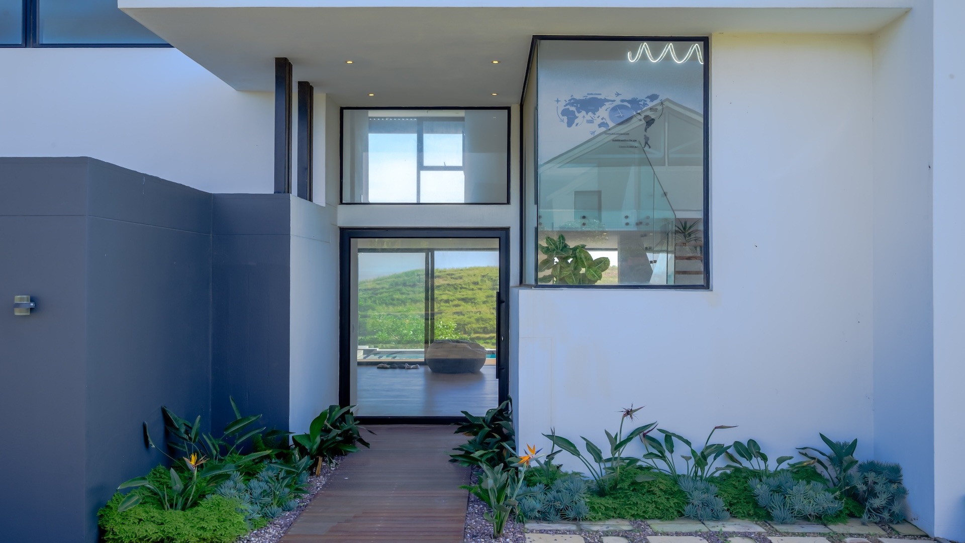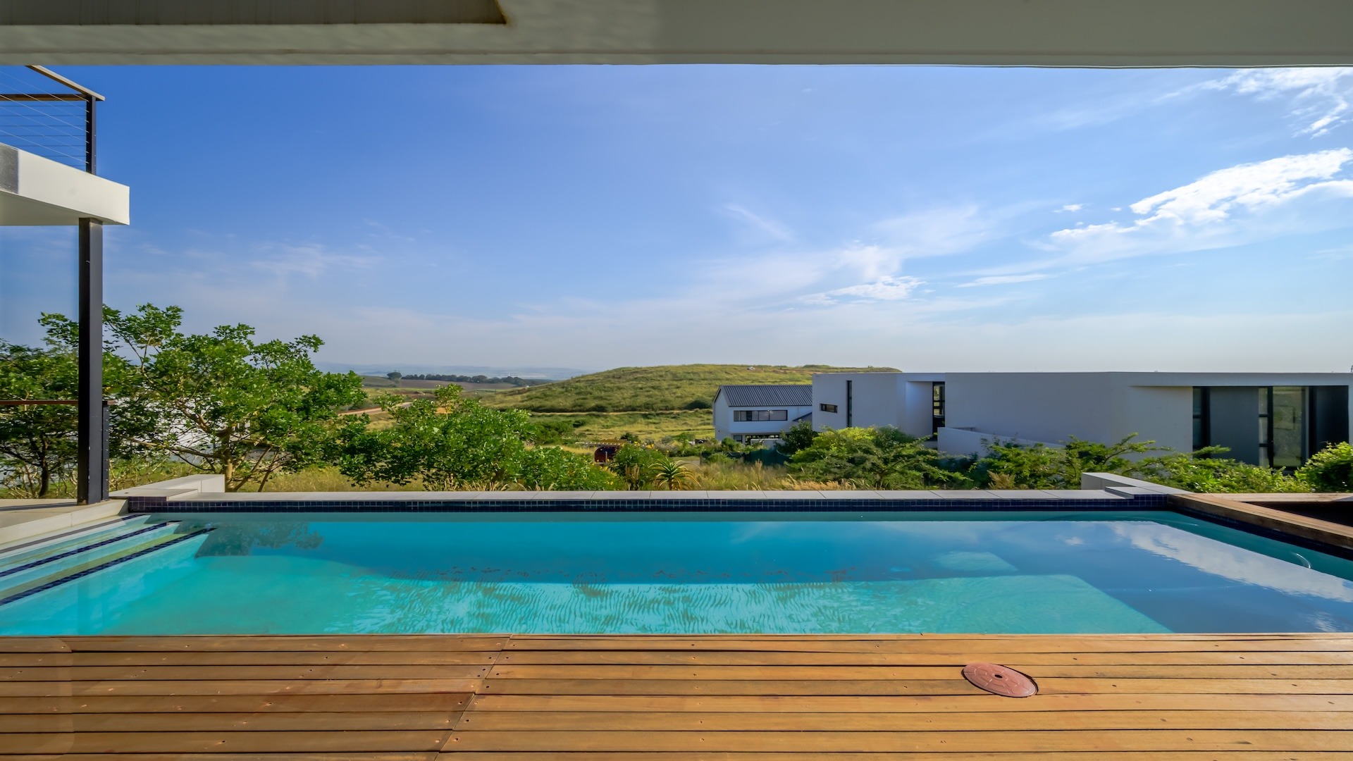 The home’s designer kitchen forms the centrepiece of the living space and is fitted with high quality appliances. It flows effortlessly into the open plan lounge and dining areas, creating a bright and welcoming environment for everyday living. A separate scullery adds practicality and keeps the kitchen neat and organised. Large sliding doors lead out to a covered patio with a built in braai, overlooking the swimming pool, the perfect setting for entertaining while enjoying beautiful sunset views.