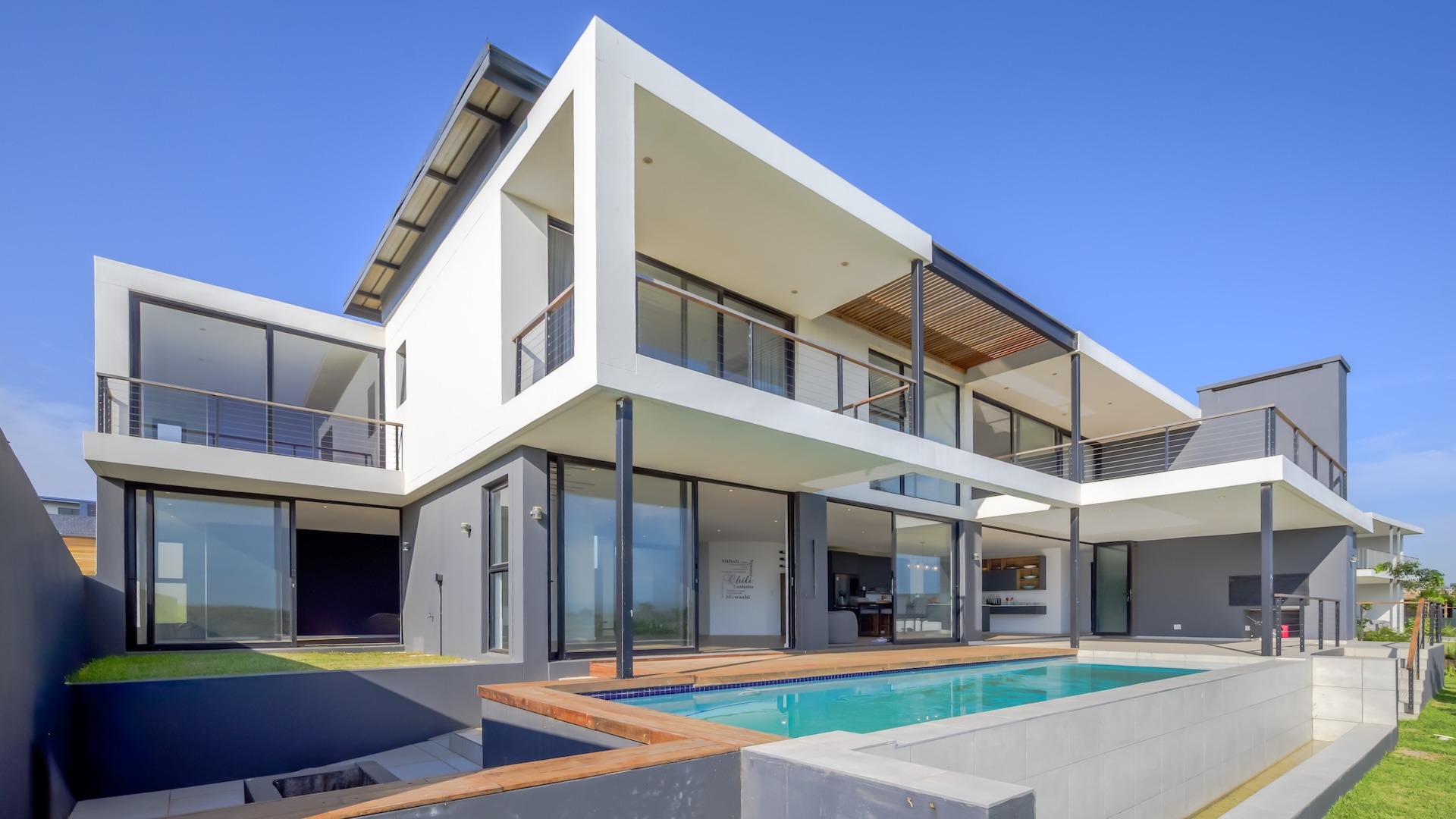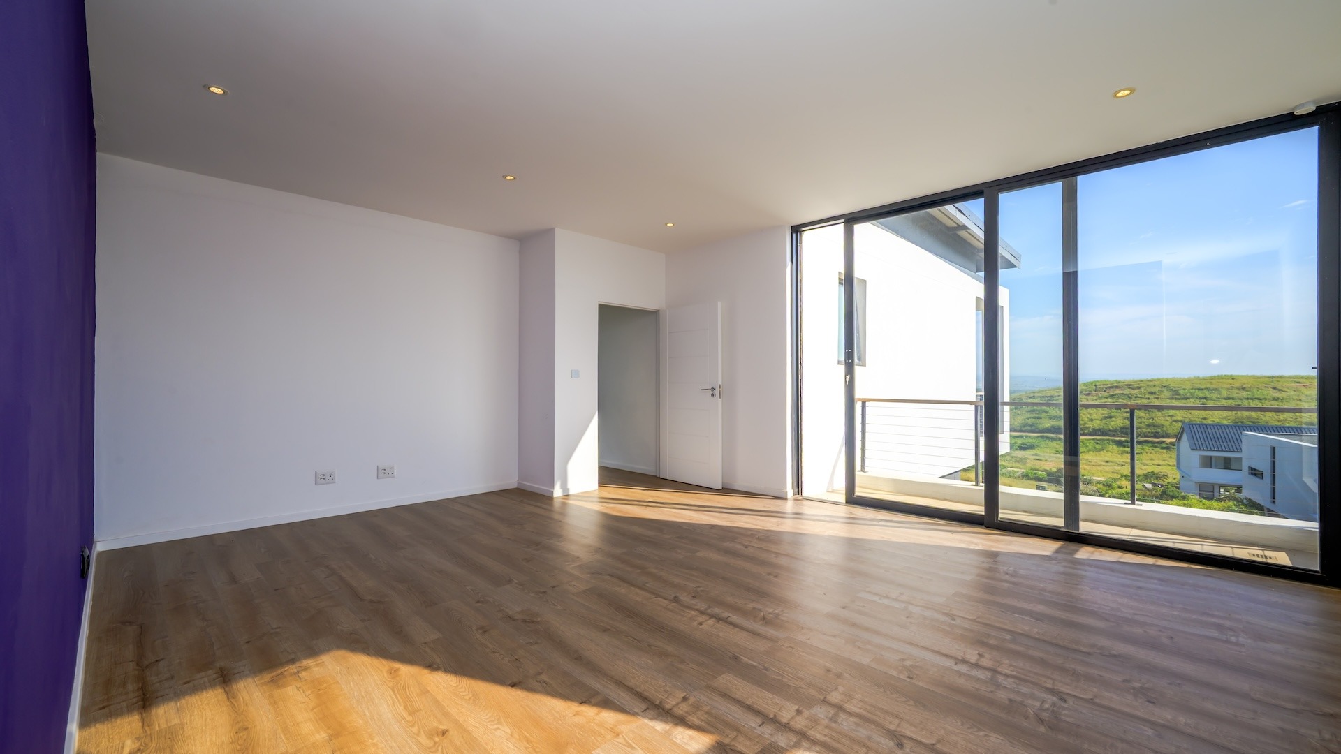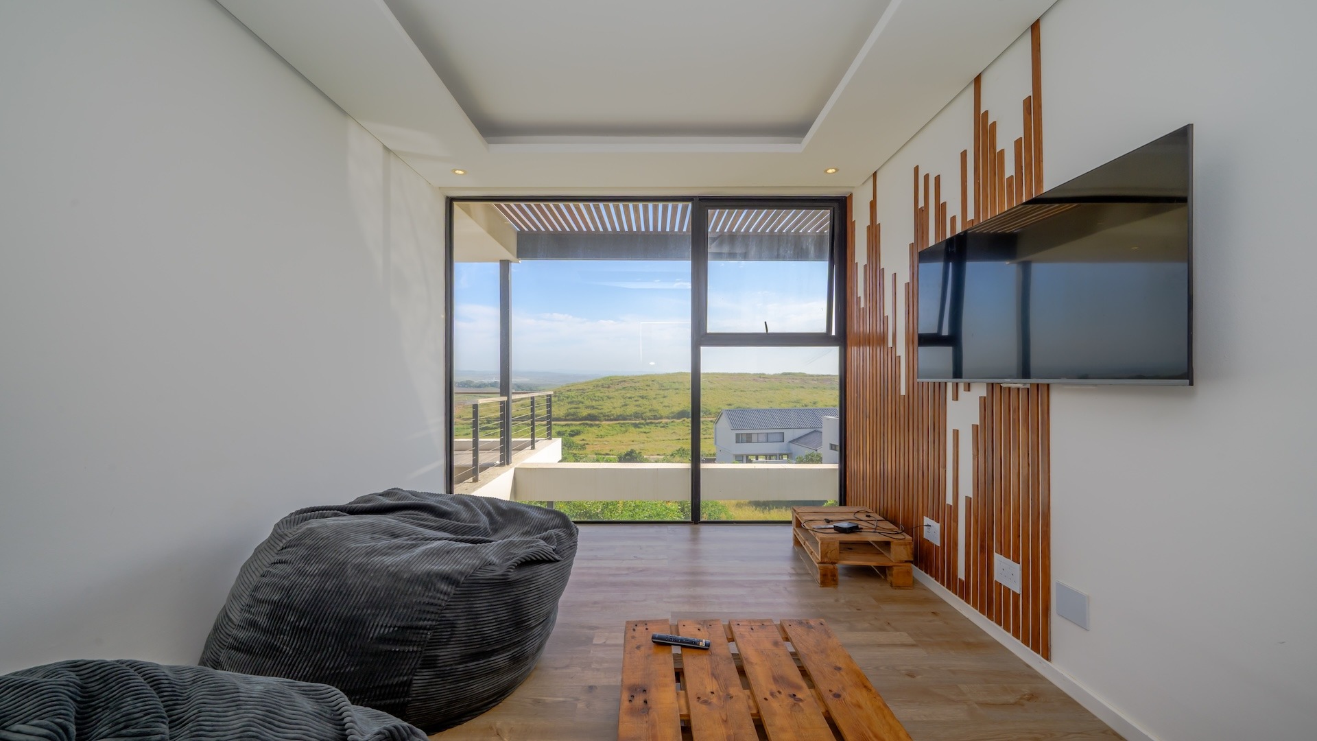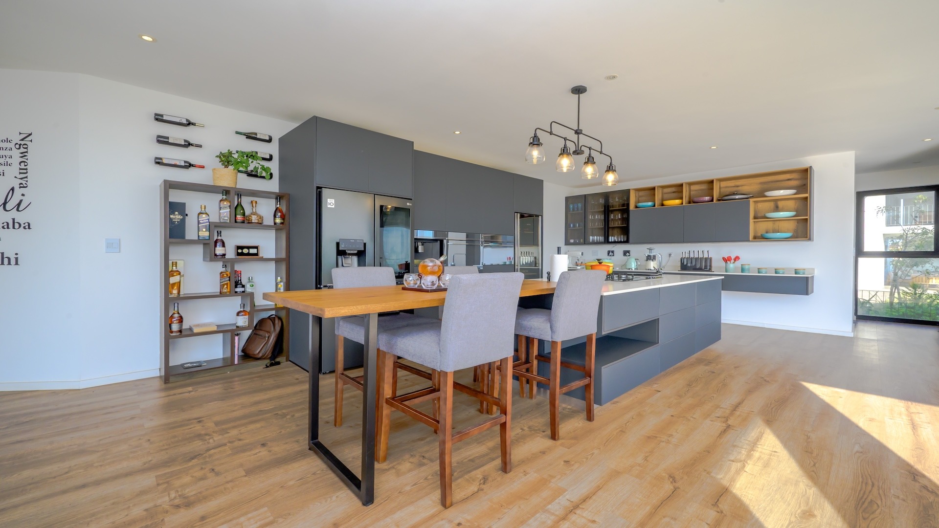 The home’s designer kitchen forms the centrepiece of the living space and is fitted with high quality appliances. It flows effortlessly into the open plan lounge and dining areas, creating a bright and welcoming environment for everyday living. A separate scullery adds practicality and keeps the kitchen neat and organised. Large sliding doors lead out to a covered patio with a built in braai, overlooking the swimming pool, the perfect setting for entertaining while enjoying beautiful sunset views.