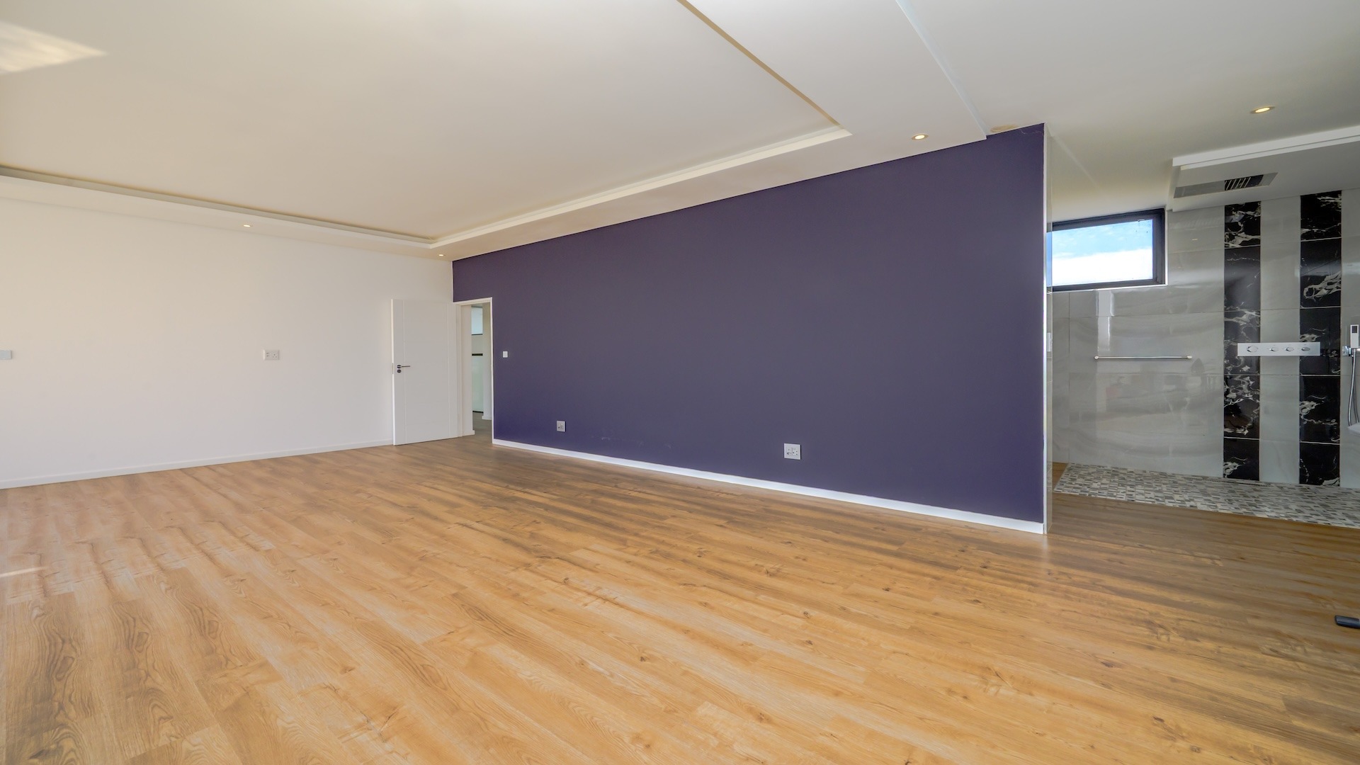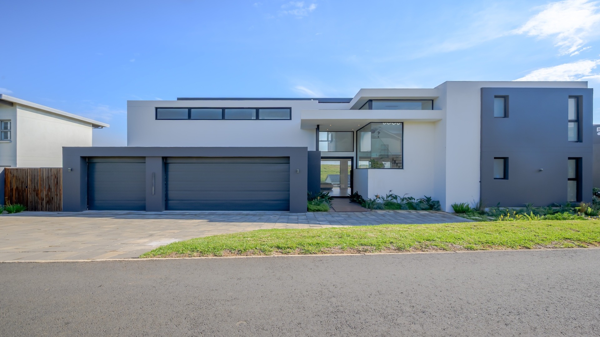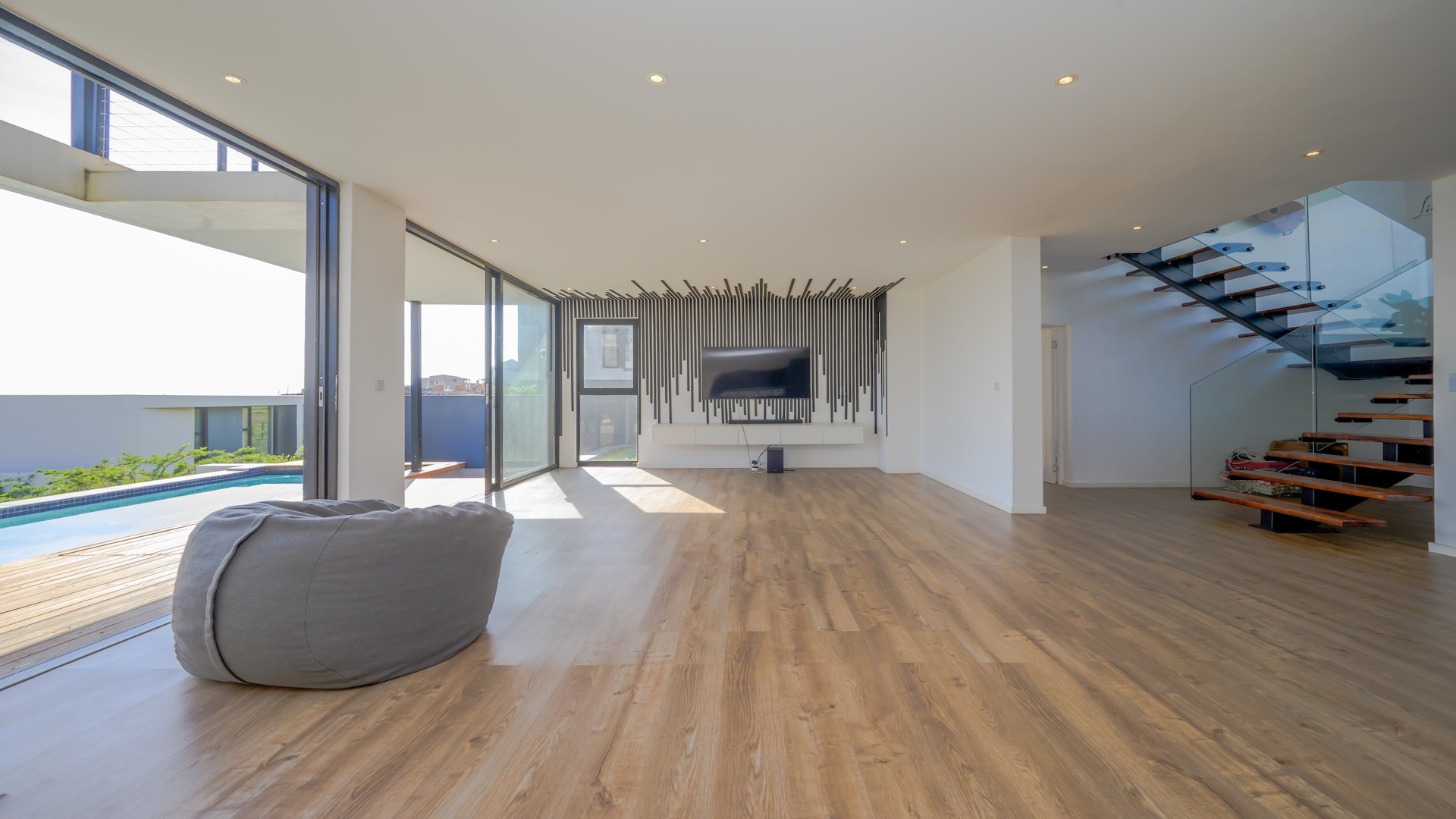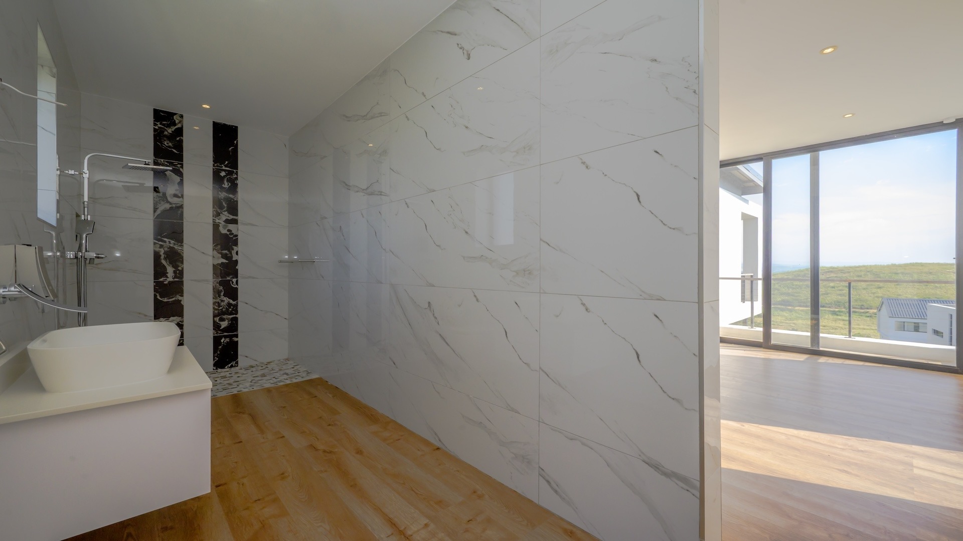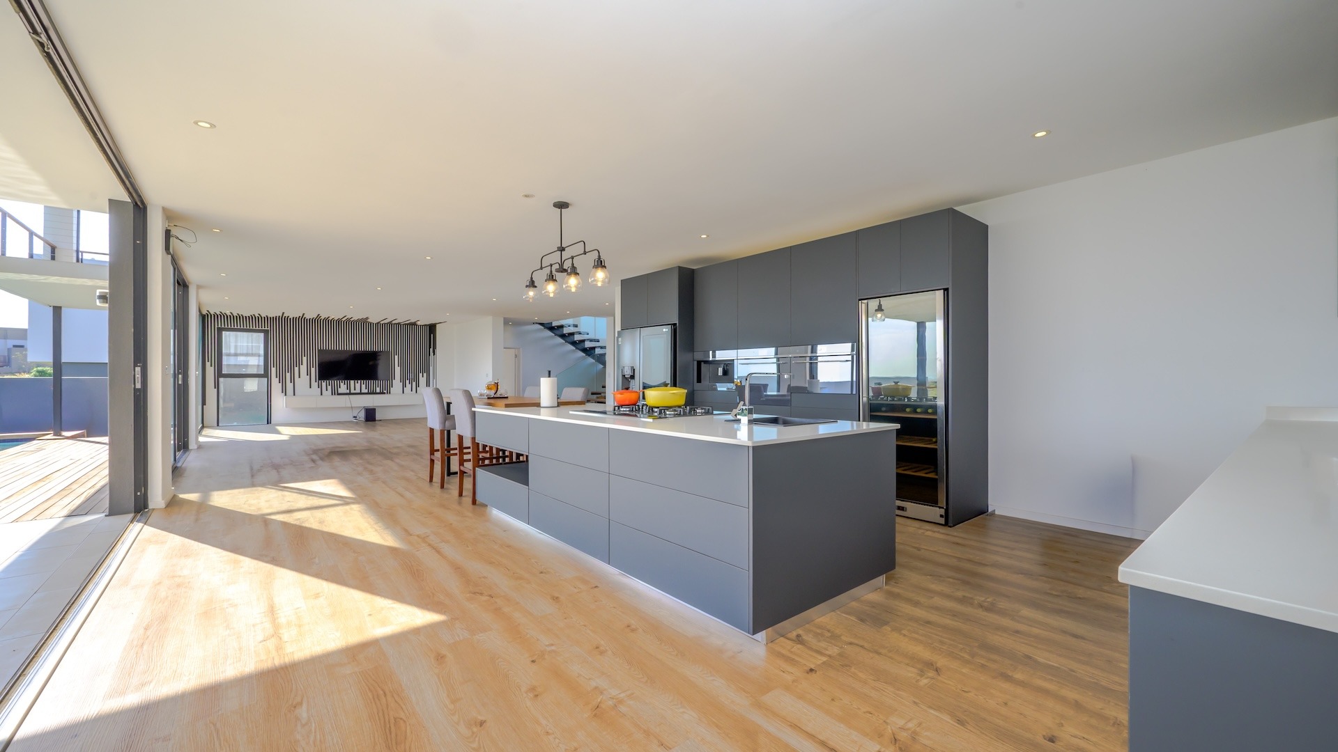 The home’s designer kitchen forms the centrepiece of the living space and is fitted with high quality appliances. It flows effortlessly into the open plan lounge and dining areas, creating a bright and welcoming environment for everyday living. A separate scullery adds practicality and keeps the kitchen neat and organised. Large sliding doors lead out to a covered patio with a built in braai, overlooking the swimming pool, the perfect setting for entertaining while enjoying beautiful sunset views.