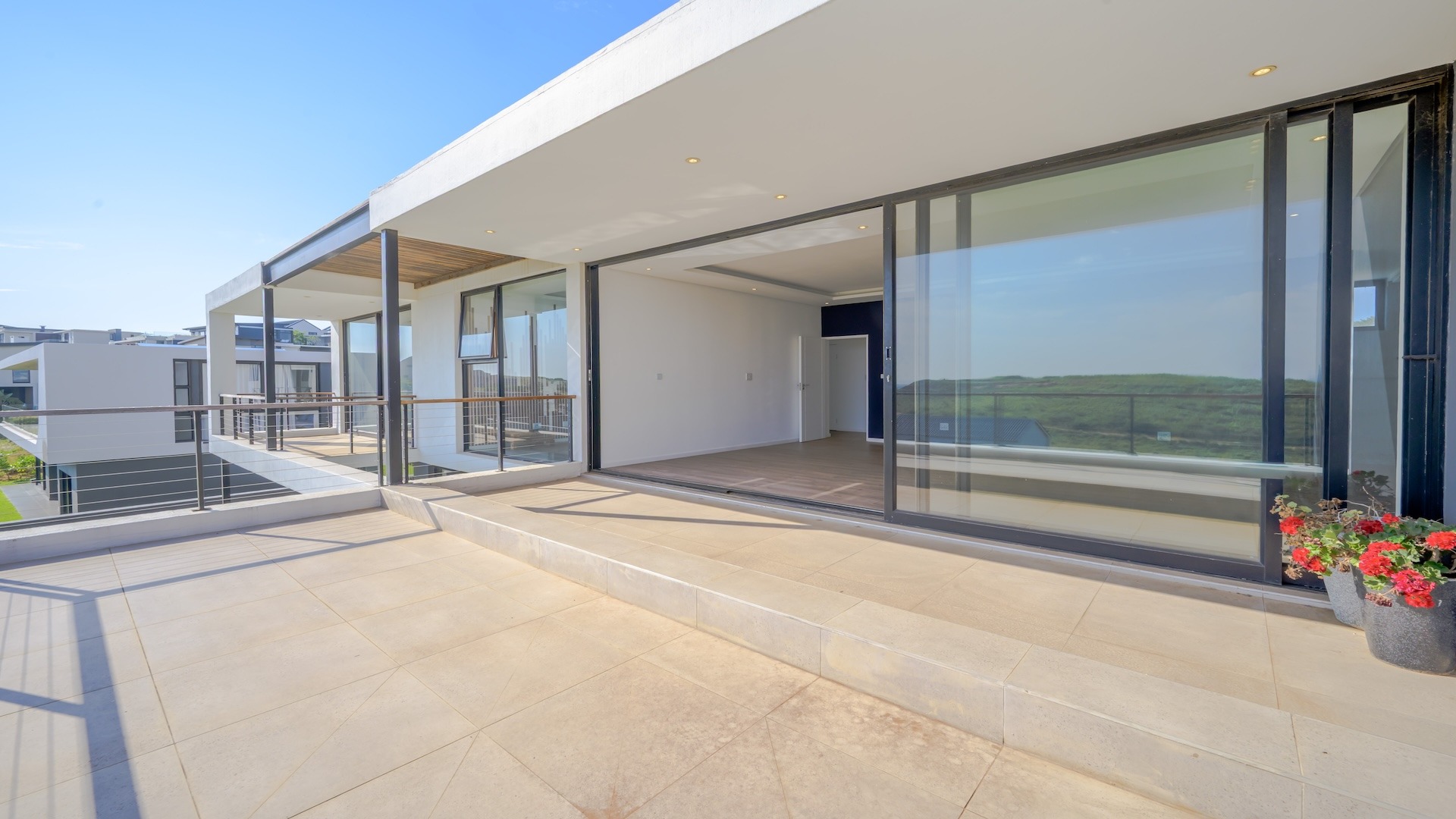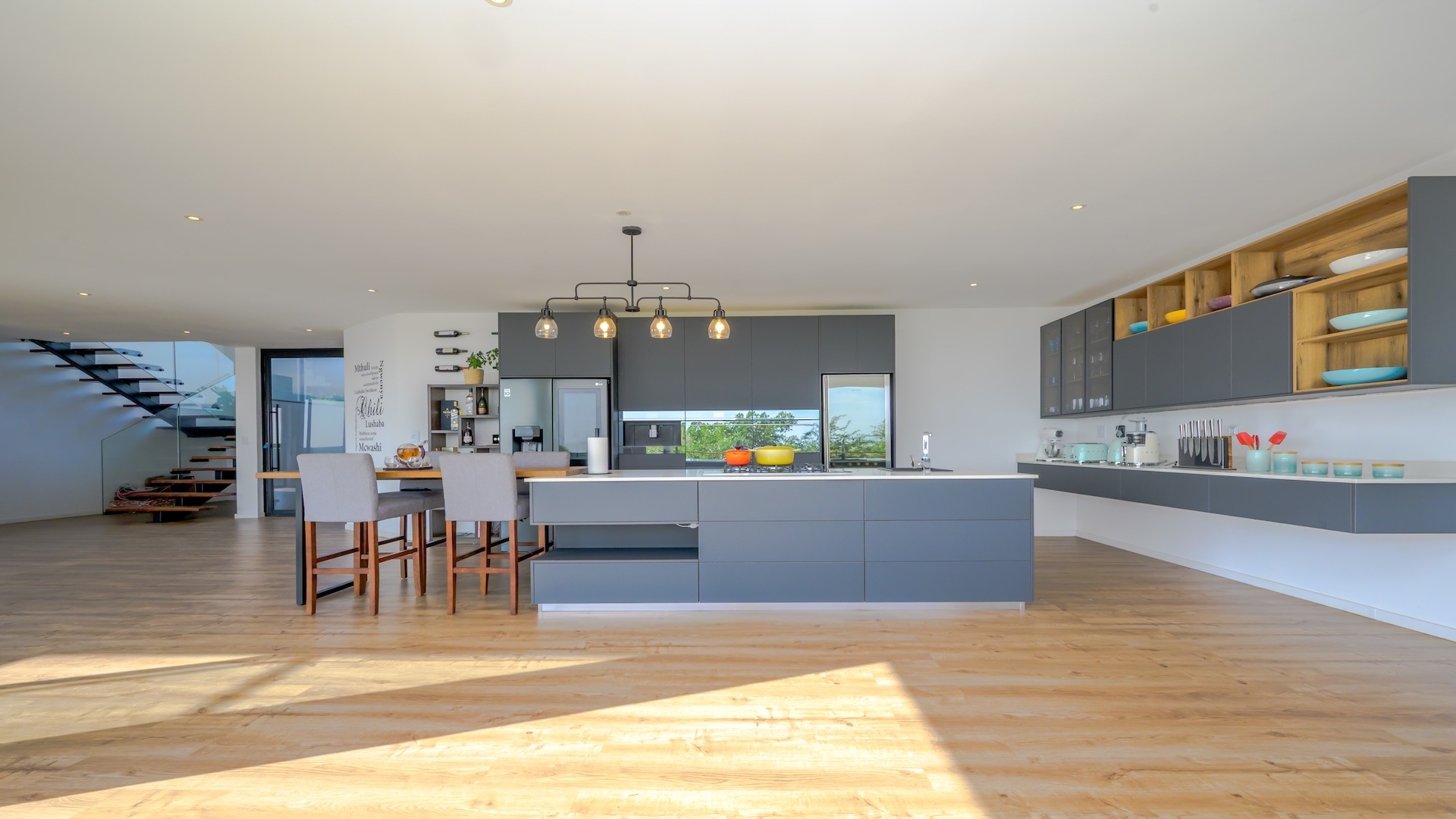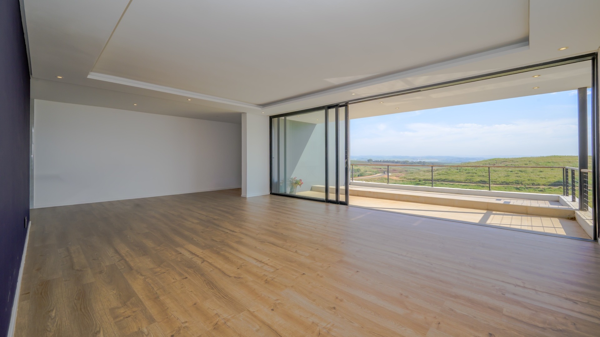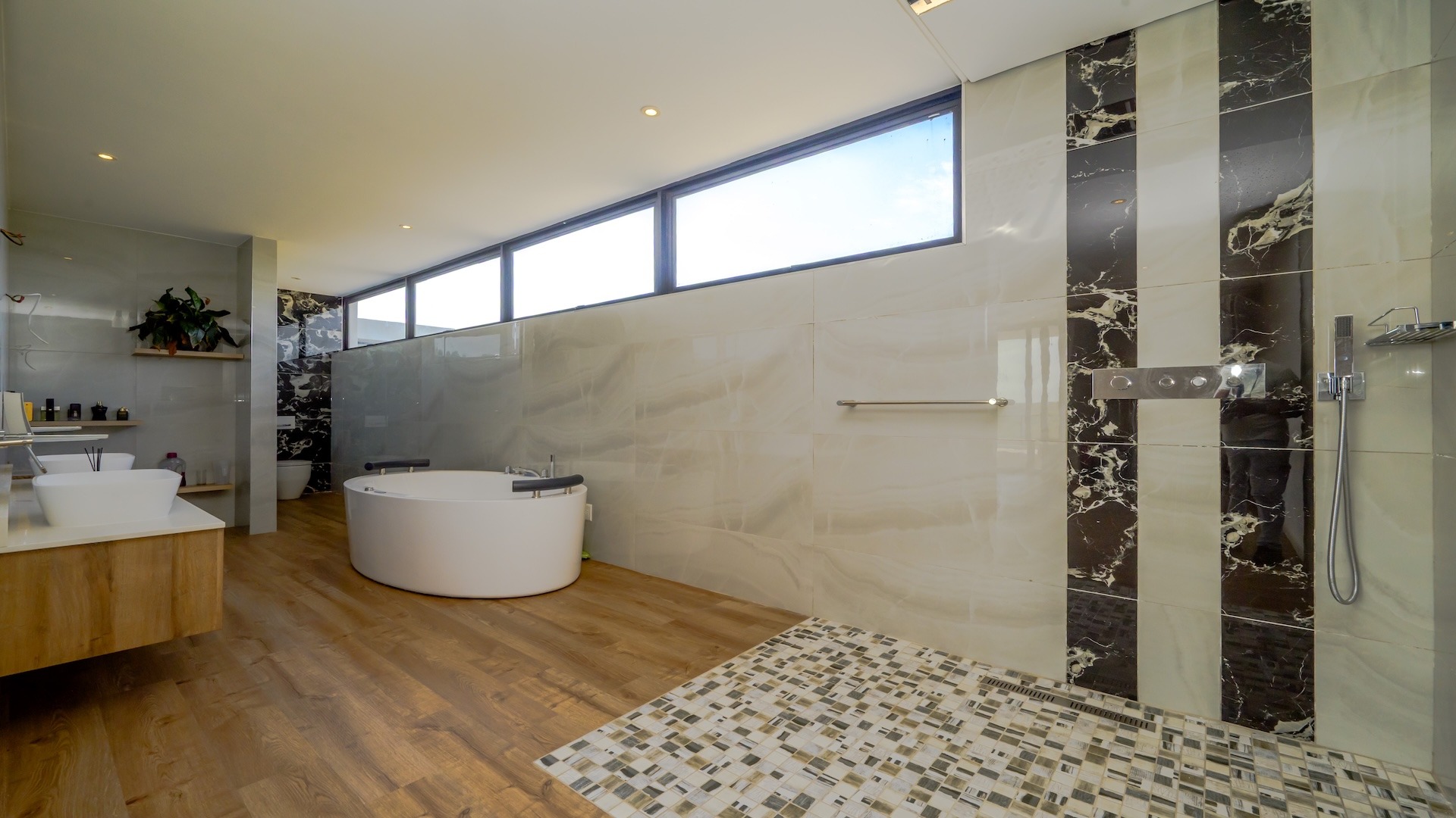 The home’s designer kitchen forms the centrepiece of the living space and is fitted with high quality appliances. It flows effortlessly into the open plan lounge and dining areas, creating a bright and welcoming environment for everyday living. A separate scullery adds practicality and keeps the kitchen neat and organised. Large sliding doors lead out to a covered patio with a built in braai, overlooking the swimming pool, the perfect setting for entertaining while enjoying beautiful sunset views.