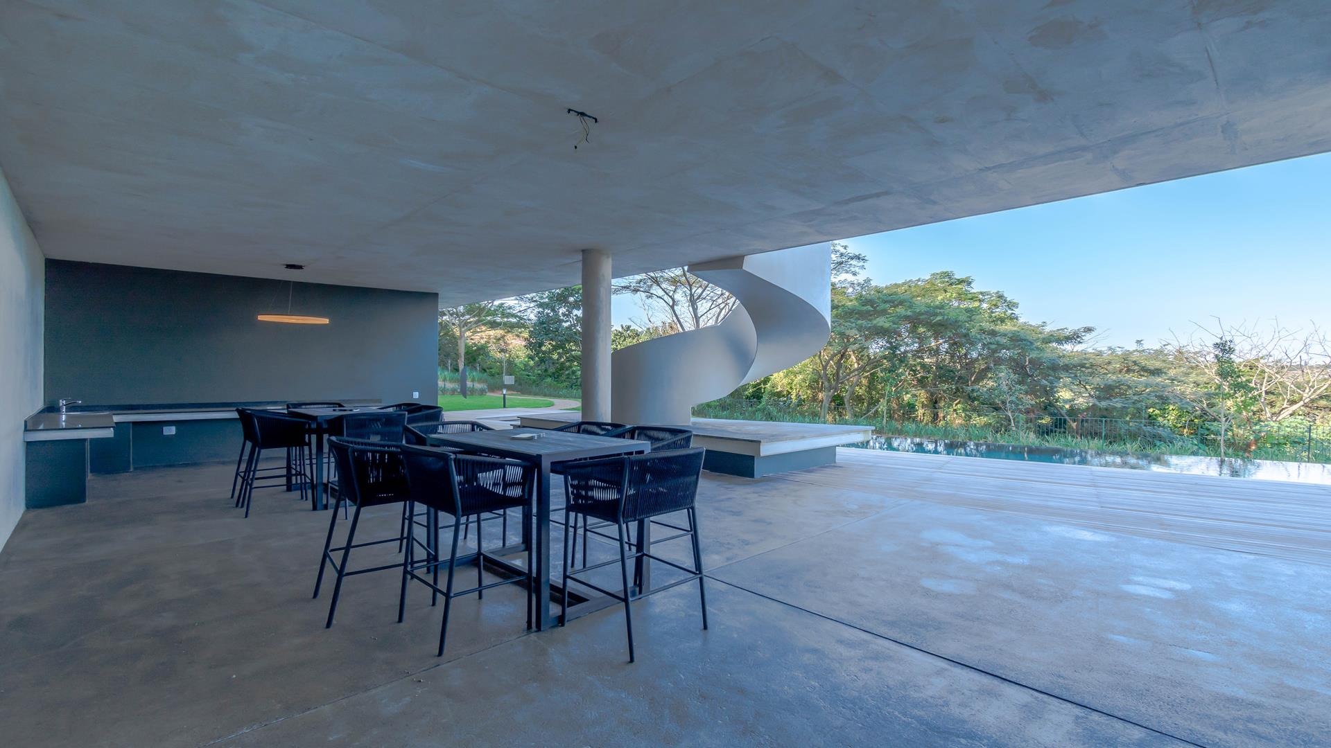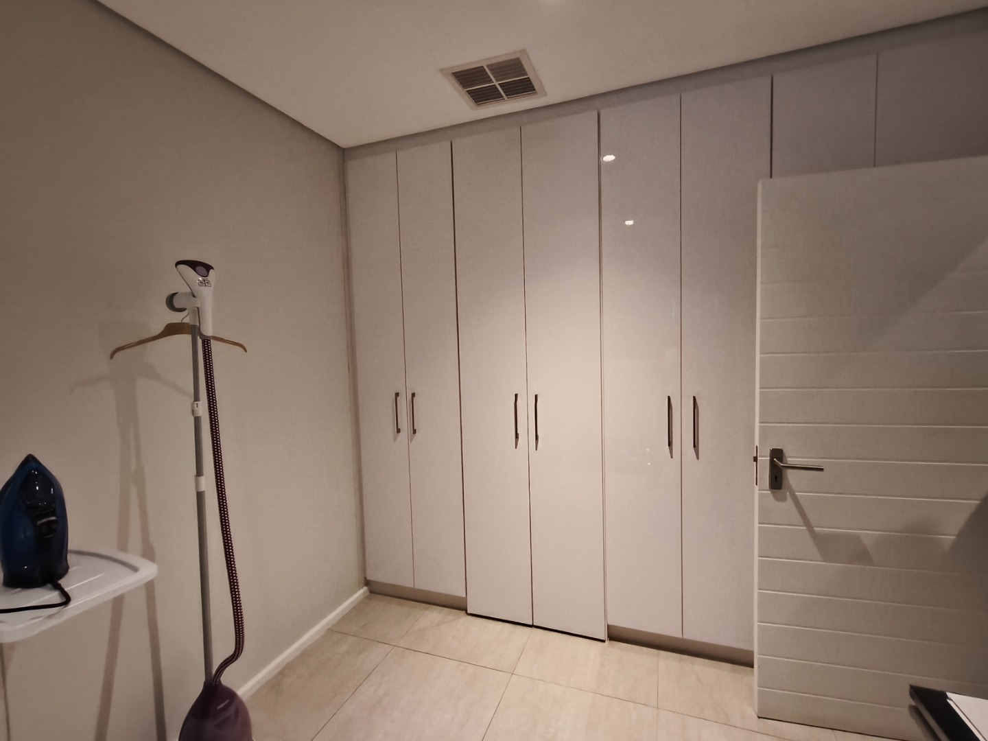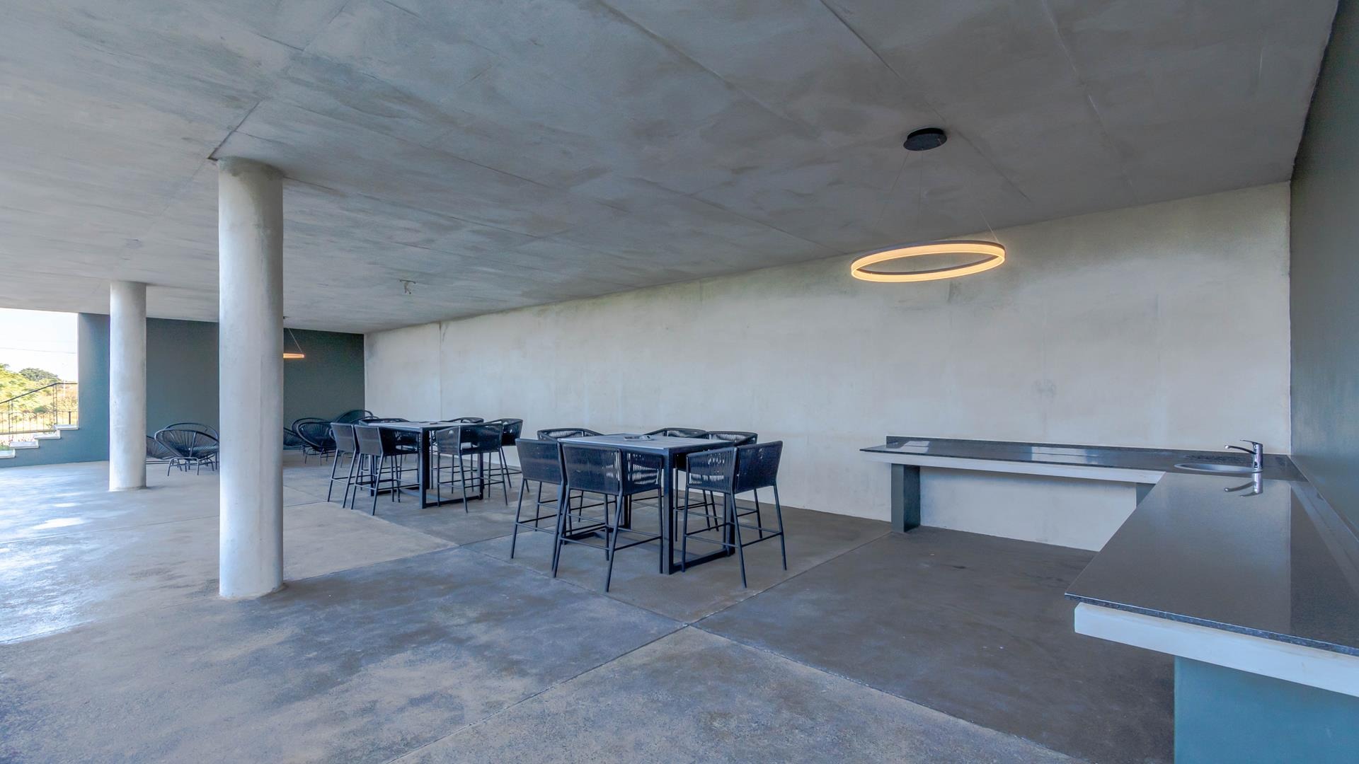 The open-plan living room and high-gloss kitchen lead to a balcony with views of the greenbelt.