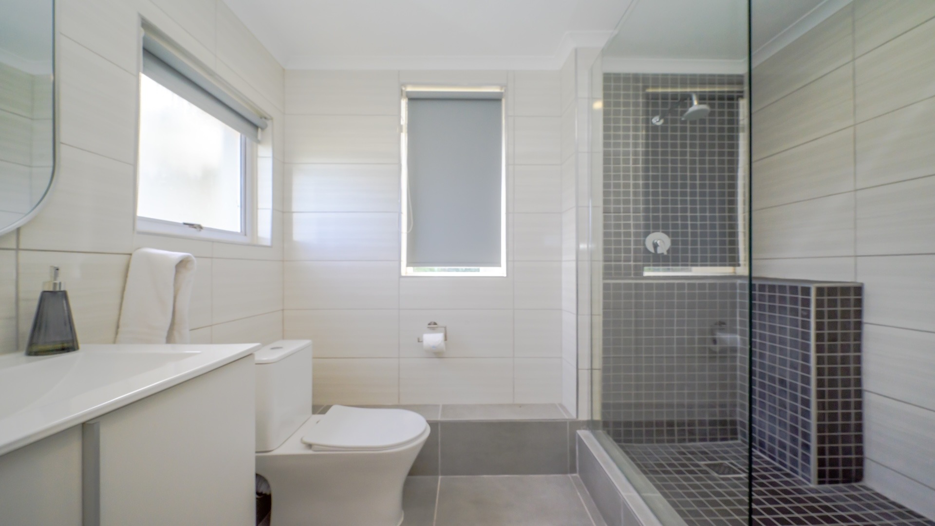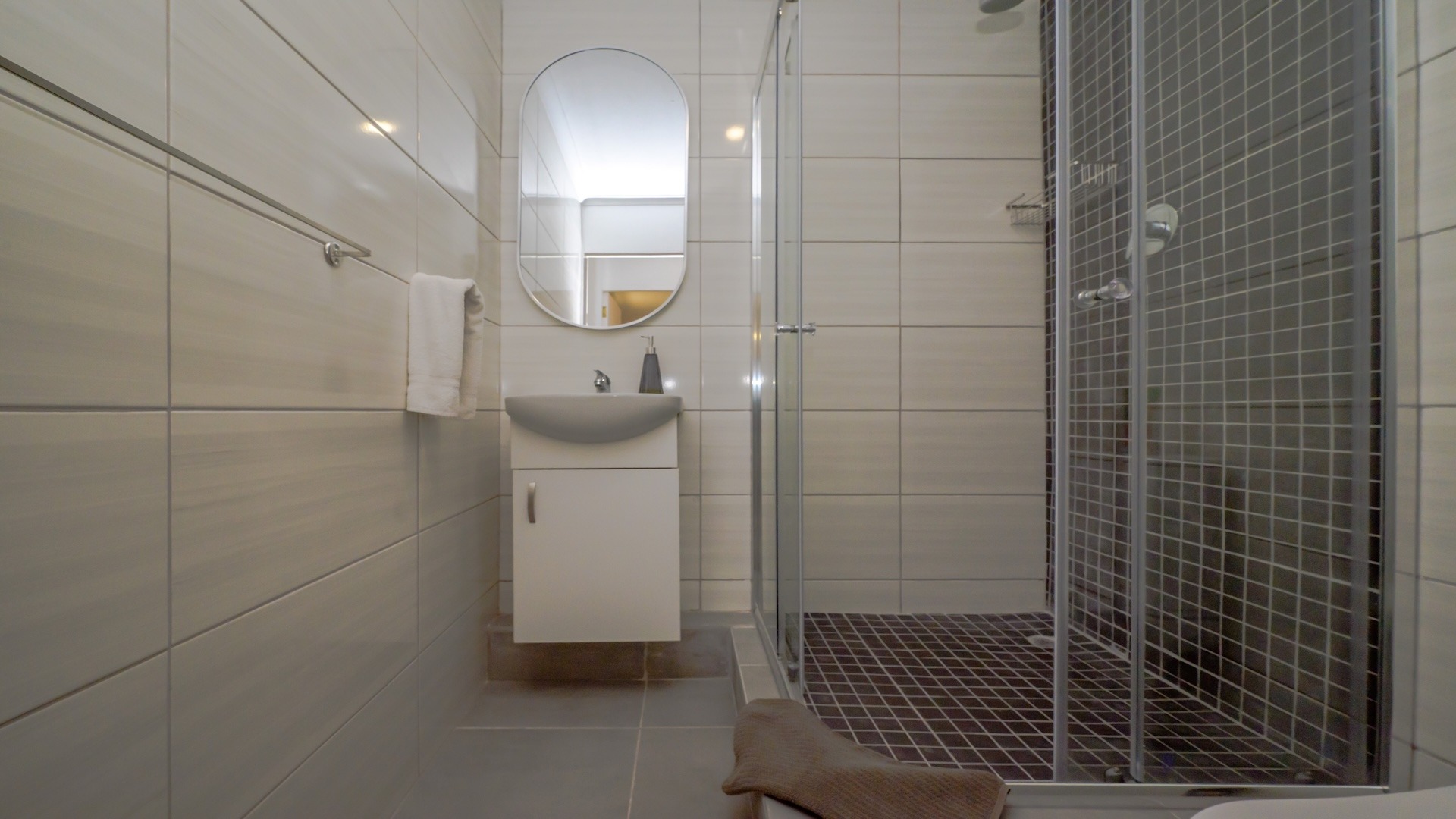 The bathrooms have been redone with a lovely fresh look, one featuring a bath with an overhead shower, the other a nice big shower.