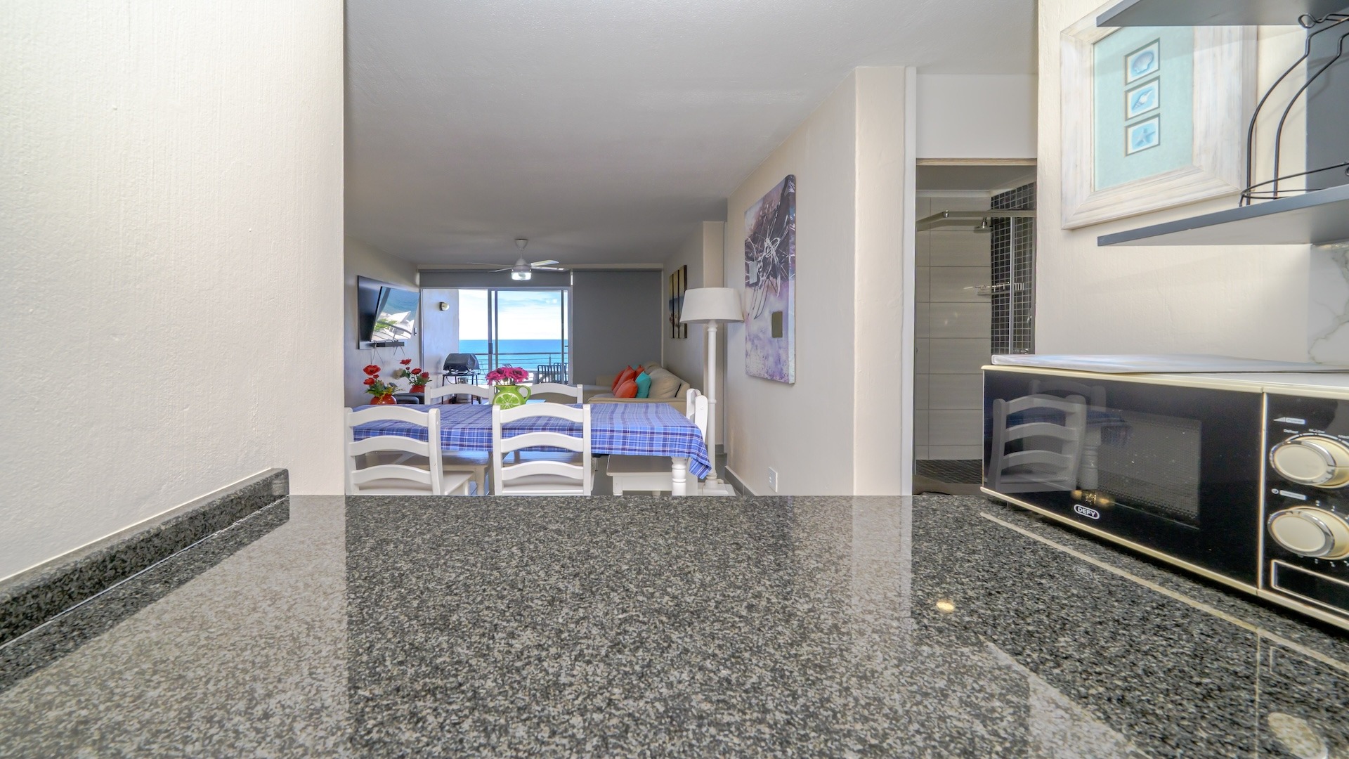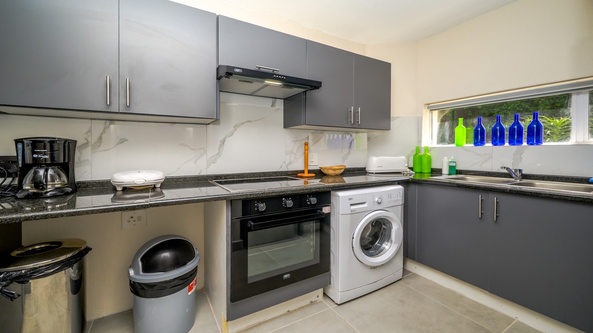 The functional kitchen is well-equipped with essential appliances and provides generous cabinet storage, complemented by a convenient breakfast bar.