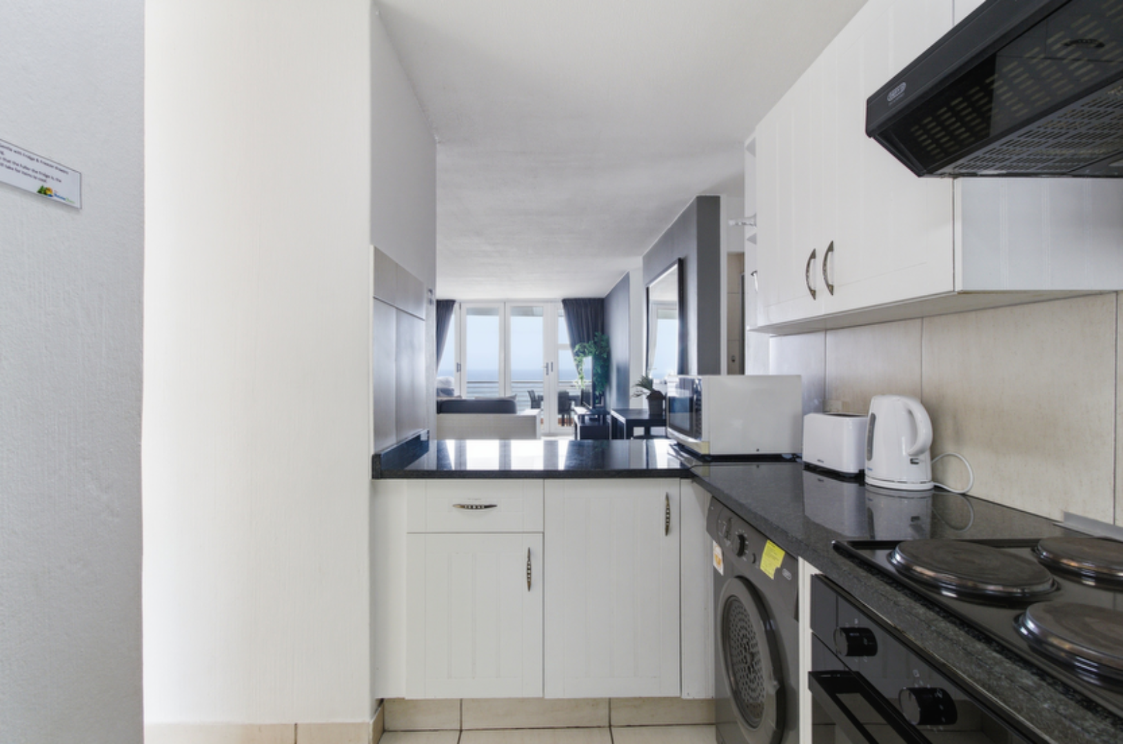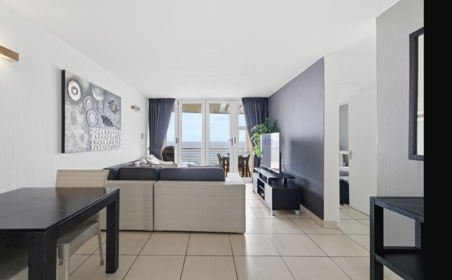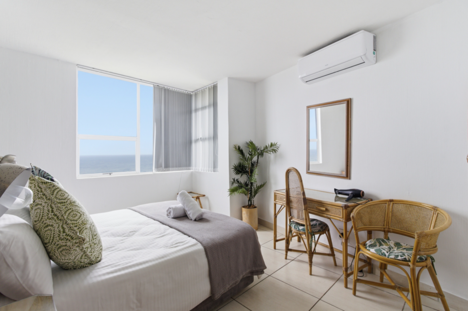The home features three bedrooms and two bathrooms, with two bedrooms enjoying sea views, including a well-appointed main suite. The open-plan living space is light, contemporary, and air-conditioned, flowing seamlessly into a open kitchen with ample storage and a breakfast counter. A covered patio extends from the living area, creating the ideal space to unwind, entertain, and enjoy sea breeze.