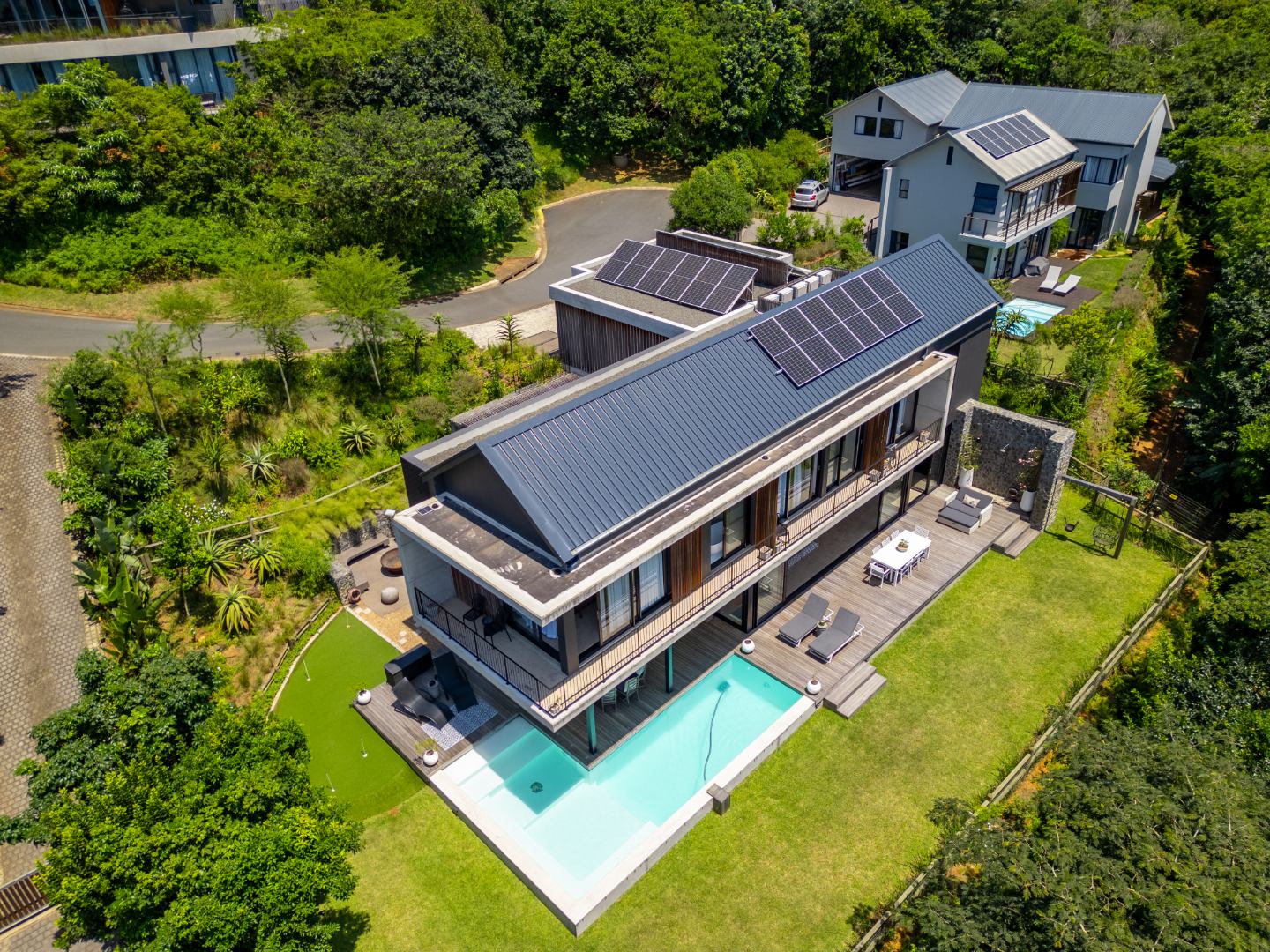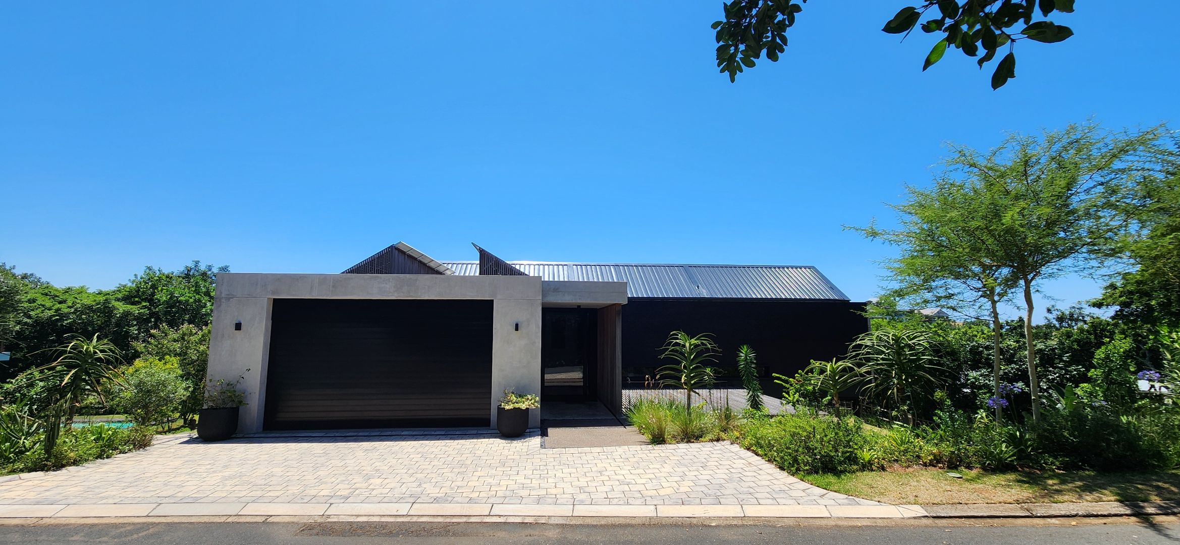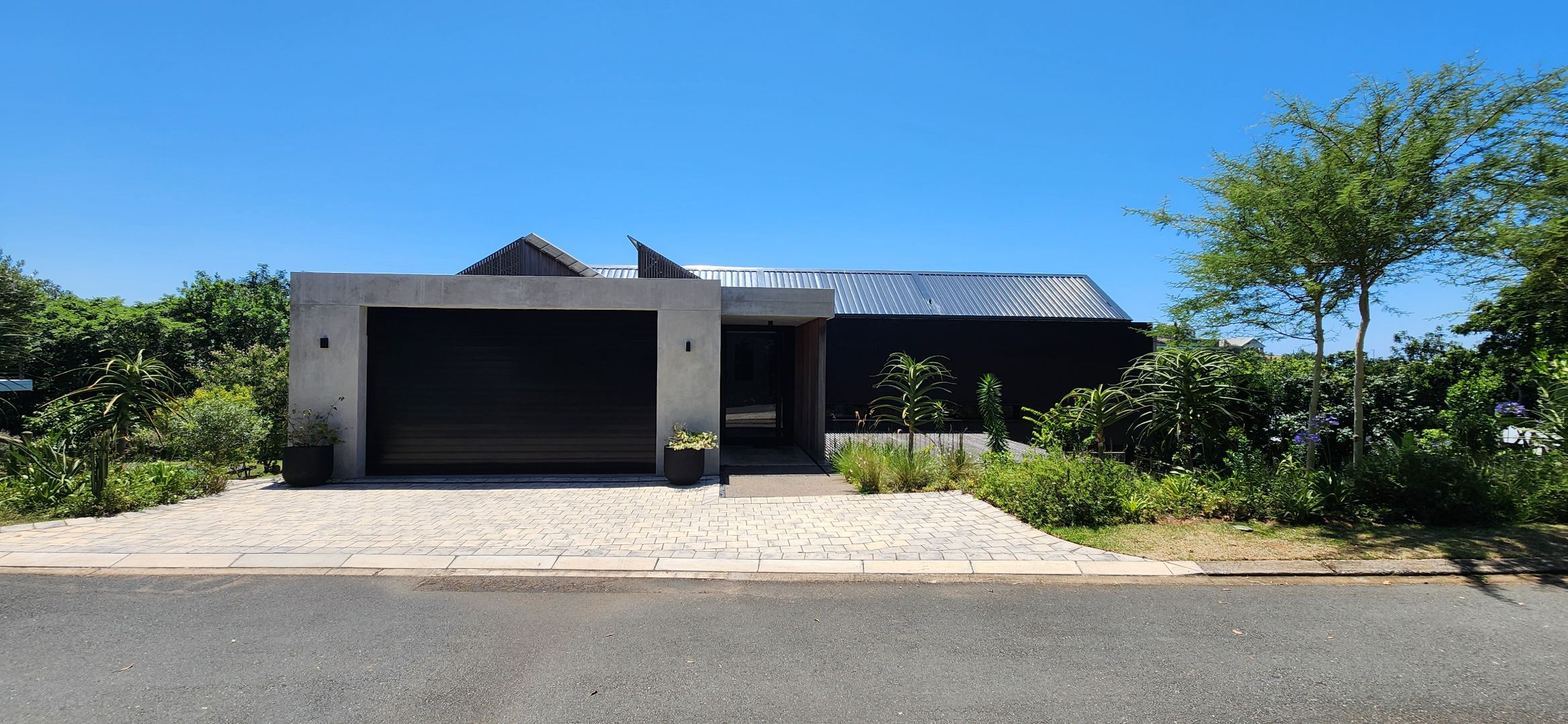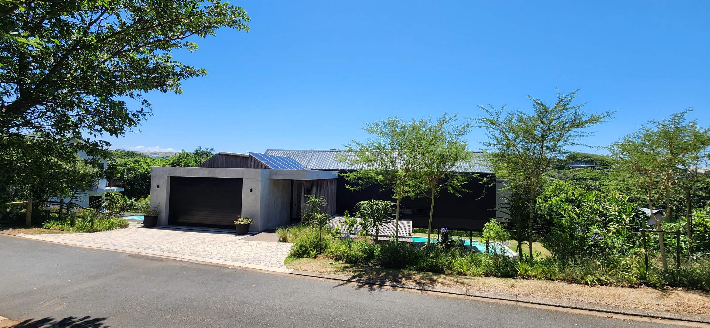 This Designer home is a contemporary masterpiece. Polished concrete floors and a striking designer black kitchen with integrated appliances anchor the open-plan living spaces, complemented by electric blinds and seamless flow to the outdoors. Four luxurious bedrooms and four and a half bathrooms, finished with sleek black fixtures and walk-in showers, provide serene retreats. Beyond, a salt-chlorinated pool, expansive deck, built-in braai, pizza oven, fire pit, and putting green create an entertainer’s paradise set within lush, private gardens.