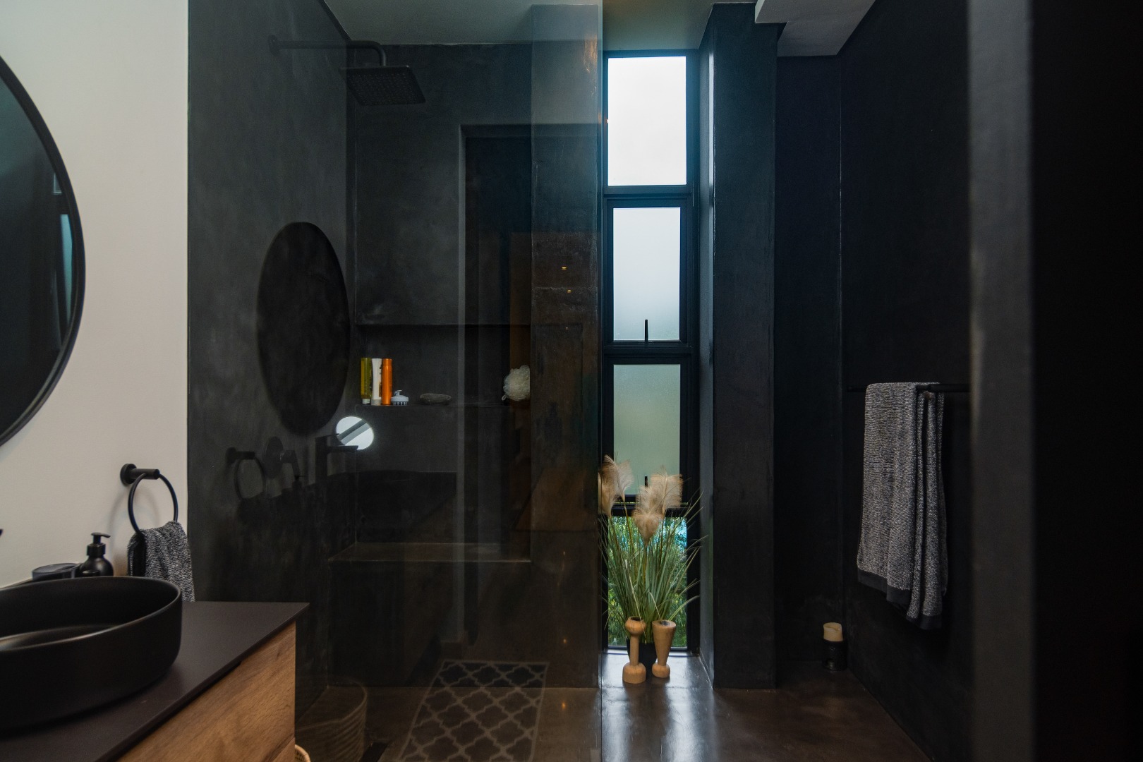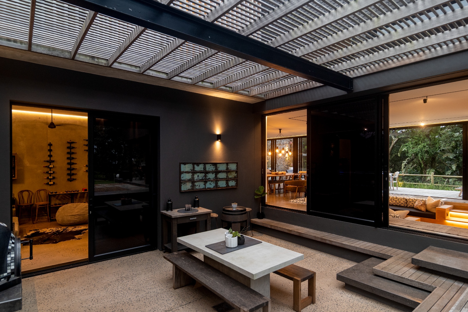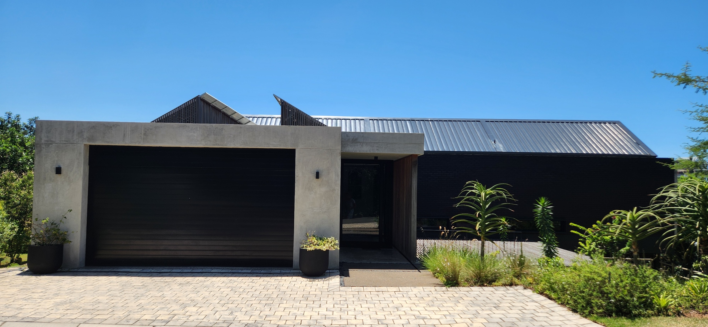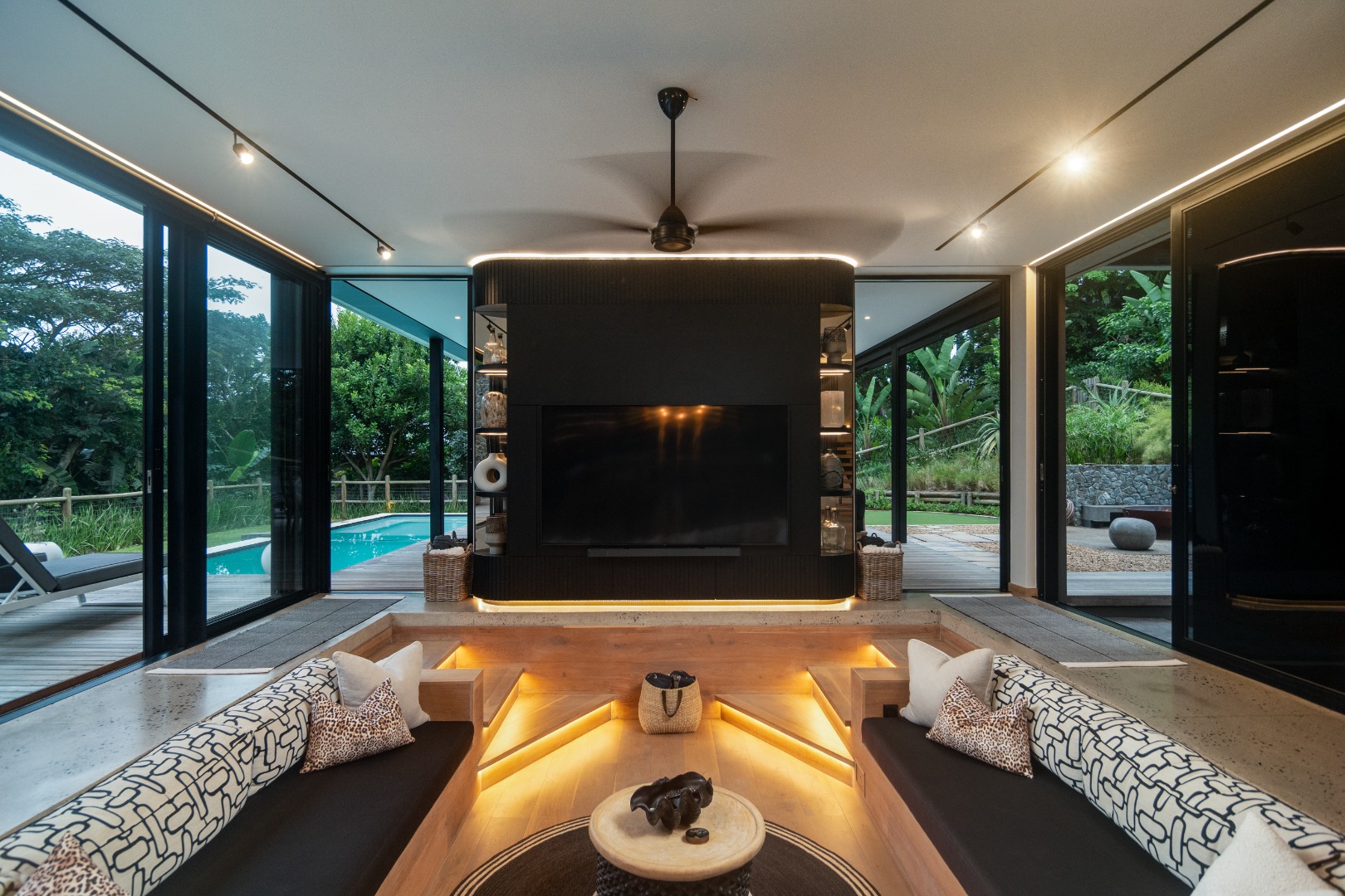 This Designer home is a contemporary masterpiece. Polished concrete floors and a striking designer black kitchen with integrated appliances anchor the open-plan living spaces, complemented by electric blinds and seamless flow to the outdoors. Four luxurious bedrooms and four and a half bathrooms, finished with sleek black fixtures and walk-in showers, provide serene retreats. Beyond, a salt-chlorinated pool, expansive deck, built-in braai, pizza oven, fire pit, and putting green create an entertainer’s paradise set within lush, private gardens.