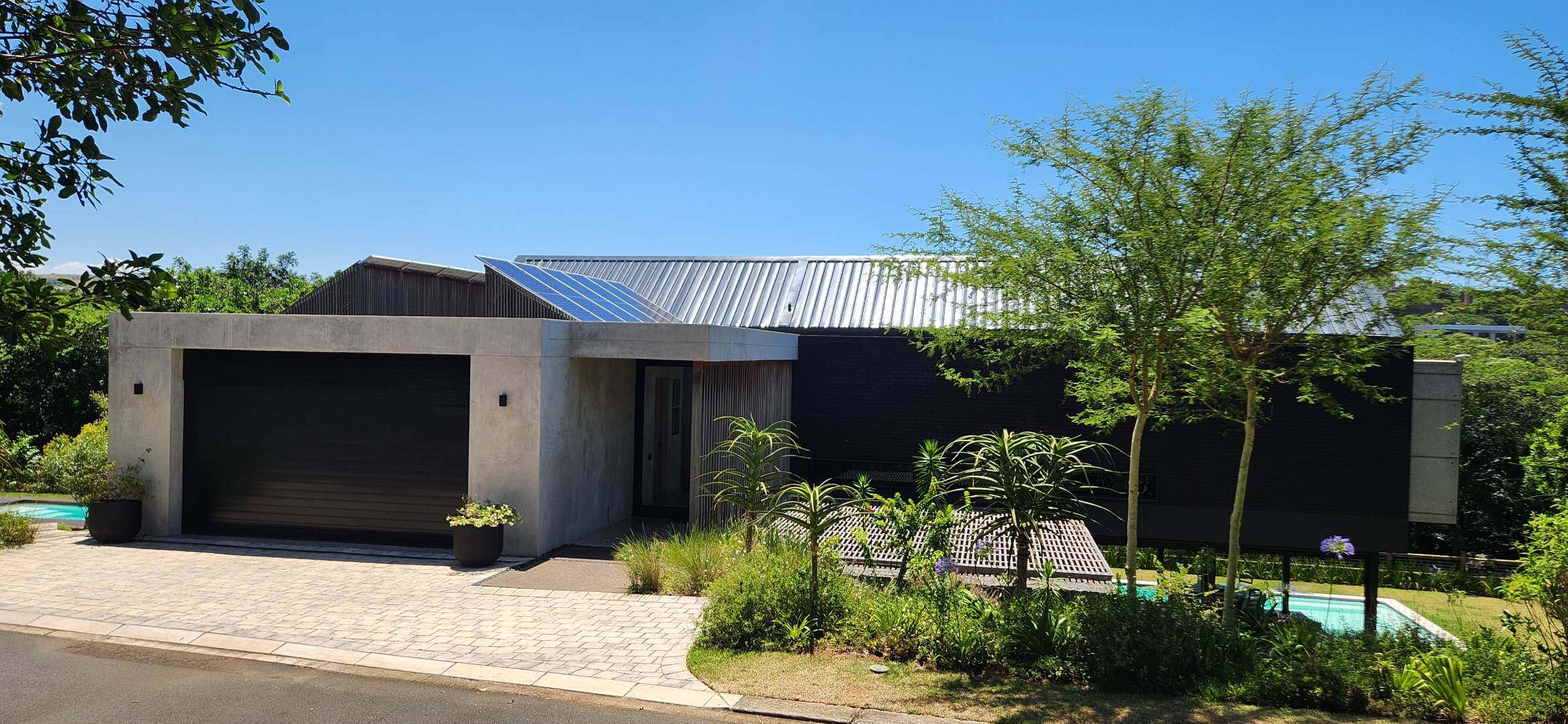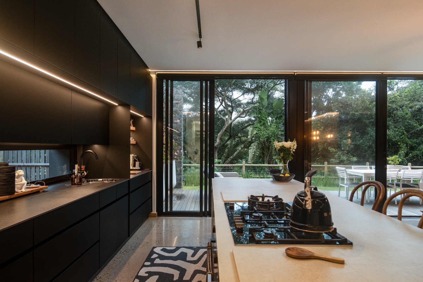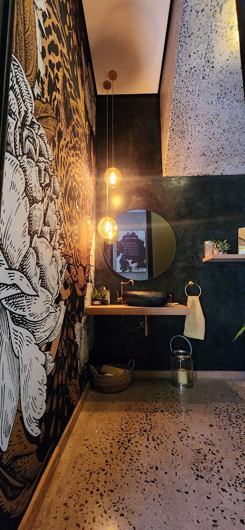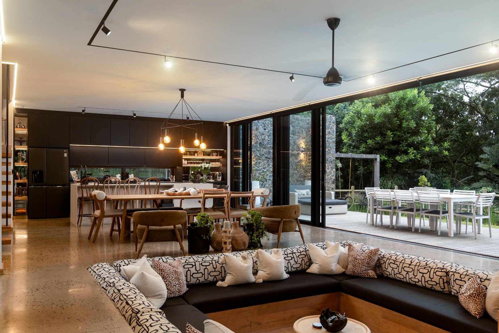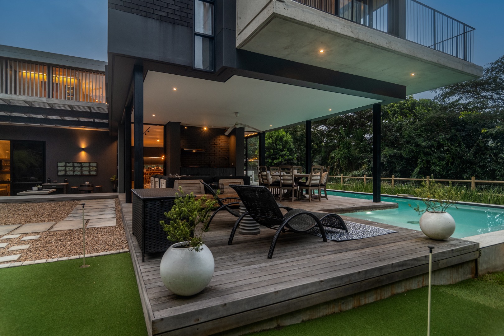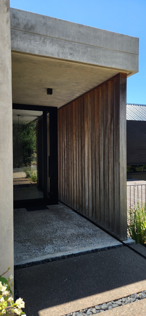This Designer home is a contemporary masterpiece. Polished concrete floors and a striking designer black kitchen with integrated appliances anchor the open-plan living spaces, complemented by electric blinds and seamless flow to the outdoors. Four luxurious bedrooms and four and a half bathrooms, finished with sleek black fixtures and walk-in showers, provide serene retreats. Beyond, a salt-chlorinated pool, expansive deck, built-in braai, pizza oven, fire pit, and putting green create an entertainer’s paradise set within lush, private gardens.