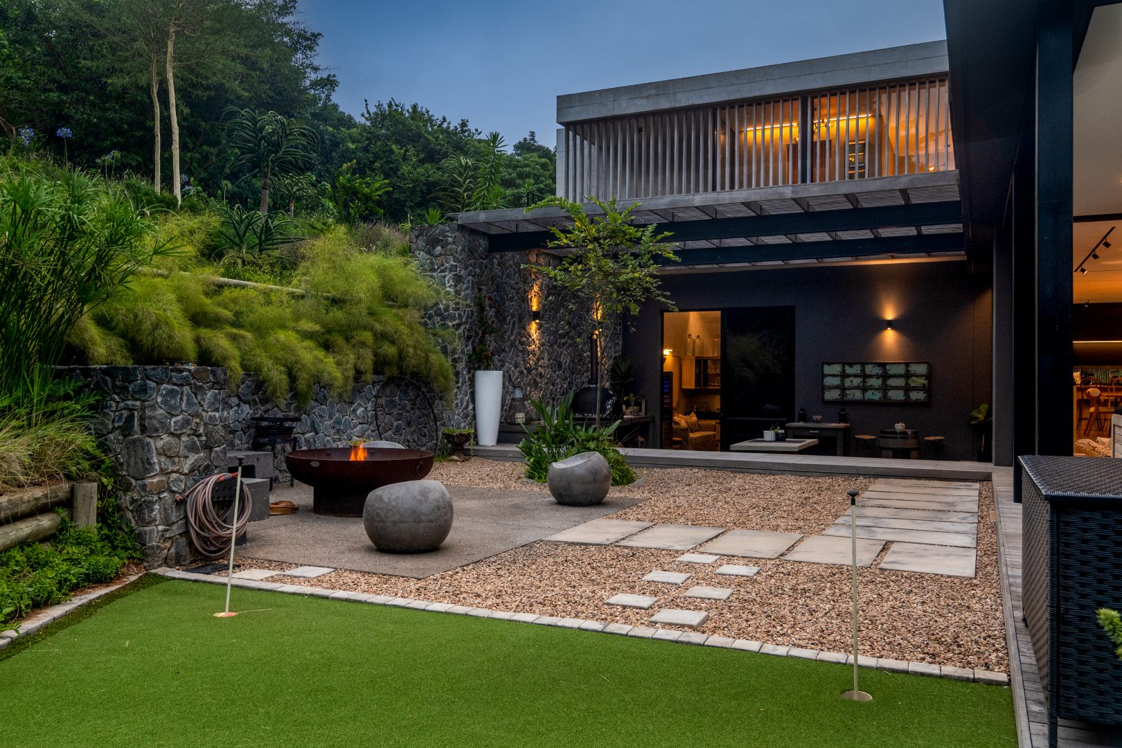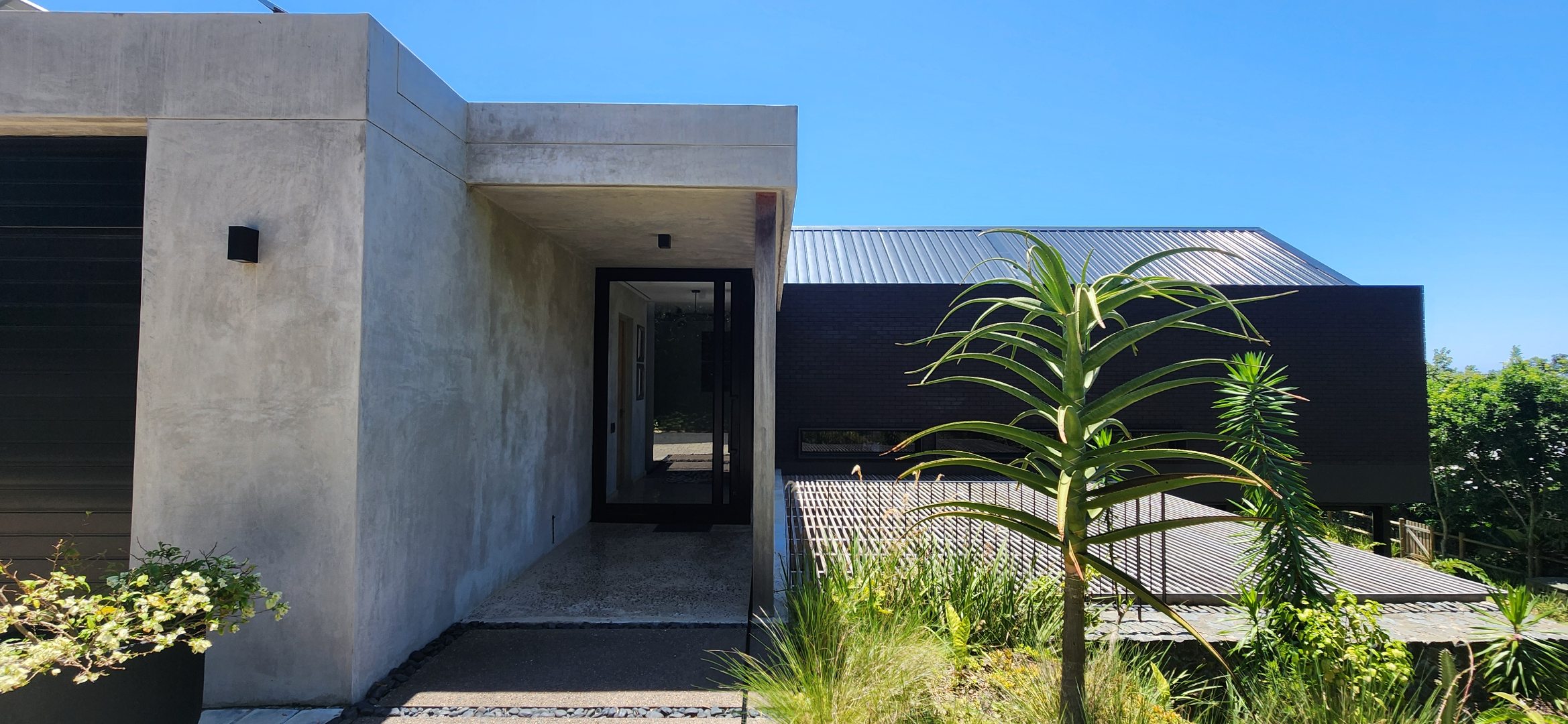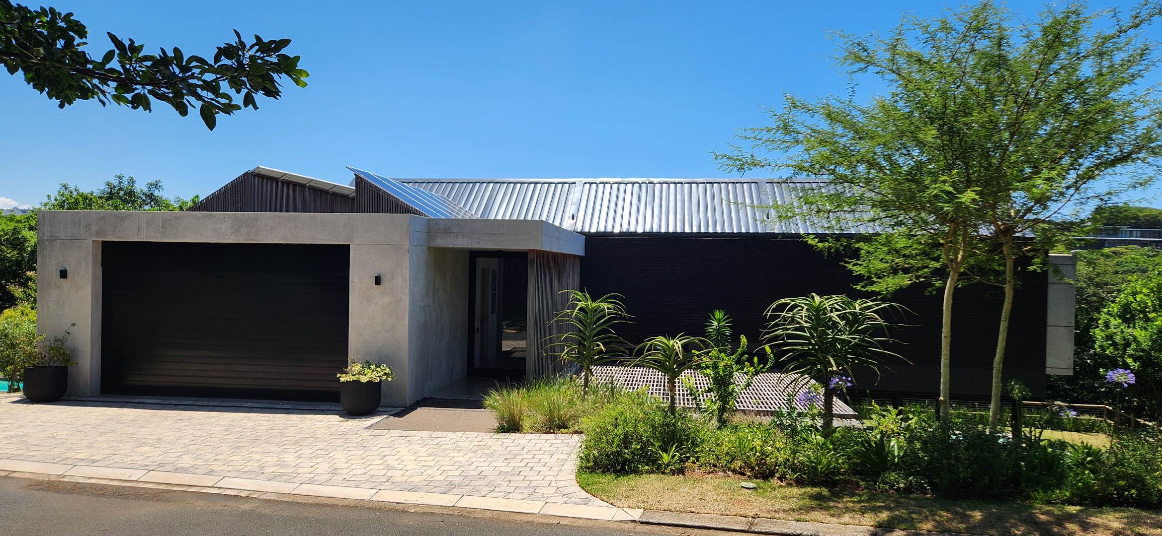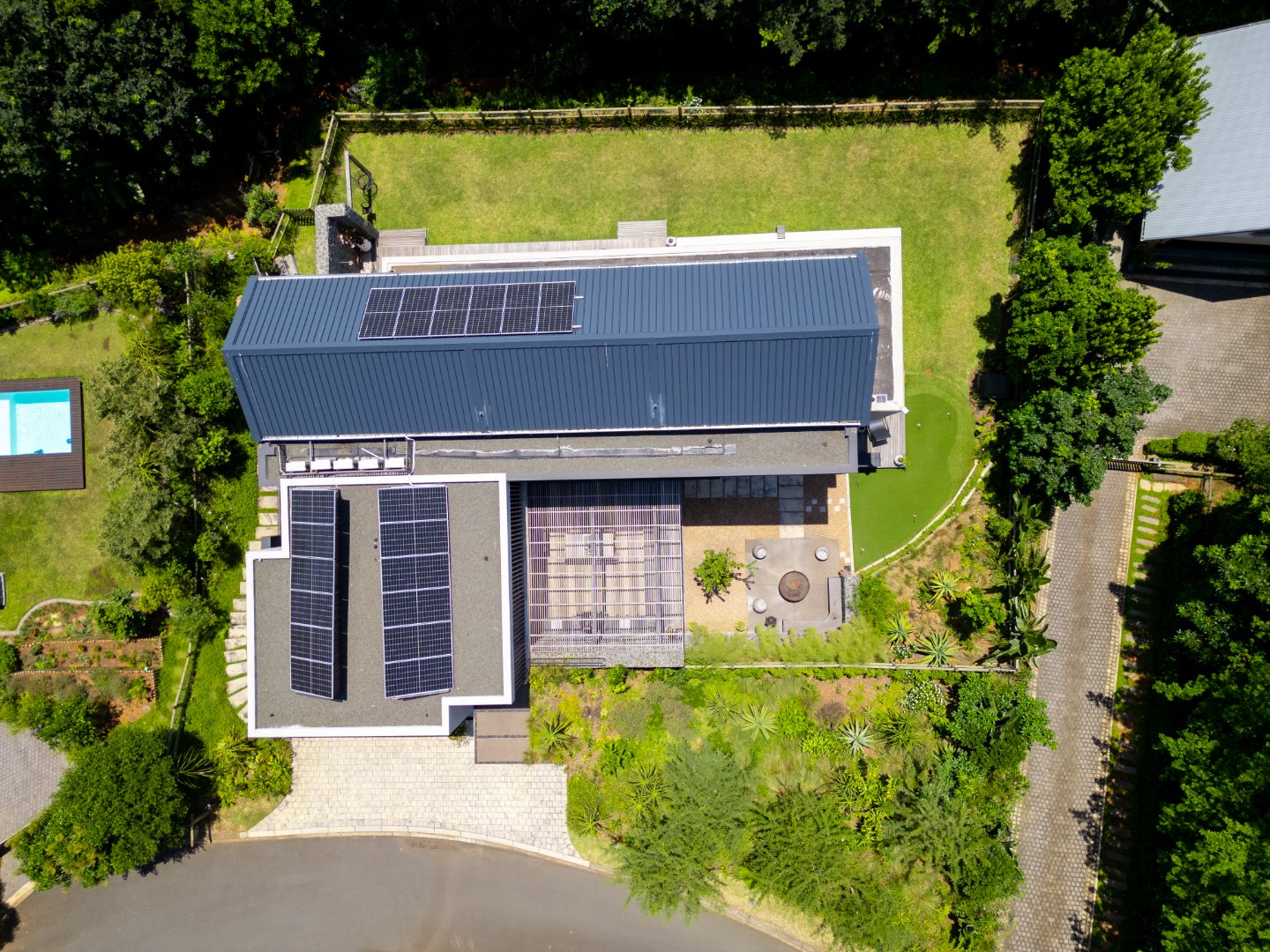 This Designer home is a contemporary masterpiece. Polished concrete floors and a striking designer black kitchen with integrated appliances anchor the open-plan living spaces, complemented by electric blinds and seamless flow to the outdoors. Four luxurious bedrooms and four and a half bathrooms, finished with sleek black fixtures and walk-in showers, provide serene retreats. Beyond, a salt-chlorinated pool, expansive deck, built-in braai, pizza oven, fire pit, and putting green create an entertainer’s paradise set within lush, private gardens.