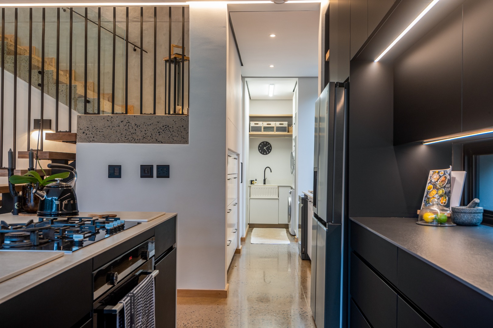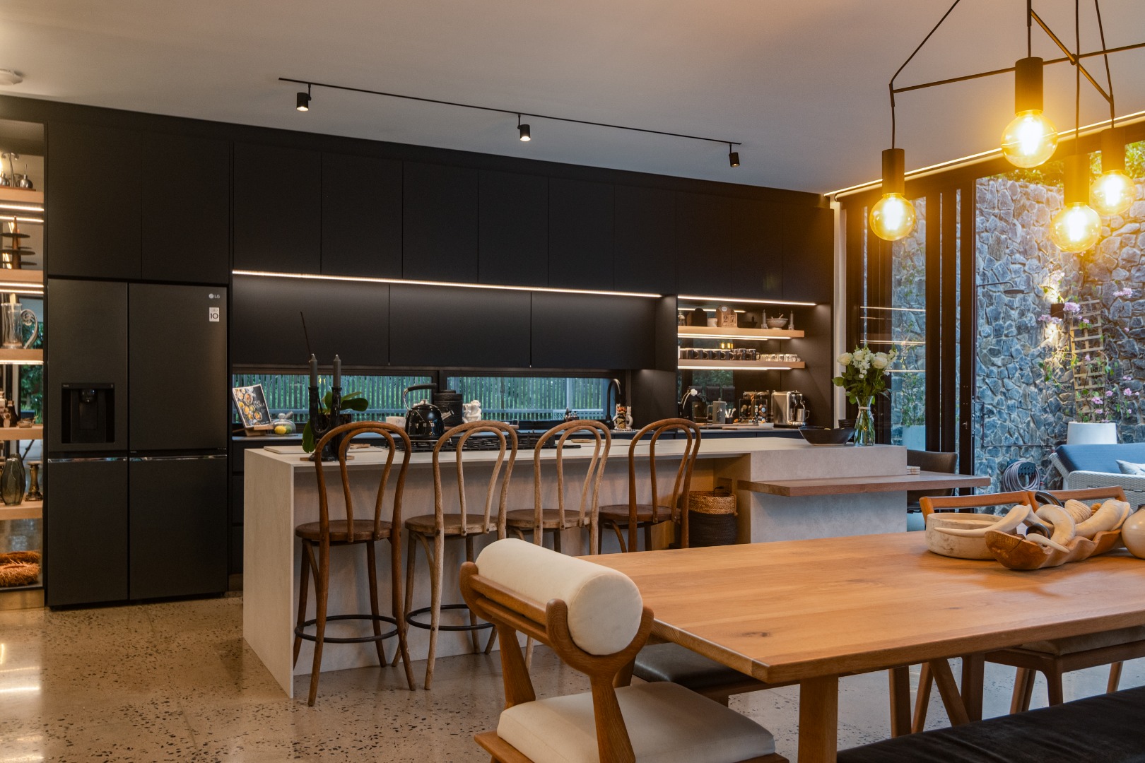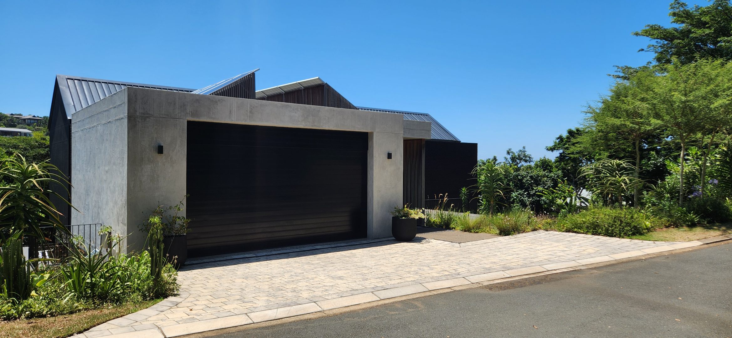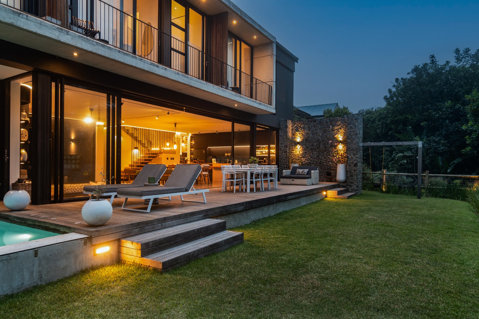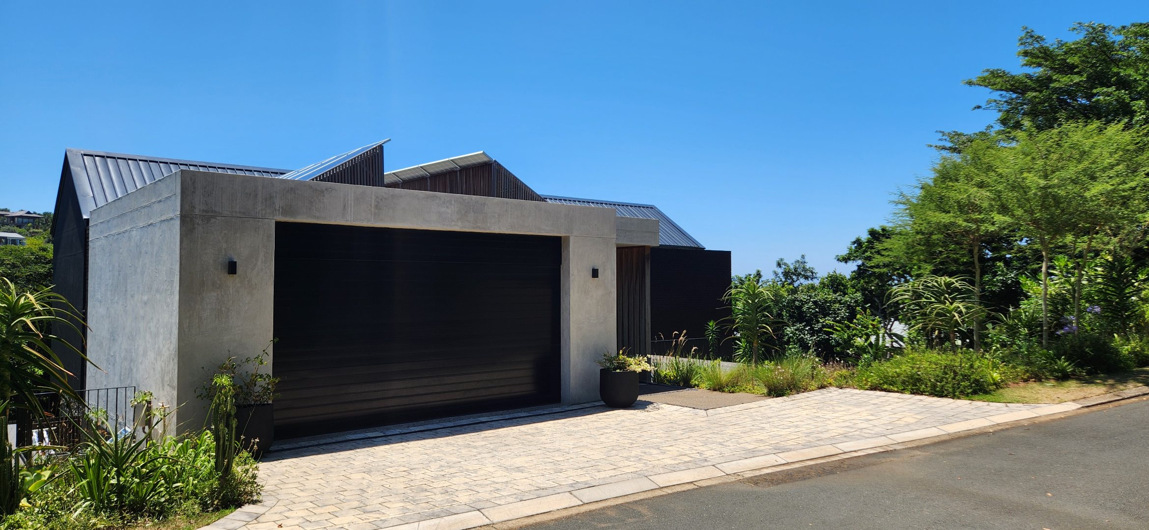 This Designer home is a contemporary masterpiece. Polished concrete floors and a striking designer black kitchen with integrated appliances anchor the open-plan living spaces, complemented by electric blinds and seamless flow to the outdoors. Four luxurious bedrooms and four and a half bathrooms, finished with sleek black fixtures and walk-in showers, provide serene retreats. Beyond, a salt-chlorinated pool, expansive deck, built-in braai, pizza oven, fire pit, and putting green create an entertainer’s paradise set within lush, private gardens.