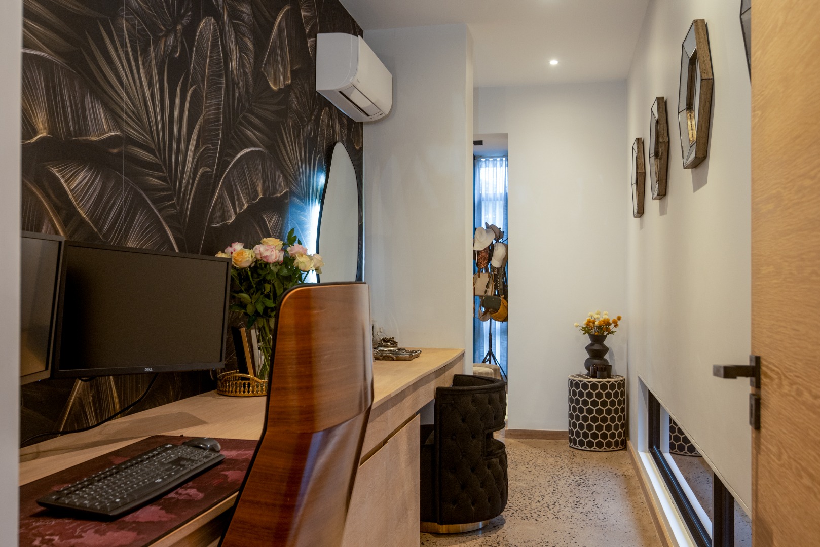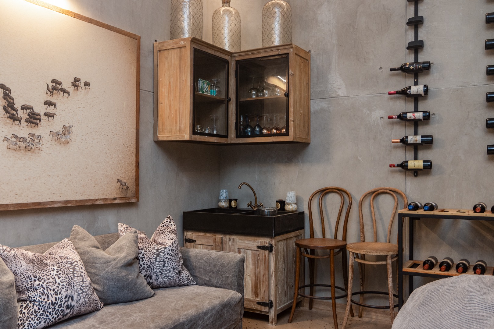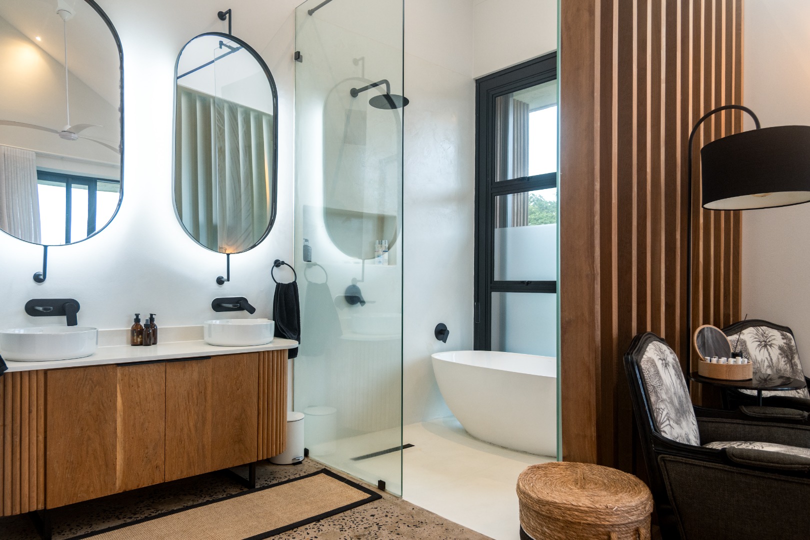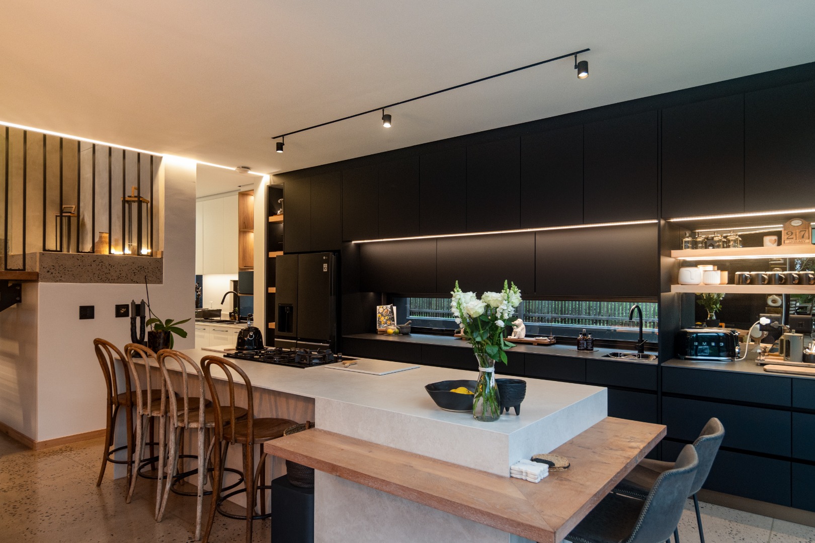 This Designer home is a contemporary masterpiece. Polished concrete floors and a striking designer black kitchen with integrated appliances anchor the open-plan living spaces, complemented by electric blinds and seamless flow to the outdoors. Four luxurious bedrooms and four and a half bathrooms, finished with sleek black fixtures and walk-in showers, provide serene retreats. Beyond, a salt-chlorinated pool, expansive deck, built-in braai, pizza oven, fire pit, and putting green create an entertainer’s paradise set within lush, private gardens.