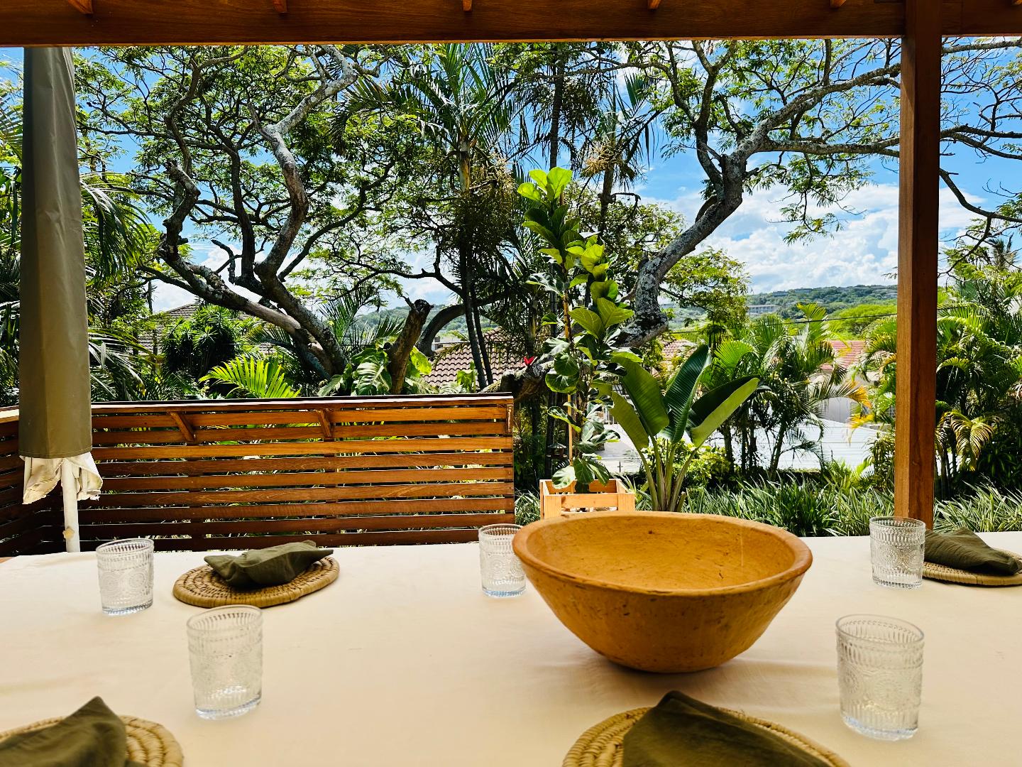 The outdoor entertainment area is a standout feature, offering a covered gazebo with a built-in gas braai and ample space for relaxed seating, ideal for entertaining family and friends year round. The garden is level, beautifully landscaped, and perfect for children and pets, with lush greenery and established trees adding privacy and charm.