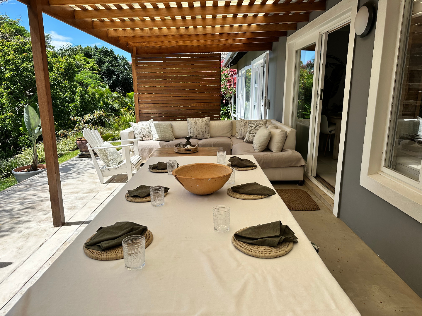 The living area opens out onto a covered patio, creating a natural connection between indoor and outdoor living.