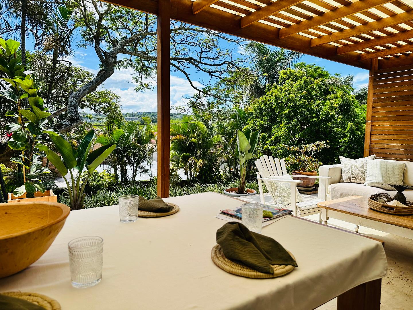 The outdoor entertainment area is a standout feature, offering a covered gazebo with a built-in gas braai and ample space for relaxed seating, ideal for entertaining family and friends year round. The garden is level, beautifully landscaped, and perfect for children and pets, with lush greenery and established trees adding privacy and charm.