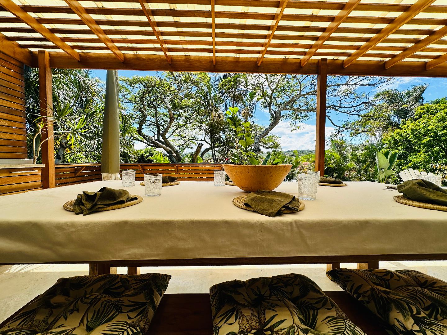 The living area opens out onto a covered patio, creating a natural connection between indoor and outdoor living.