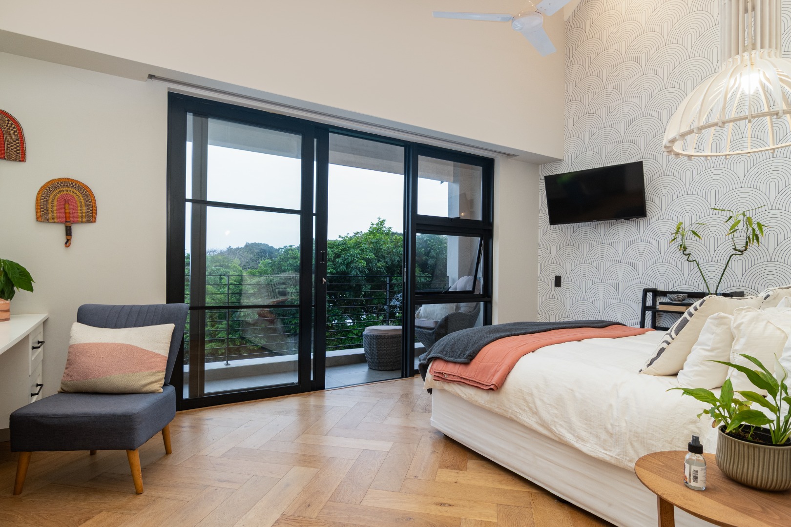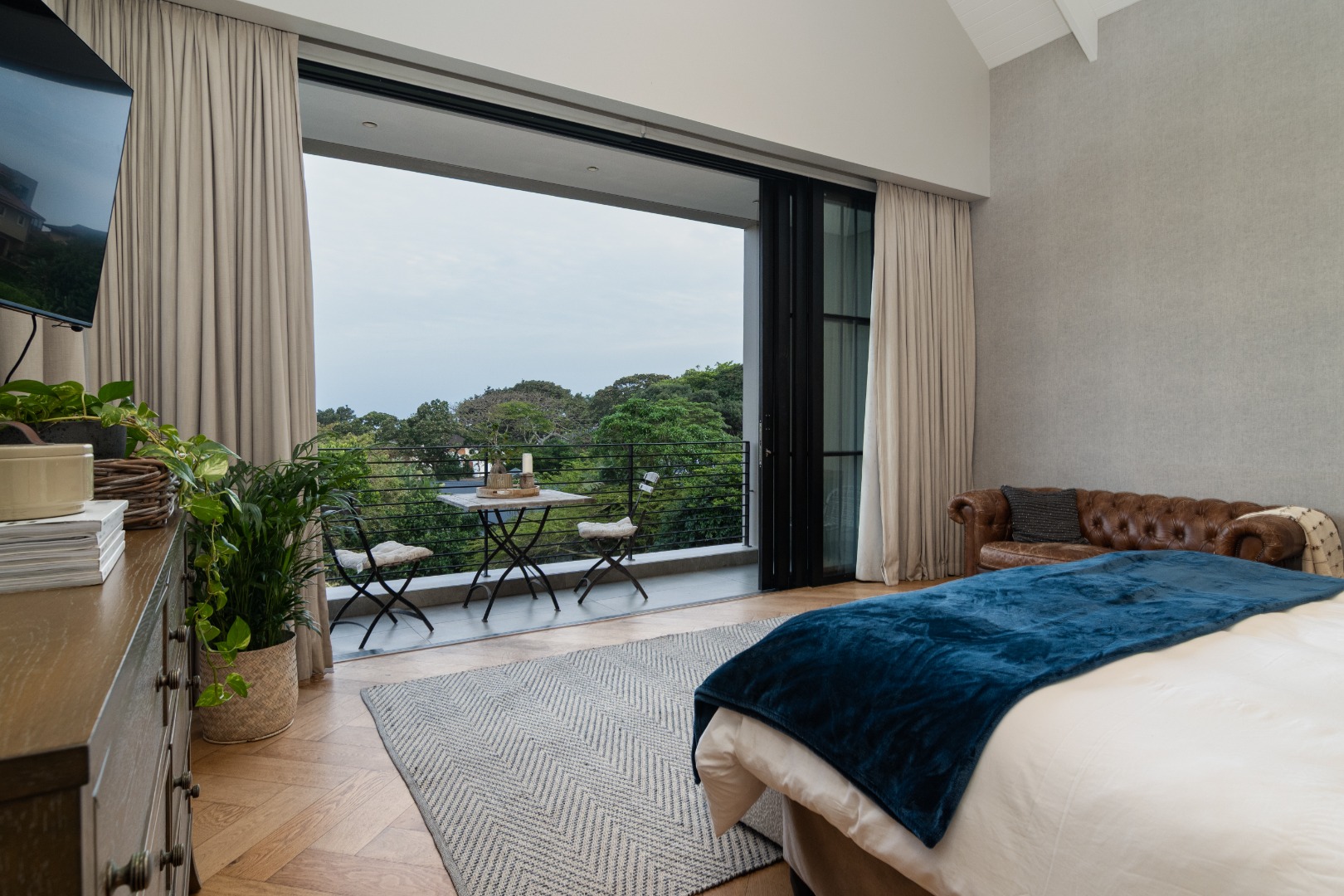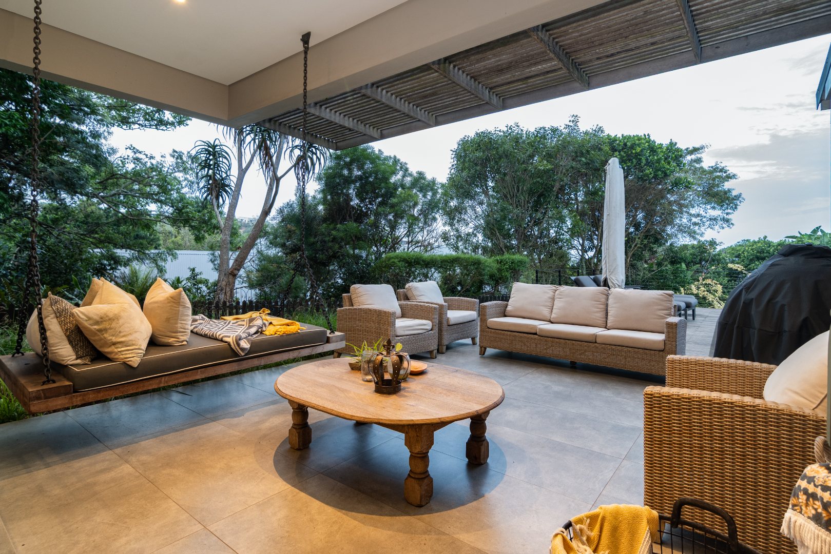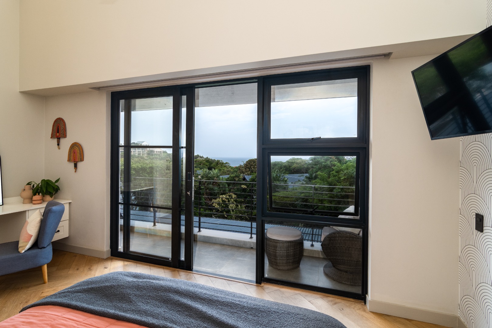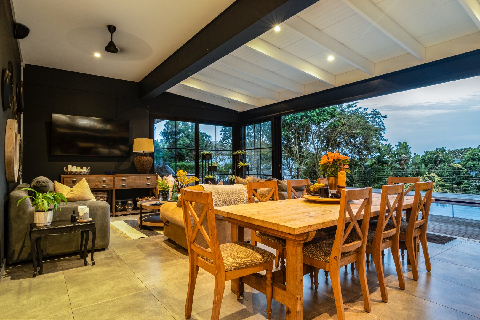 Perched within an exclusive security estate in the coveted coastal enclave of Sheffield Beach, Ballito, this magnificent 5-bedroom, 4.5-bathroom residence epitomises sophisticated seaside living. From its elevated position, on a double stand, the home commands breath-taking distant ocean views, framed by lush landscapes, offering a serene and private sanctuary. The modern architectural design, characterised by clean lines and expansive black-framed windows, creates an immediate sense of grandeur and seamlessly integrates the stunning natural surroundings.