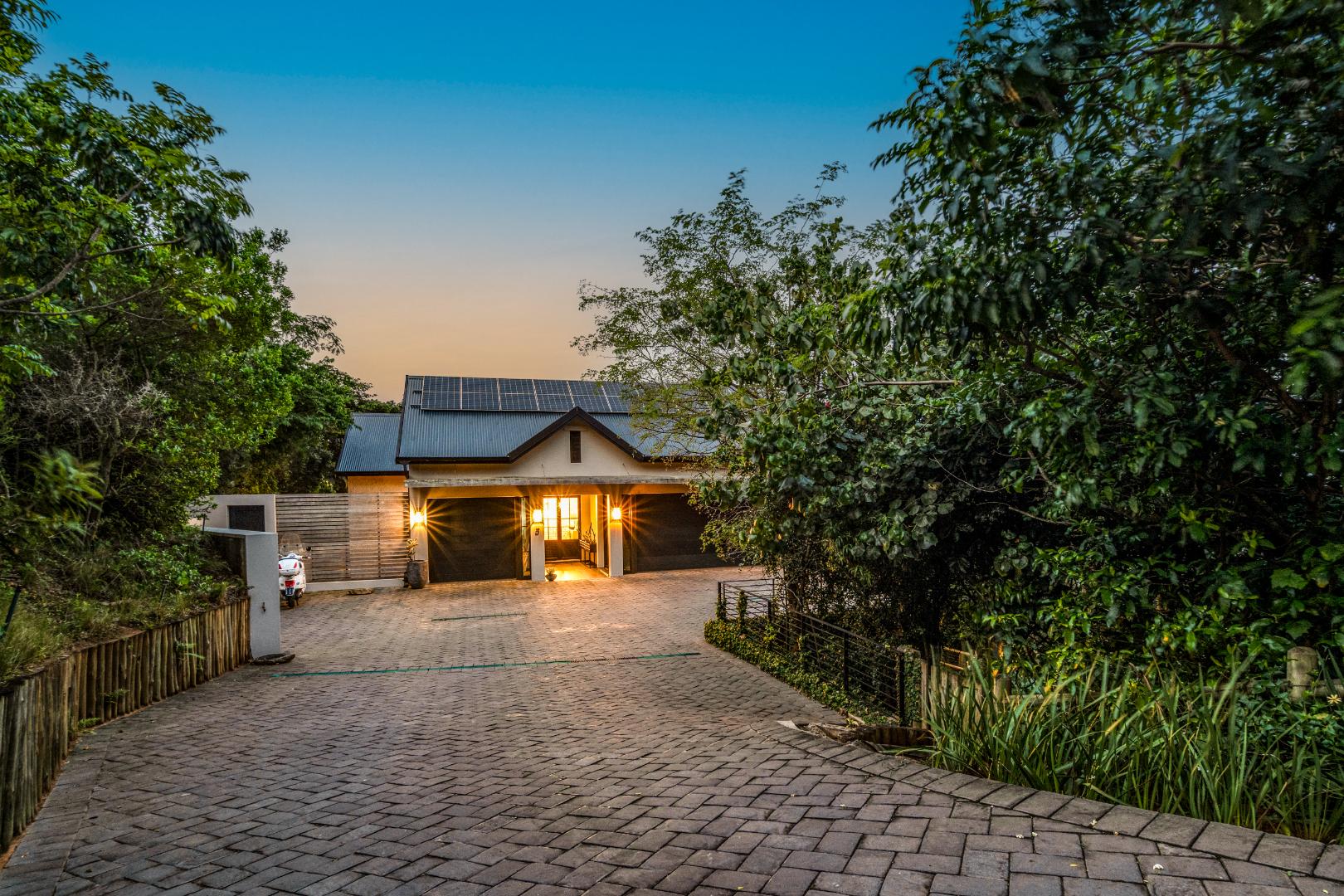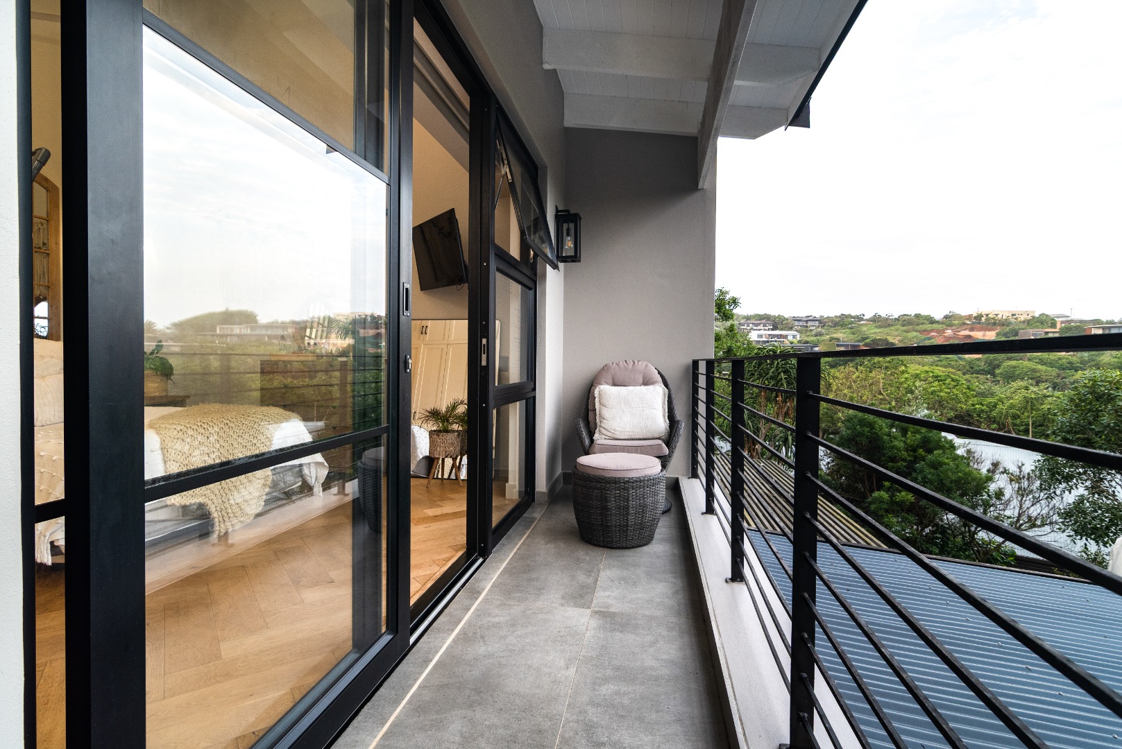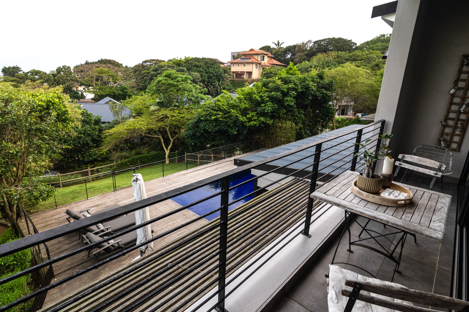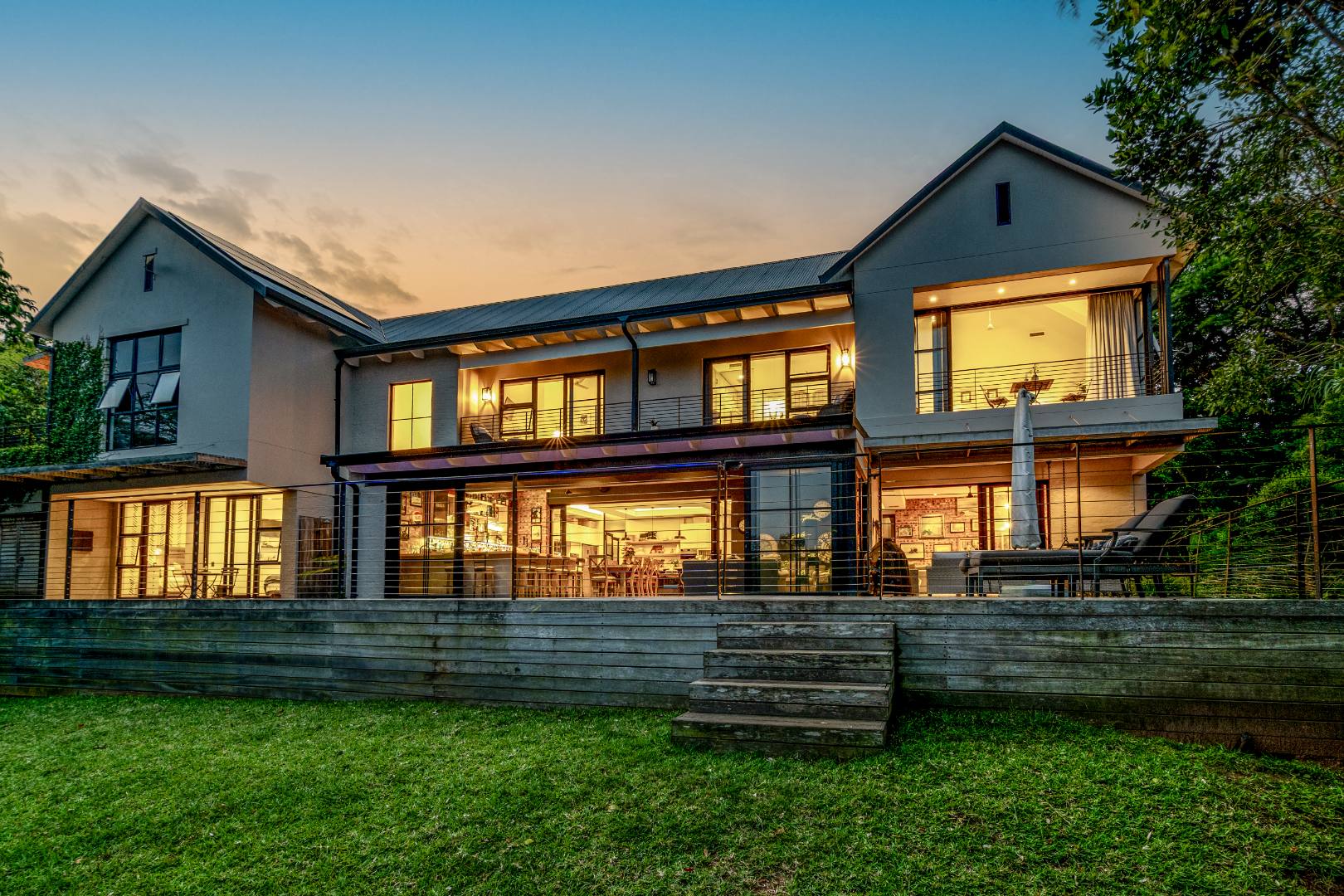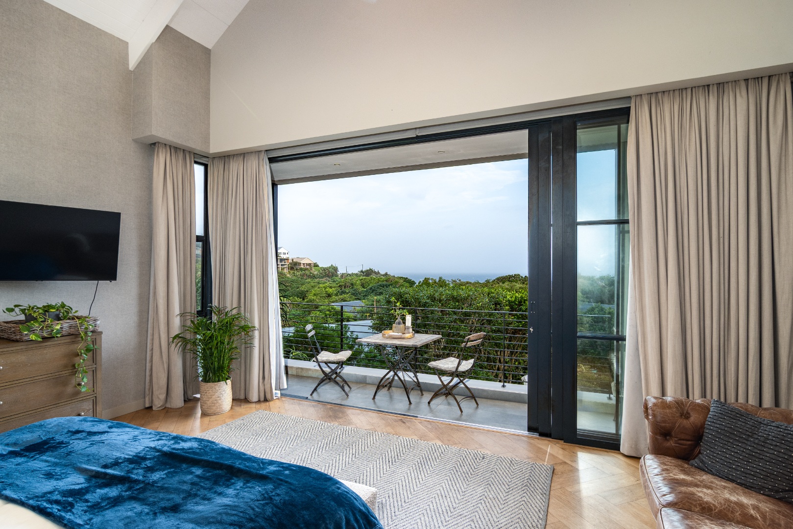 Perched within an exclusive security estate in the coveted coastal enclave of Sheffield Beach, Ballito, this magnificent 5-bedroom, 4.5-bathroom residence epitomises sophisticated seaside living. From its elevated position, on a double stand, the home commands breath-taking distant ocean views, framed by lush landscapes, offering a serene and private sanctuary. The modern architectural design, characterised by clean lines and expansive black-framed windows, creates an immediate sense of grandeur and seamlessly integrates the stunning natural surroundings.