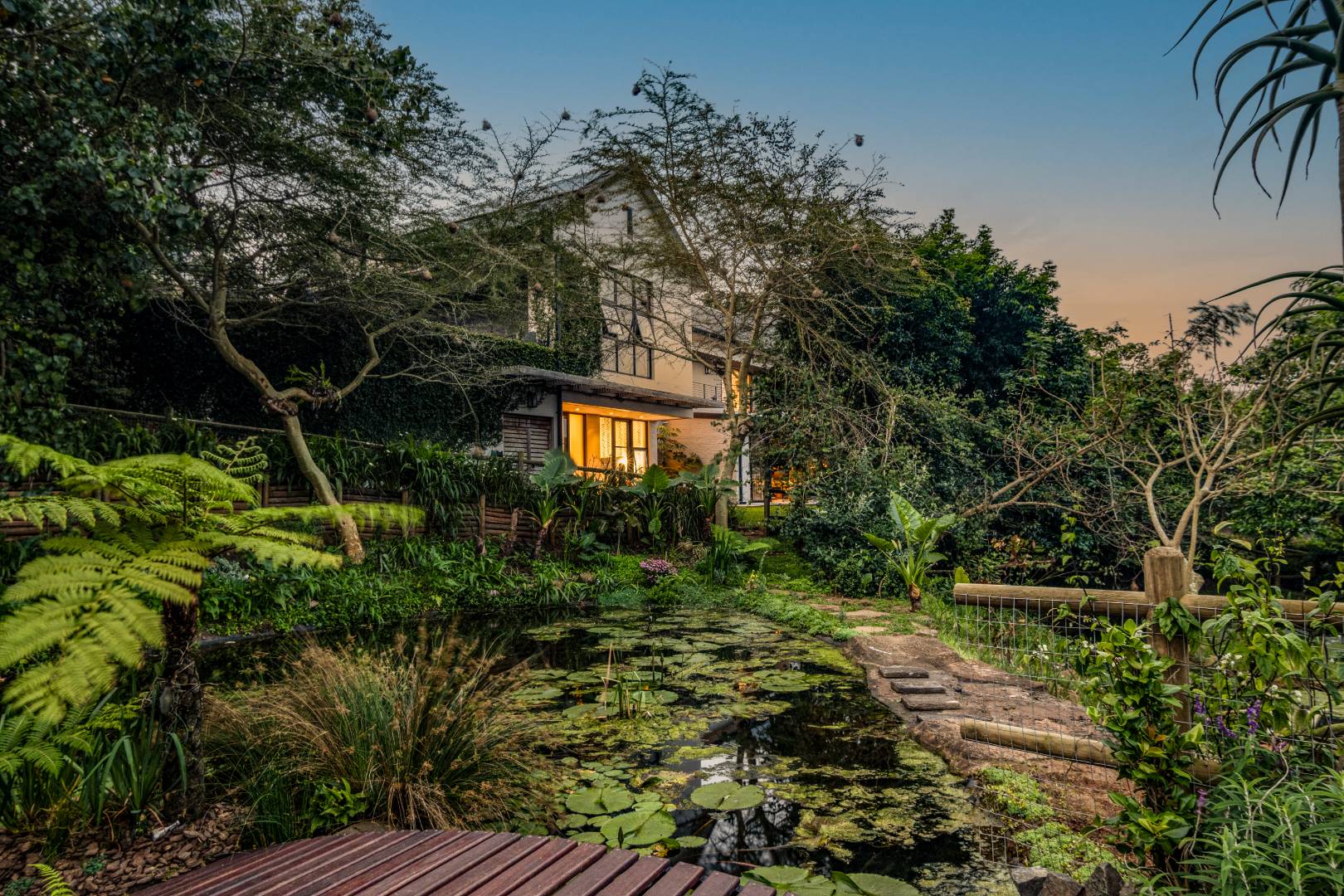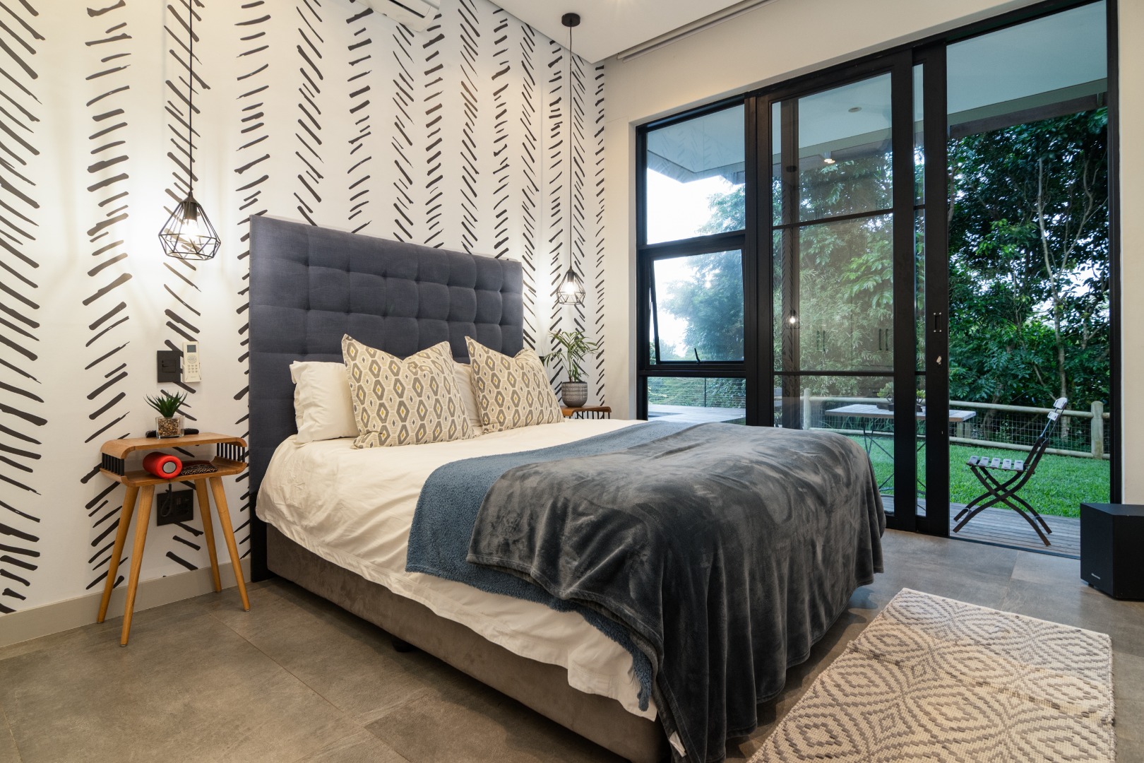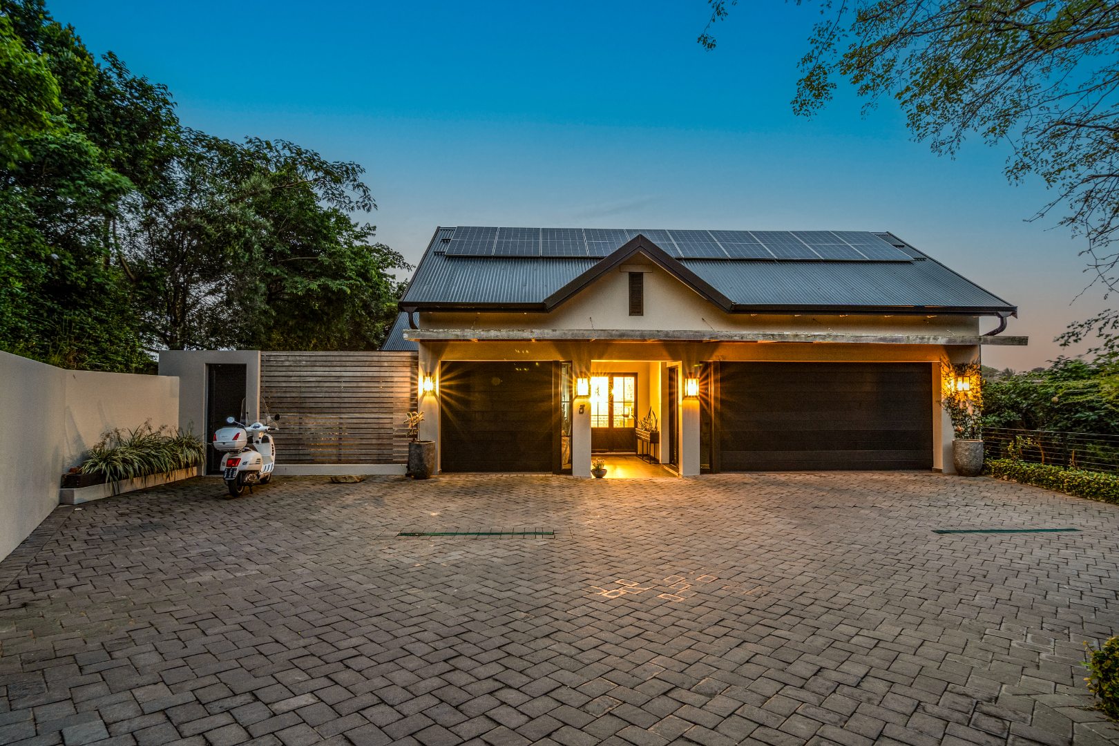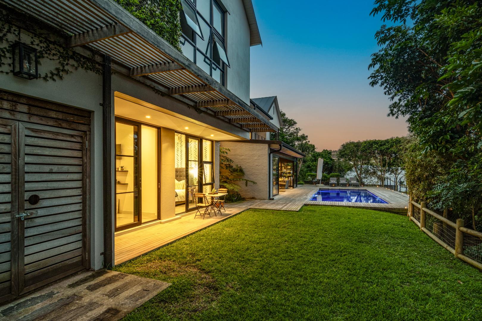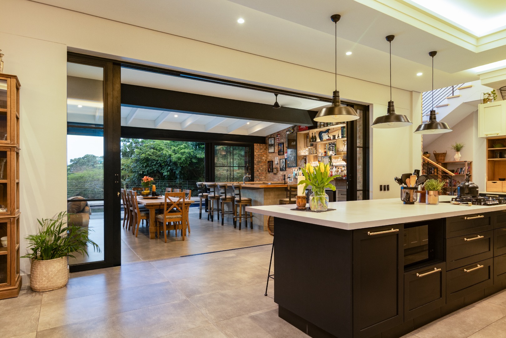 Perched within an exclusive security estate in the coveted coastal enclave of Sheffield Beach, Ballito, this magnificent 5-bedroom, 4.5-bathroom residence epitomises sophisticated seaside living. From its elevated position, on a double stand, the home commands breath-taking distant ocean views, framed by lush landscapes, offering a serene and private sanctuary. The modern architectural design, characterised by clean lines and expansive black-framed windows, creates an immediate sense of grandeur and seamlessly integrates the stunning natural surroundings.