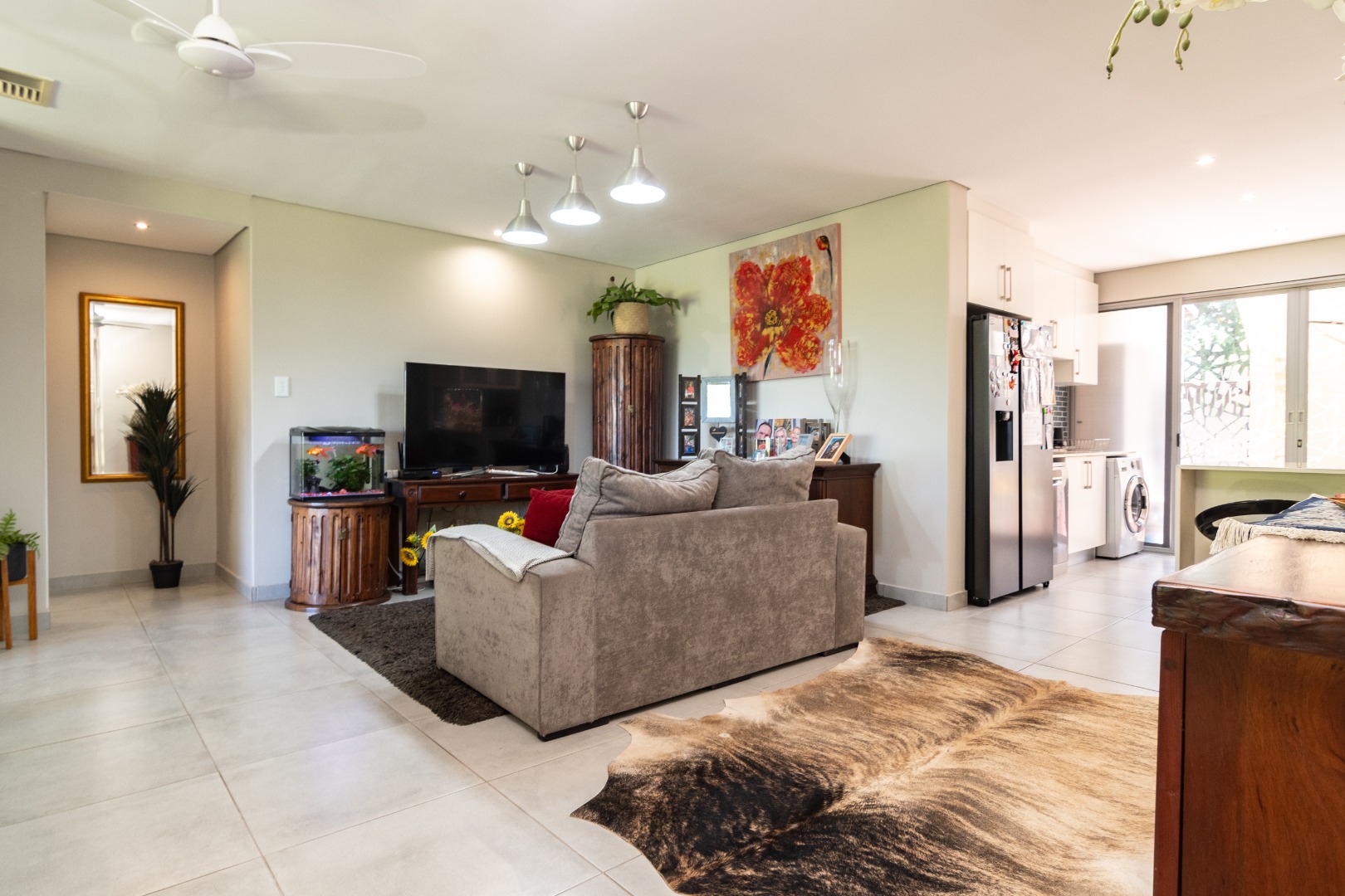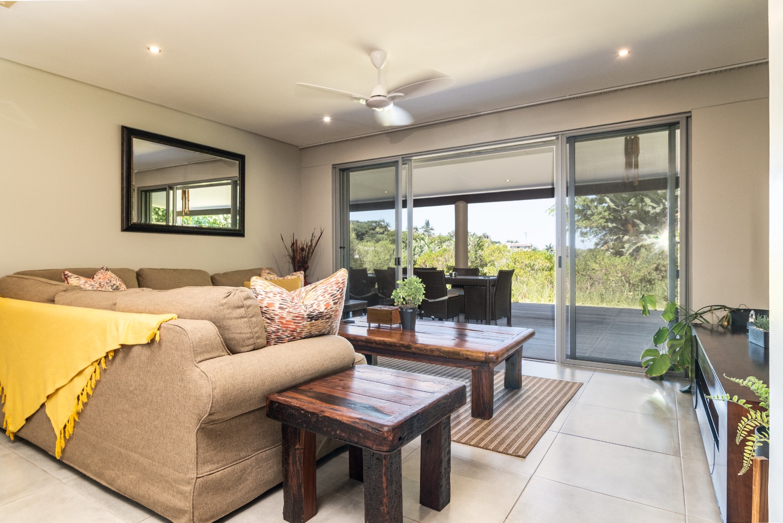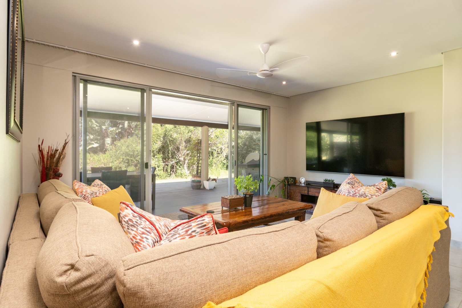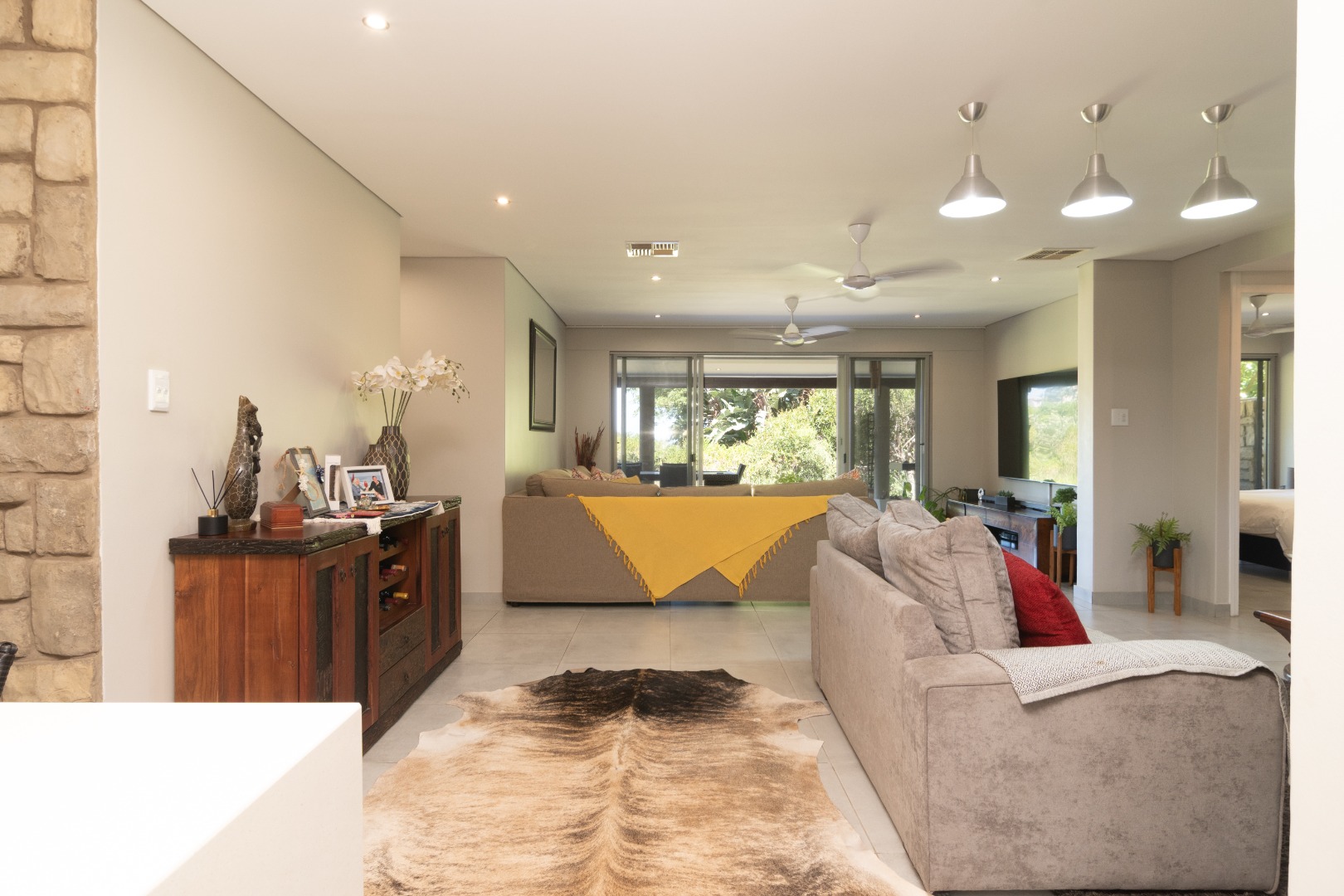 The interior has inviting open-plan layout, seamlessly connecting the living spaces. Large sliding glass doors flood the living room