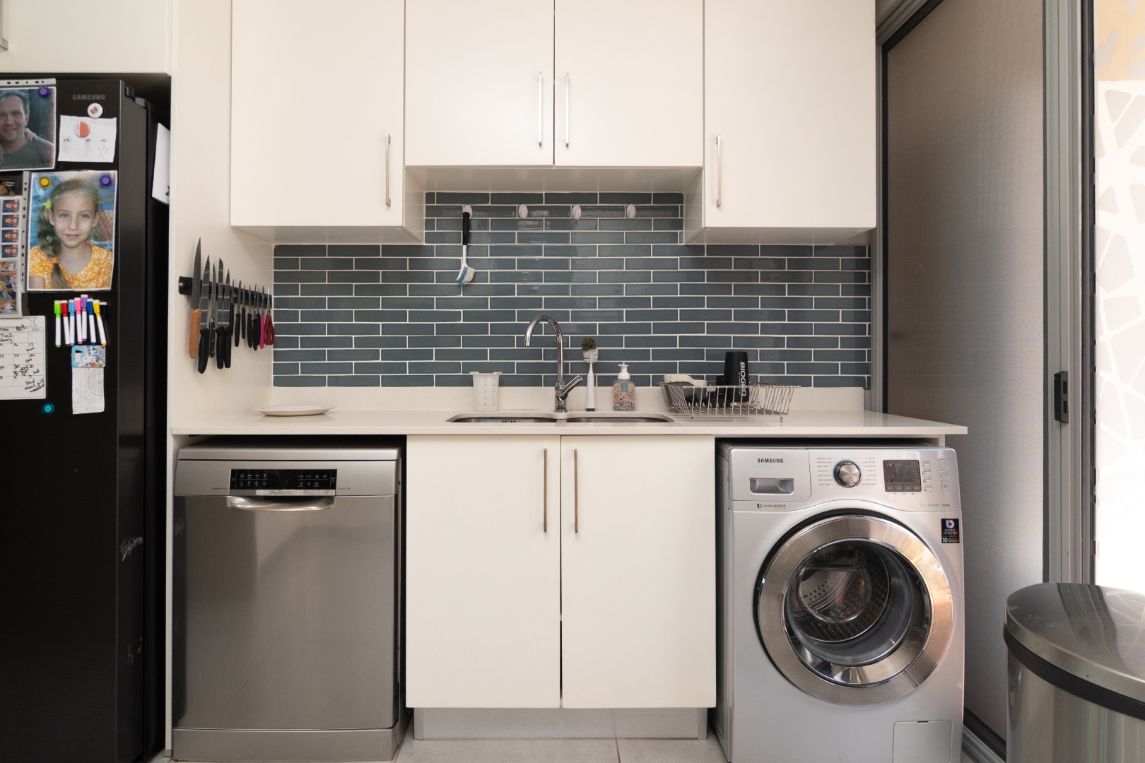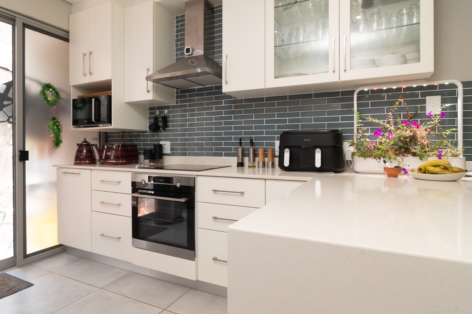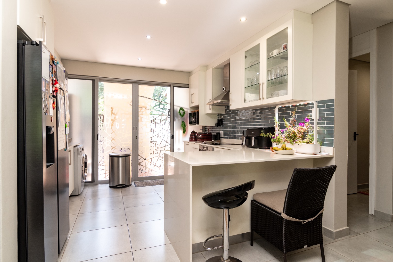 with natural light and provide direct access to the outdoor areas, enhancing the indoor-outdoor flow. The modern kitchen is equipped with sleek white cabinetry, light countertops, a stylish subway tile backsplash, and appliances including a ceran hob, undercounter oven and an extractor hood. The kitchen also features glass sliding doors complete with sliding insect screen door that opens out to a small courtyard. This access is large enough to make wheelchair entry to this apartment possible.