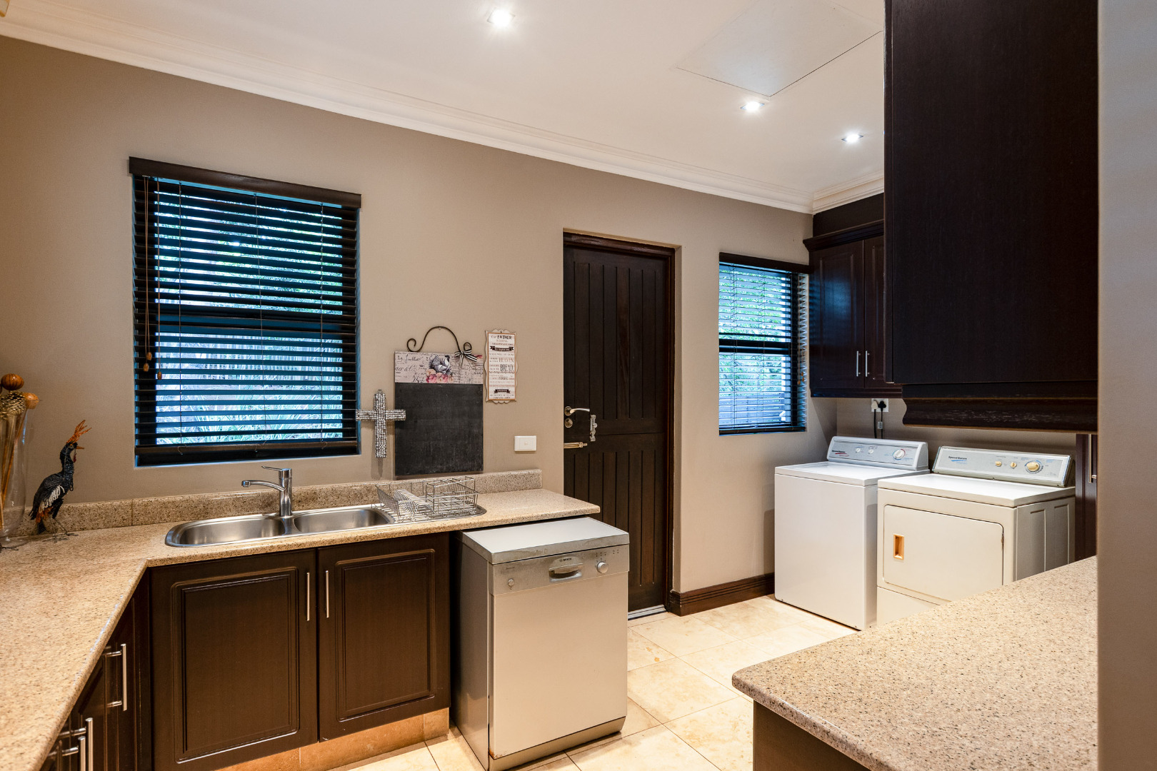 Downstairs, the home offers expansive open-plan living areas, a well-appointed kitchen, and excellent practicality with a triple garage, workshop space, and domestic ablutions. Two spacious bedrooms and two bathrooms are also located on this level, providing comfortable accommodation for family or guests.