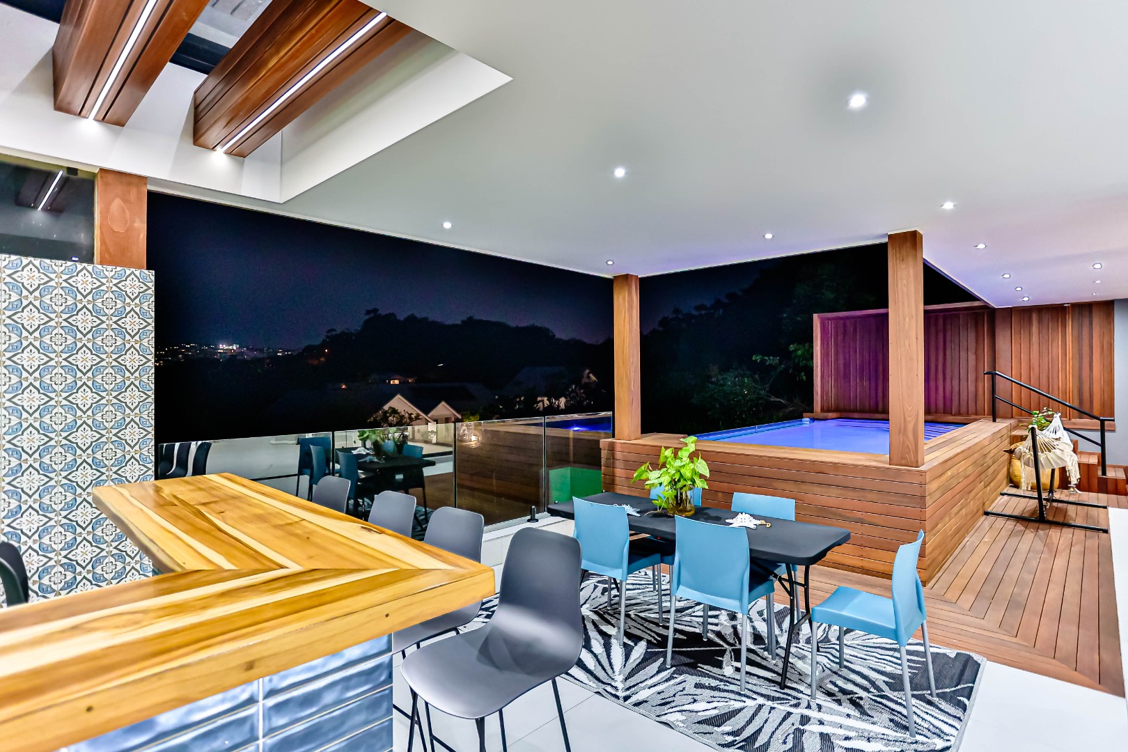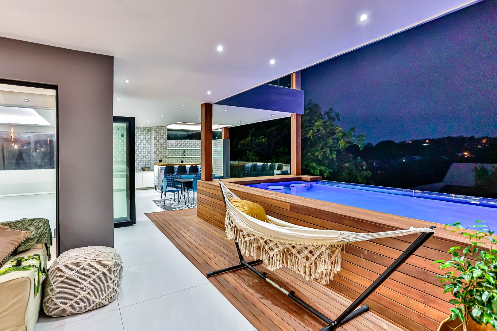 Accommodation comprises four spacious airconditioned bedrooms, each complemented by its own en-suite bathroom, totaling five bathrooms including a convenient guest toilet. Outside, the property truly shines with a private swimming pool, a large patio, and a deck, perfect for enjoying the South African climate. An integrated built-in braai and a luxurious jacuzzi further enhance the outdoor living experience. Practical features include three garages, four additional parking spaces, staff quarters, and a well-maintained garden, all within a pet-friendly environment.