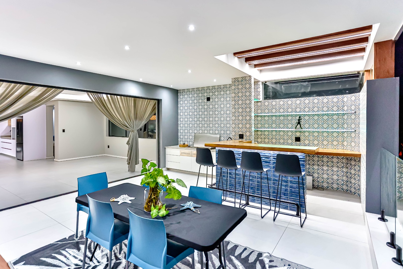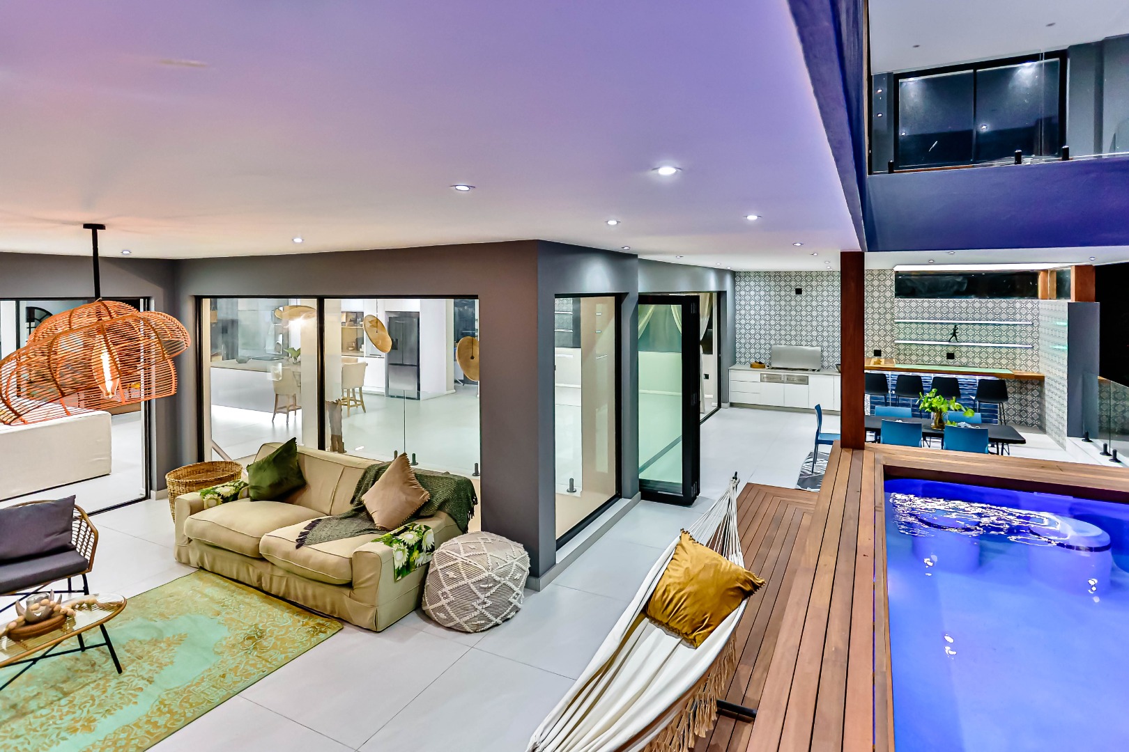 Spanning a generous 561 sqm floor size on an 884 sqm erf, this home boasts an inviting open-plan design, enhanced by sliding doors that promote seamless indoor-outdoor flow. The residence features a well-appointed kitchen with a scullery and pantry, a dedicated dining room, a comfortable lounge, an upstairs pyjama lounge and an additional family/TV room, providing ample space for relaxation and entertainment. A private study offers a quiet retreat for work or contemplation.