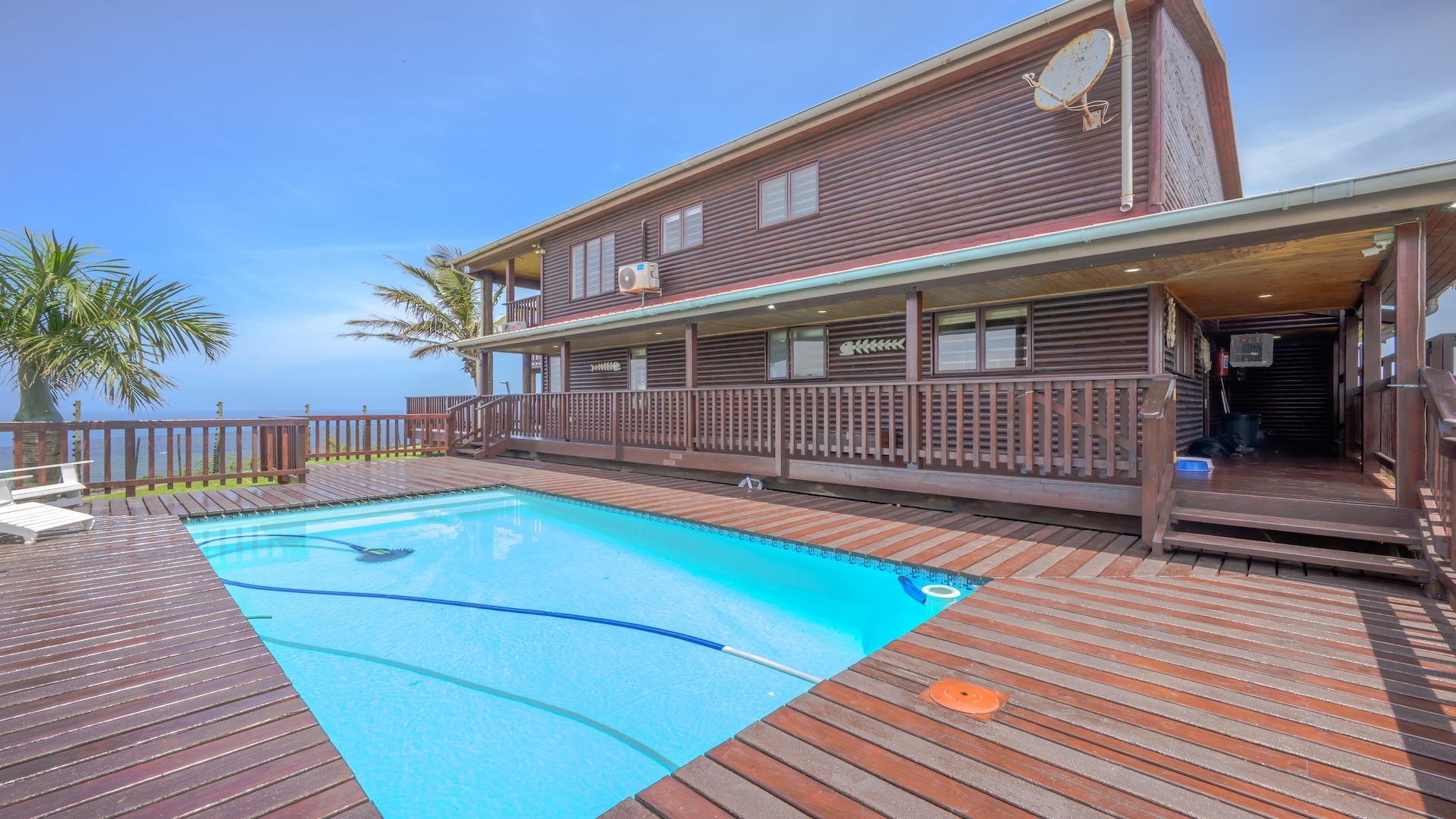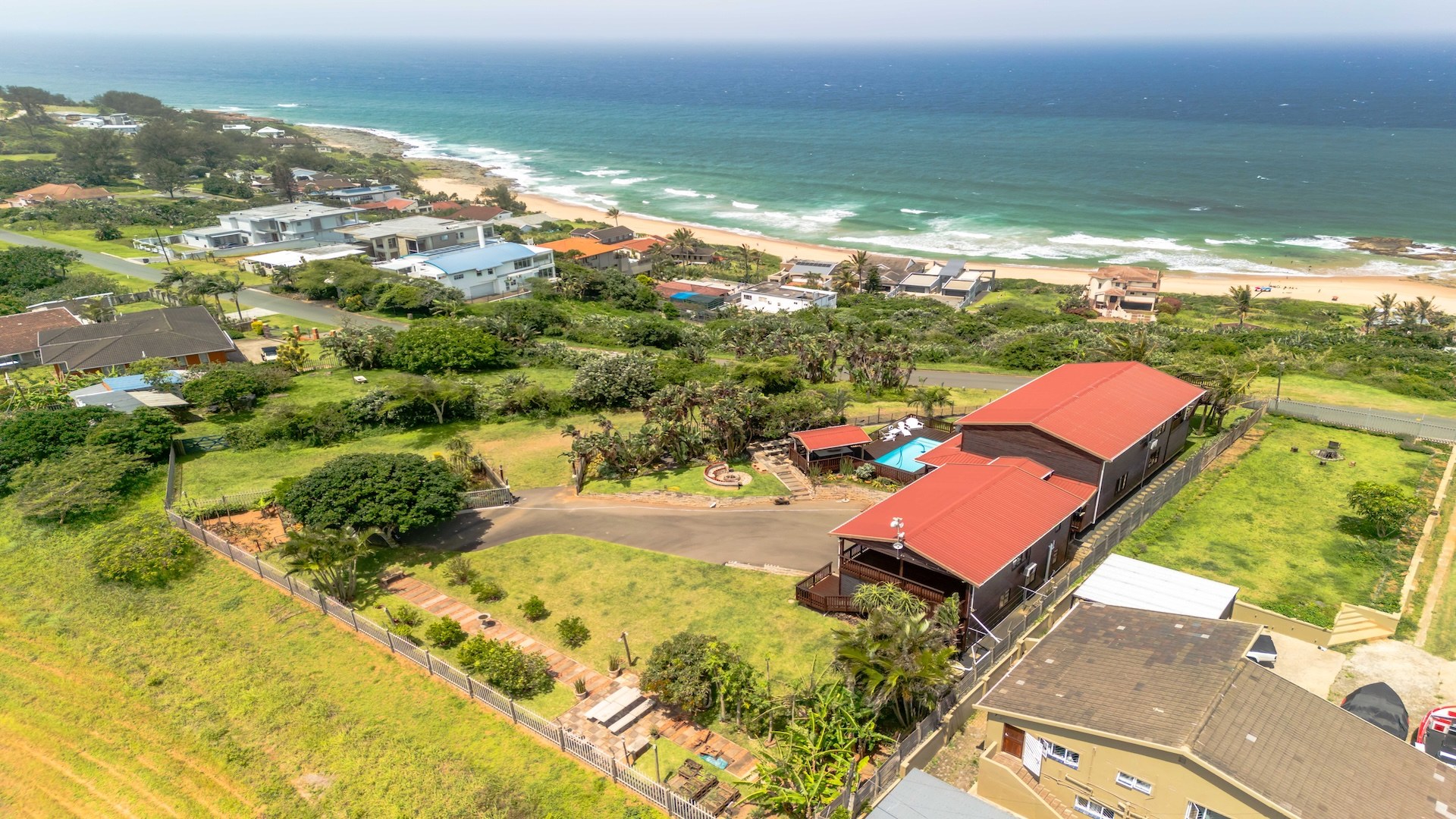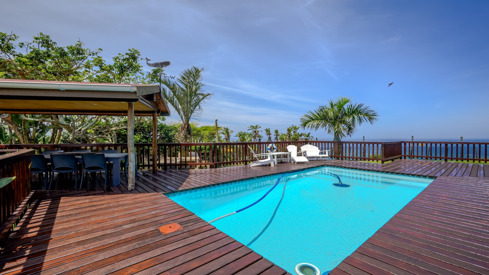 The outdoor area is designed for relaxed coastal living, complete with a sparkling