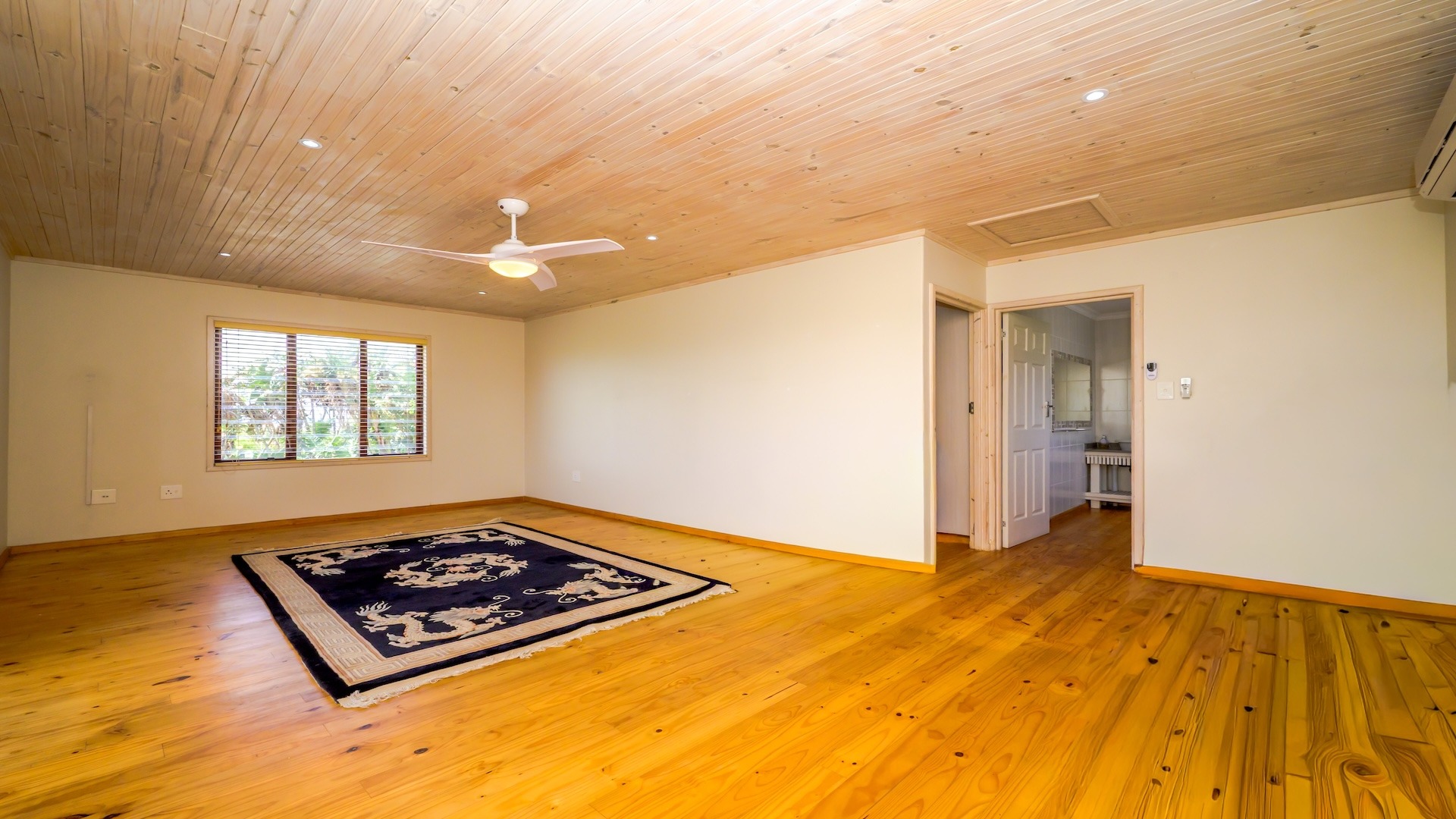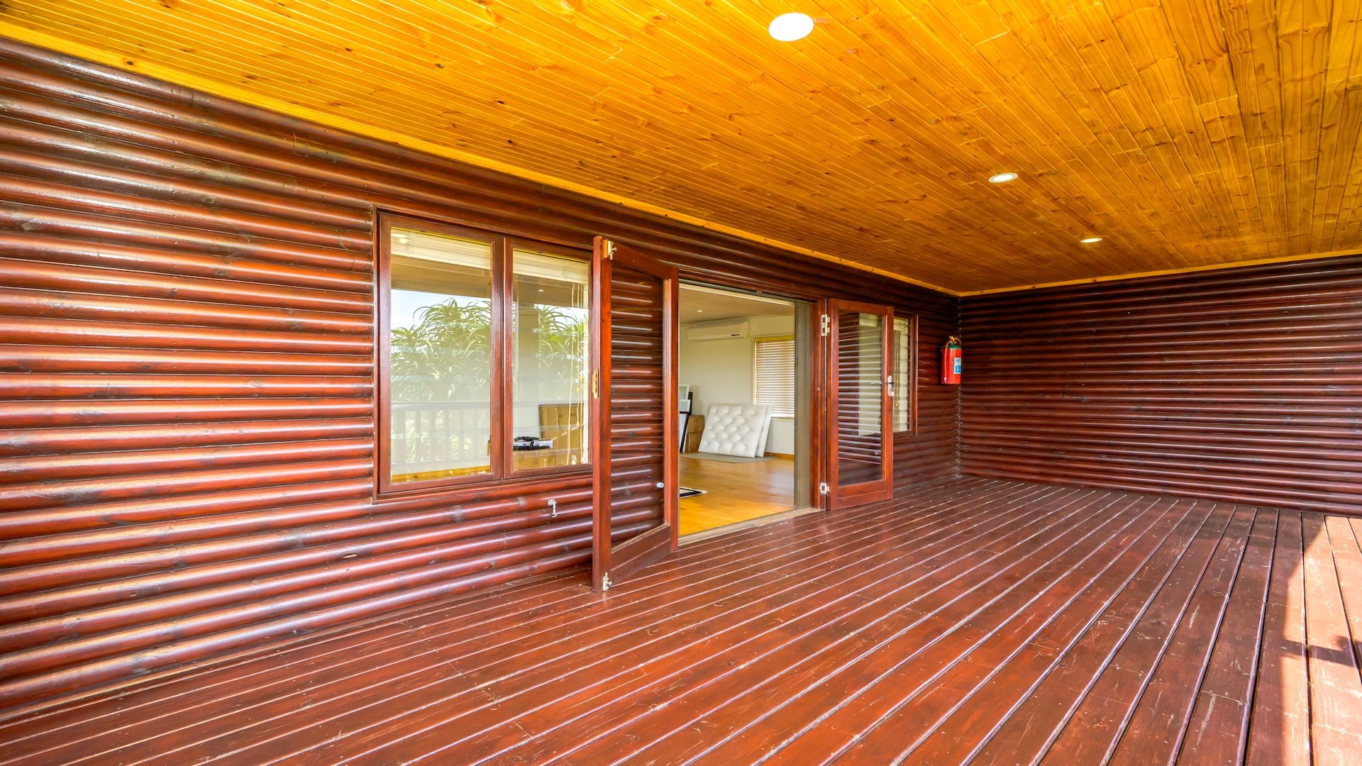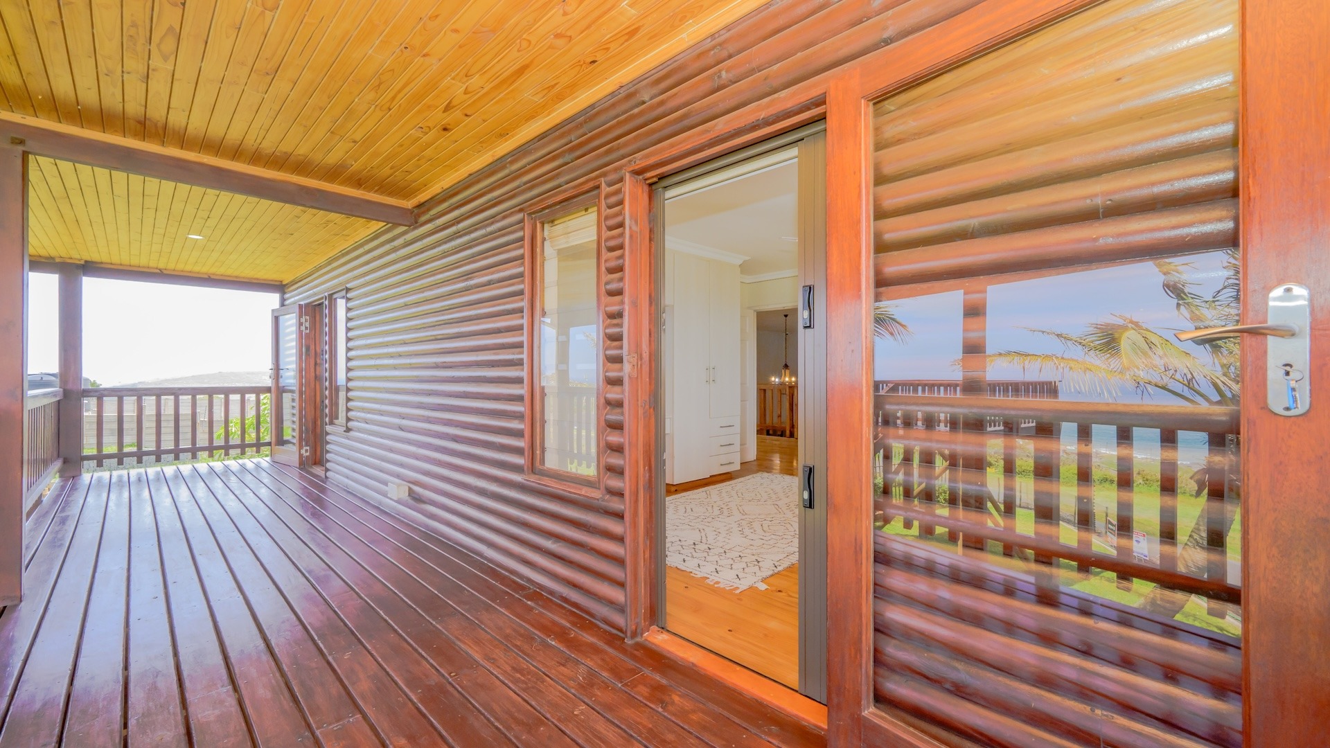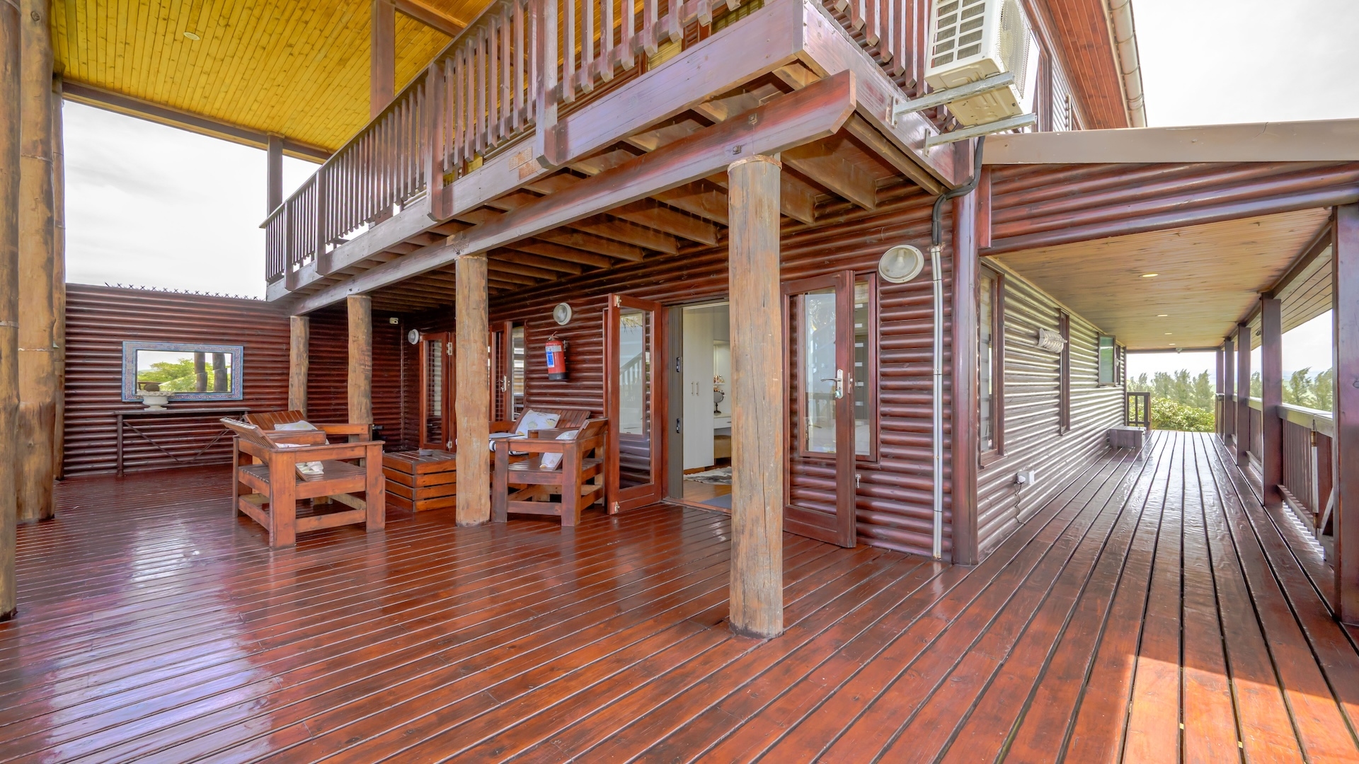 This unique log-cabin-style residence offers generous proportions and a spacious,