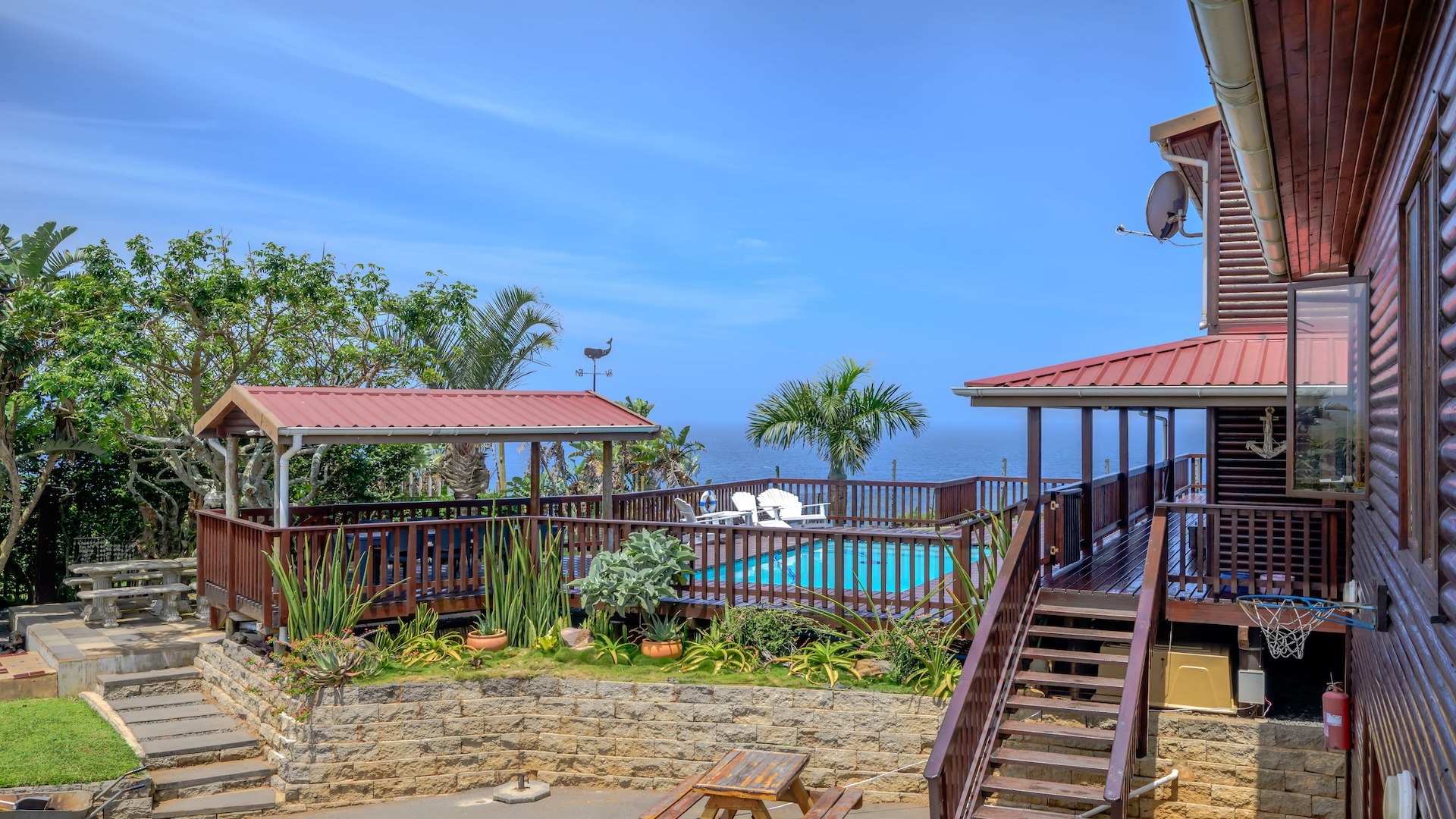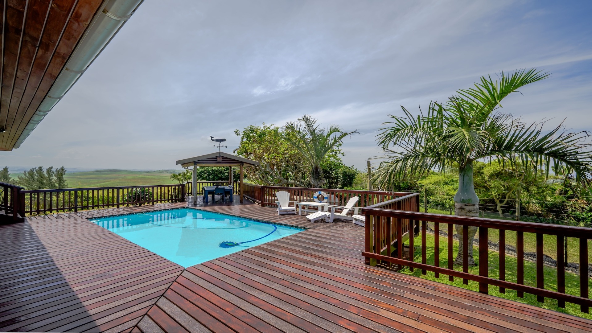 swimming pool wrapped in a wooden deck, a built-in braai, and a pizza oven for