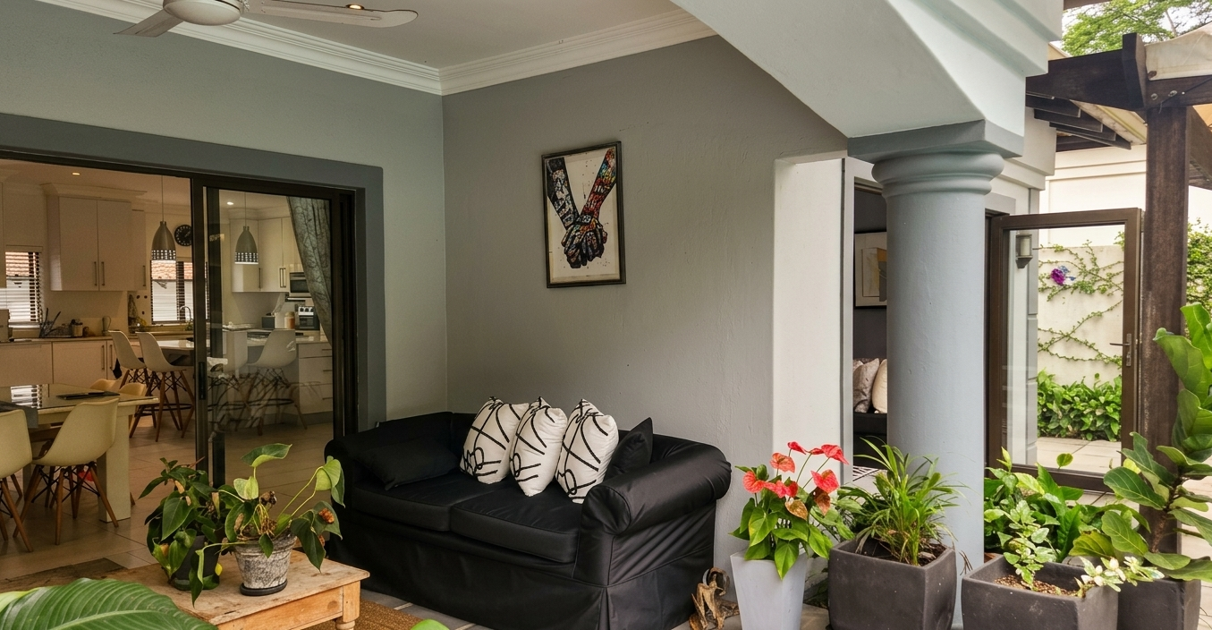 The interior exemplifies contemporary design with an open-plan configuration encompassing a luminous kitchen, dining area, and lounge space. The kitchen is appointed with extensive provisions, presenting a fresh, modern aesthetic, underscored by quality finishes. Expansive sliding doors seamlessly connect to a private outdoor sanctuary, featuring a wooden pergola ideal for al fresco dining. The tranquil garden, with mature greenery, provides a serene retreat, complemented by a built-in braai and a sparkling swimming pool.