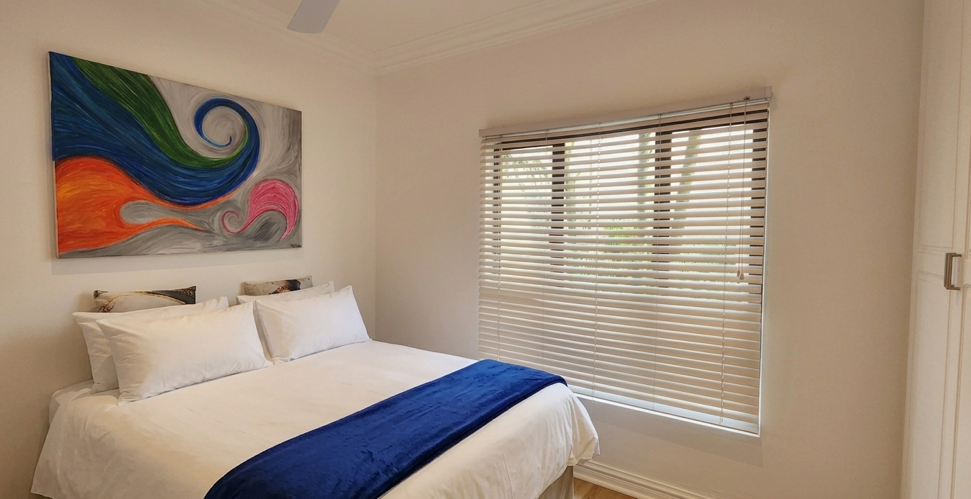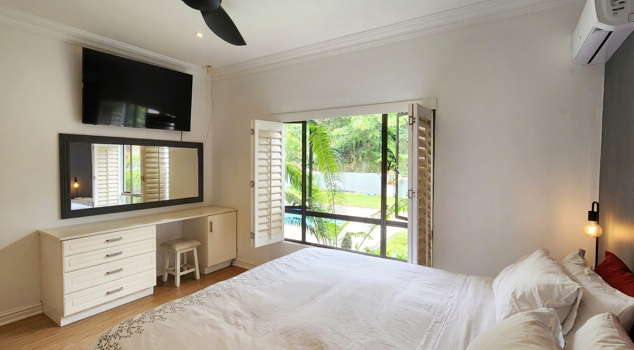 Accommodation comprises three well-proportioned bedrooms, each fitted with elegant wood-look flooring and integrated storage. Two bedrooms share a thoughtfully designed bathroom, equipped with both a bath and a shower. The principal suite, overlooking the verdant garden, boasts sophisticated white American shutters, a bespoke built-in dressing table, and a contemporary en-suite bathroom featuring a double shower. A discreetly located domestic toilet and shower facility are also provided. This move-in ready home within an amenity-rich estate invites discerning individuals to arrange a private viewing.